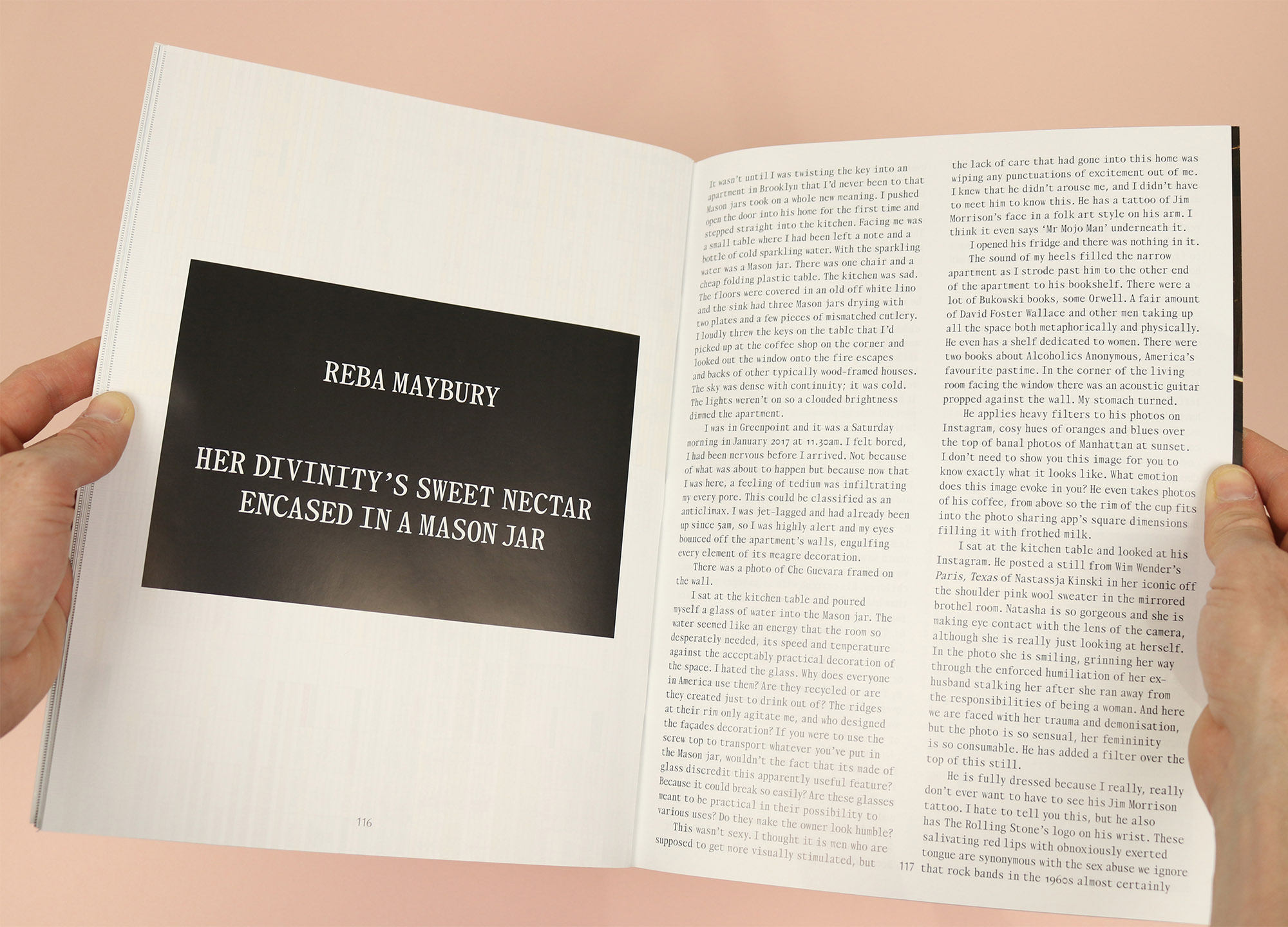 Or this piece by artist and political dominatrix Reba Maybury, who goes to visit a client in his apartment in Greenpoint and describes being disgusted and disheartened by his framed photo of Che Guevara, his ‘tasteful’ bookshelf and the mason jar that he left out for her to use as a glass: “Why does everyone in America use them?… The ridges at their rim only agitate me, and who designed the facade’s decoration?… Are these glasses meant to be practical in their possibility to various uses? Do they make the owner look humble? This wasn’t sexy.”