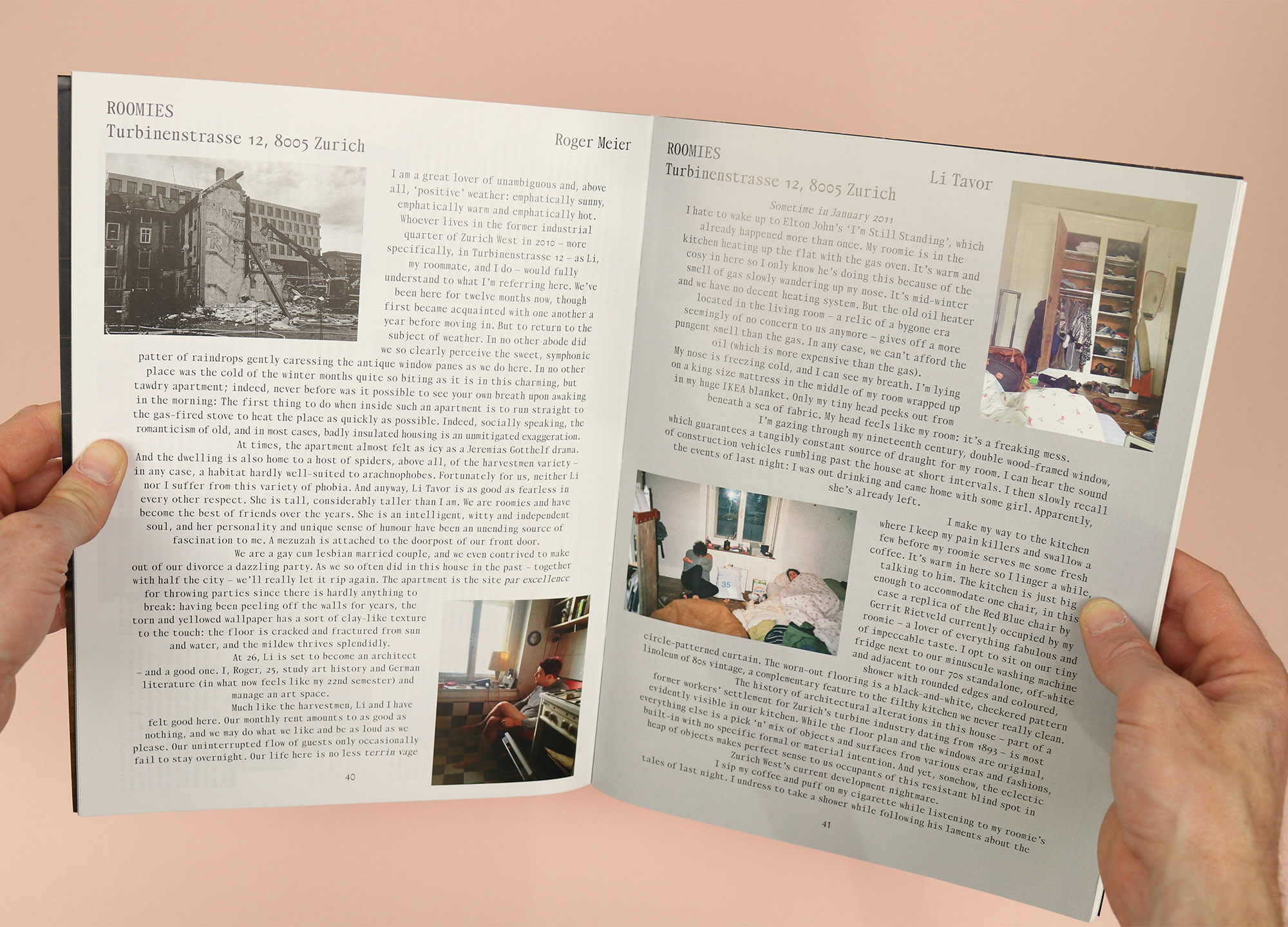 This same idea runs through the magazine, for example in Roomies, in which flatmates Roger Meier and Li Tavor wax lyrical about their freezing Zurich apartment: “In no other abode did we so clearly perceive the sweet, symphonic patter of raindrops gently caressing the antique window panes as we do here. In no other place was the cold of the winter months quite so biting as it is in this charming, but tawdry apartment…”