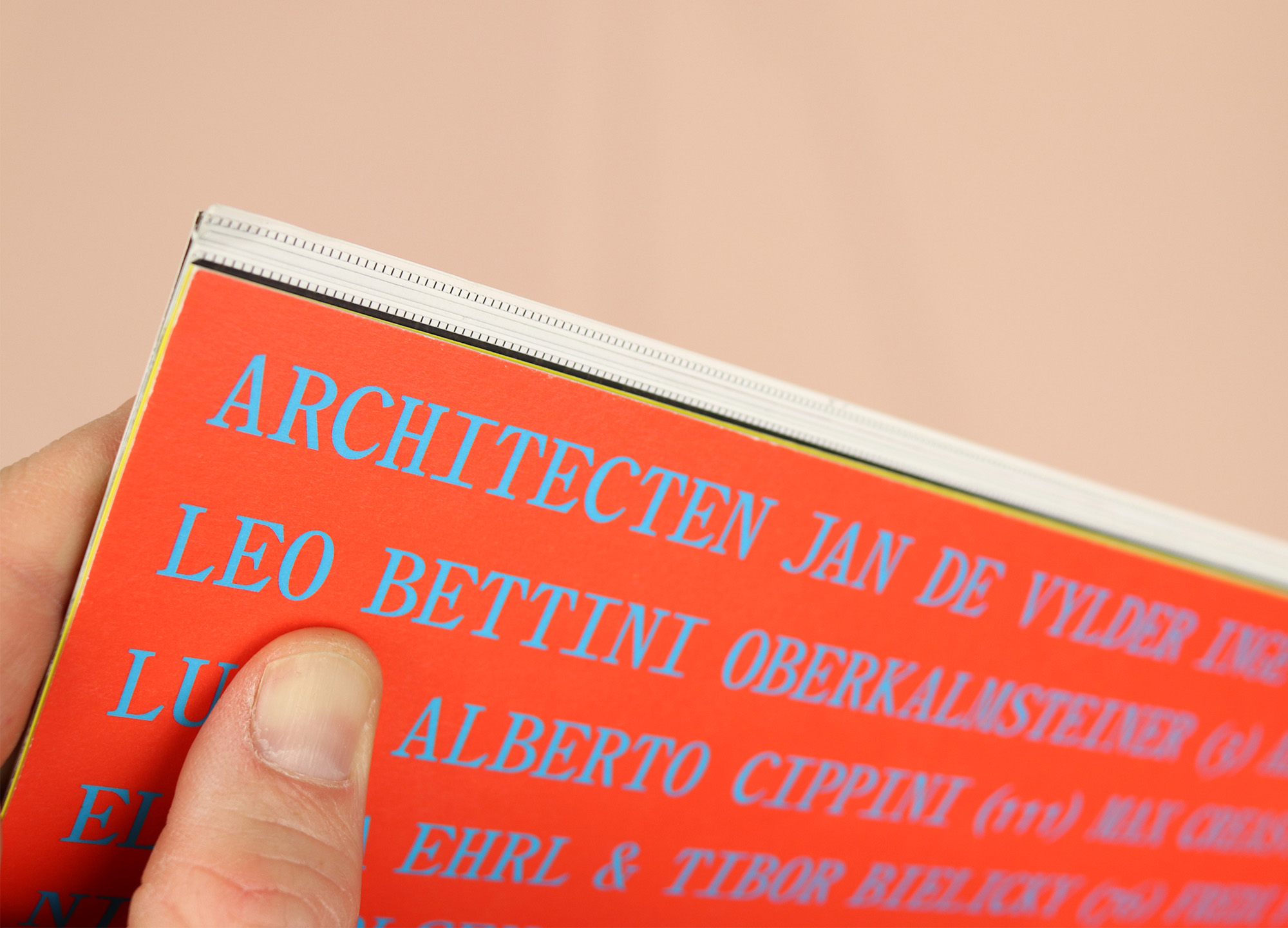 Those stark white headlines on black boxes look like a playful nod to a different media; more like video title cards than a traditional magazine headline. And the V-shaped wedge figures here too: three separate articles focus on projects by Jan de Vylder Inge Vinck, and all of them have black and white stripes on the page edges, recalling the queue dot that appears in the corner of the screen at the end of programmes on TV. It’s a tiny detail, but one that also links directly back to the name of the magazine itself, as Leo explains: