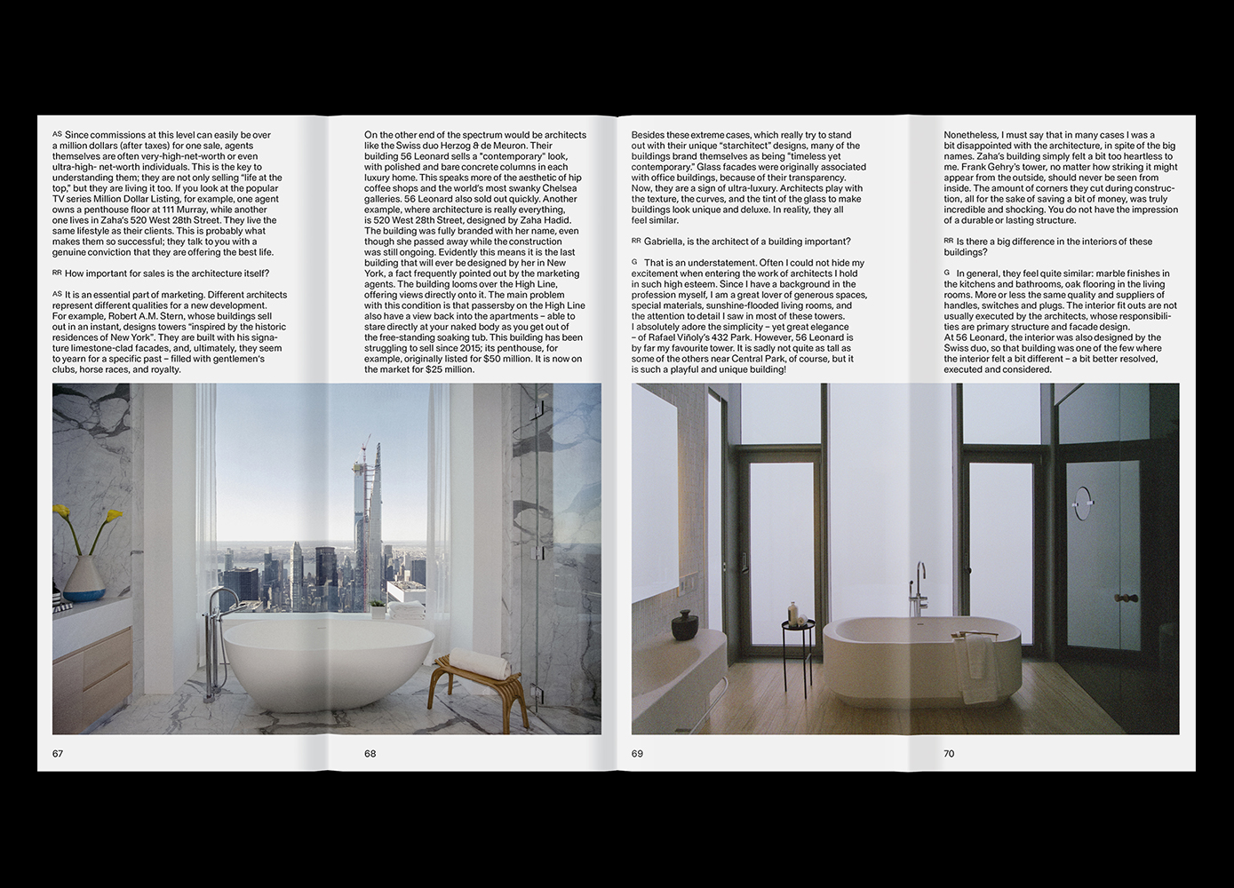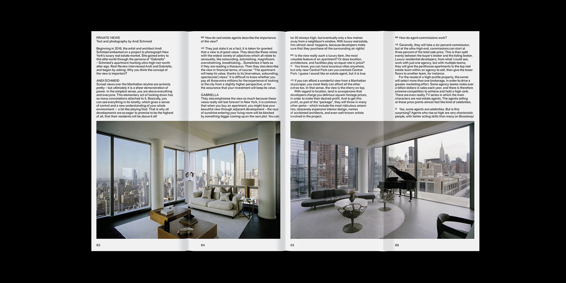 Real Review is, on the surface of things, an architecture magazine. Tug a little at that label, however, and things fall apart. Real Review’s eleventh issue does indeed contain one article about buildings — high-net real estate, to be precise — but this article is slippery. Composed as a double interview with the Hungarian artist Andi Schmied and her alter-ego, the piece can also be read as a comment on artist personae. (Schmied went undercover as an oligarch to infiltrate Manhattan’s ultra-luxury high-rises with her fake husband, Zoltan, for a book of photos.)