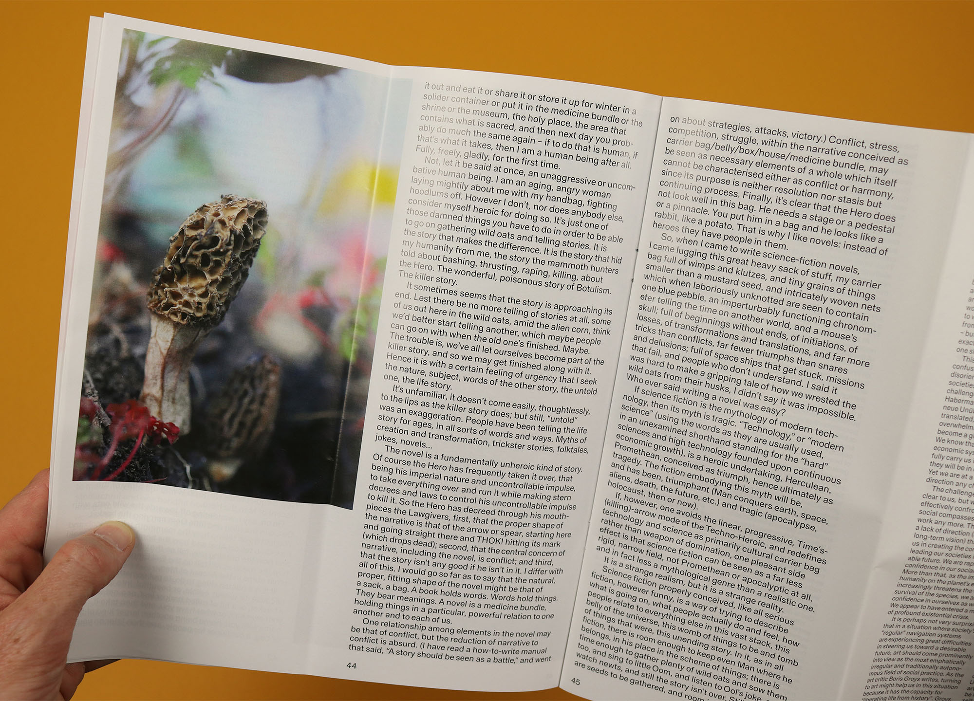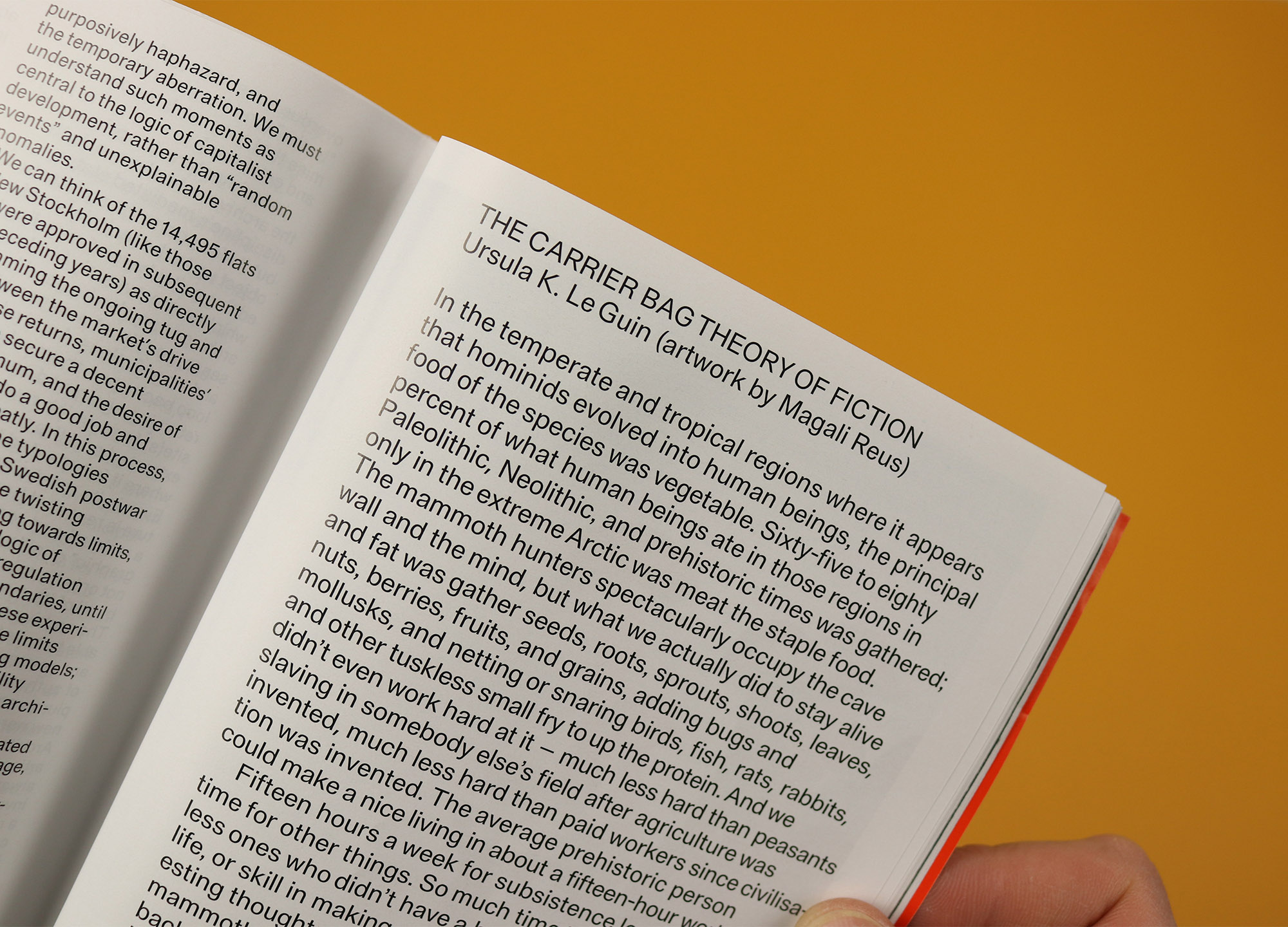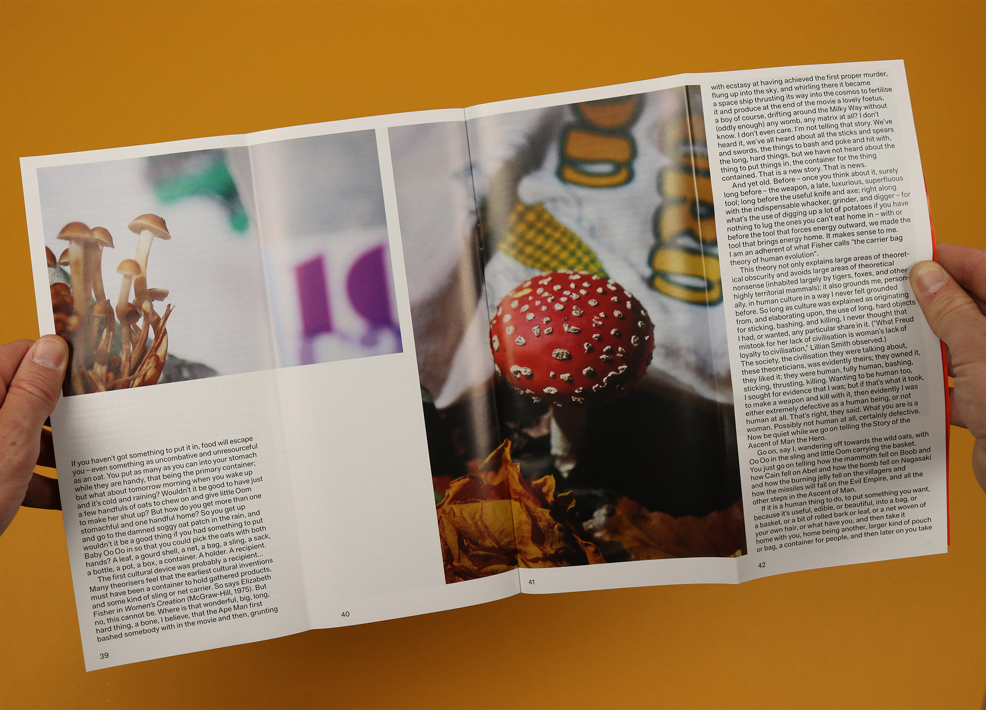 It’s fascinating stuff, and not just for its historical rigour – Wengrow argues that, “we’re weighted down by a certain artificial story of our species’ history,” and says that by jettisoning that burden we may be able to find a better, more equitable and sustainable way of living now and in the future. That’s followed a few pages later by Ursula K Le Guin’s essay The Carrier Bag Theory of Fiction, first published in 1986 and reproduced here alongside artwork by Magali Reus, offering another look back at our ancient ancestors, and challenging received wisdom about our deep history and what it means to be human.