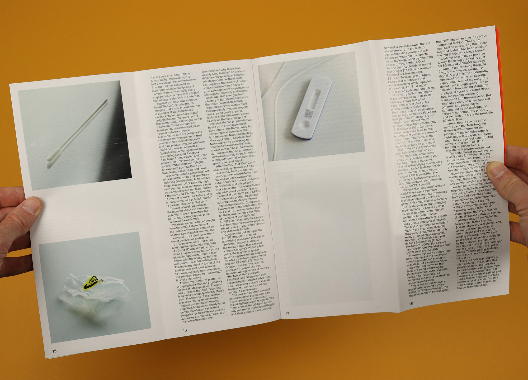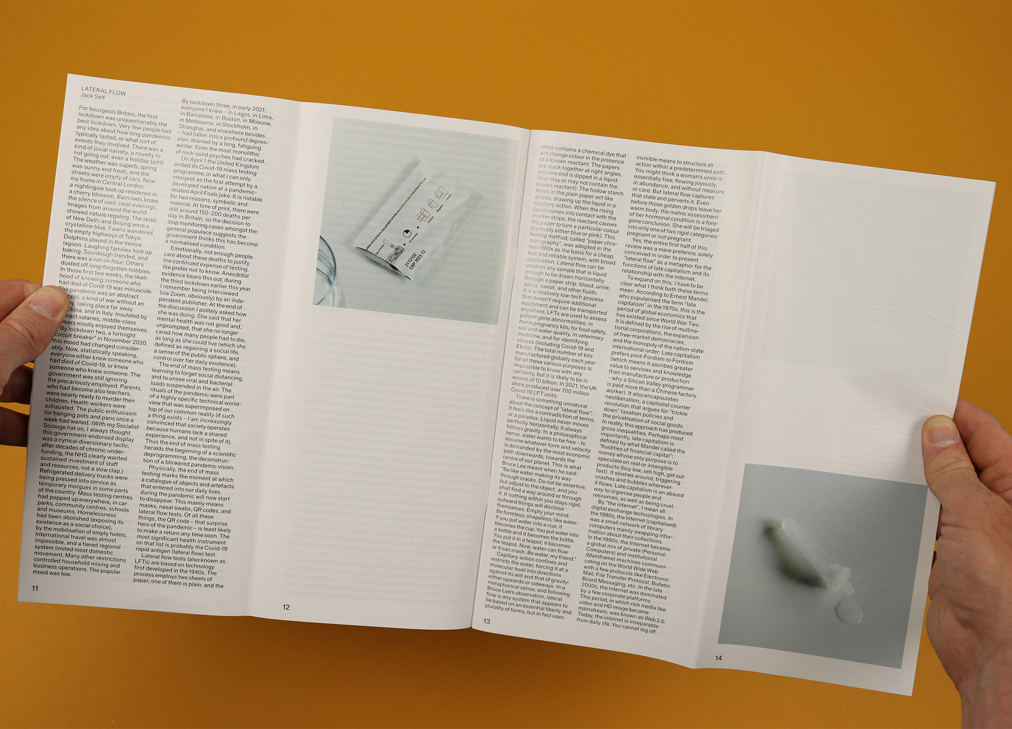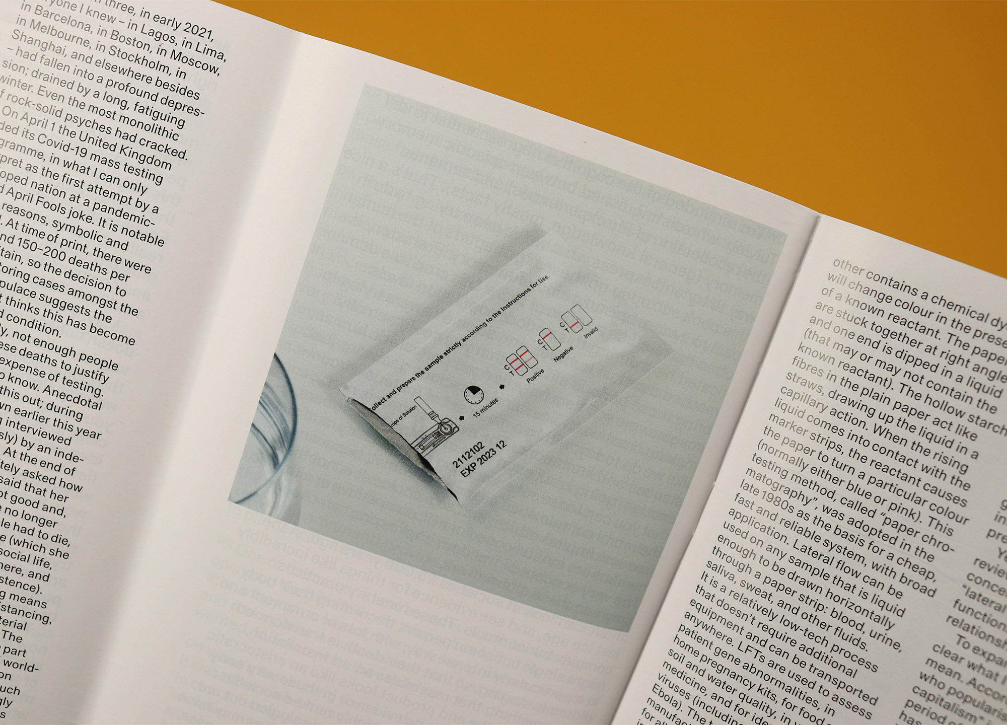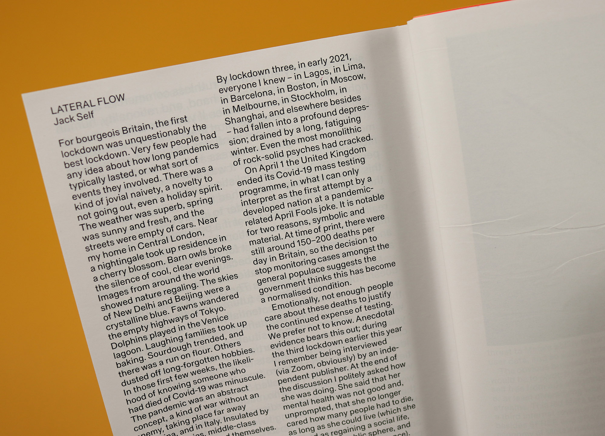 There are also structural similarities between otherwise unrelated pieces, with several reviews that set out to feature one subject, before pivoting dramatically to focus on something else. Editor Jack Self is entirely open about this editorial pirouette in his review of the lateral flow process, which begins with the pandemic and the history of the lateral flow, then uses the most joyous and exuberant description you’ll ever read of a woman taking a pregnancy test to switch into a criticism of late capitalism and its relationship with the internet.