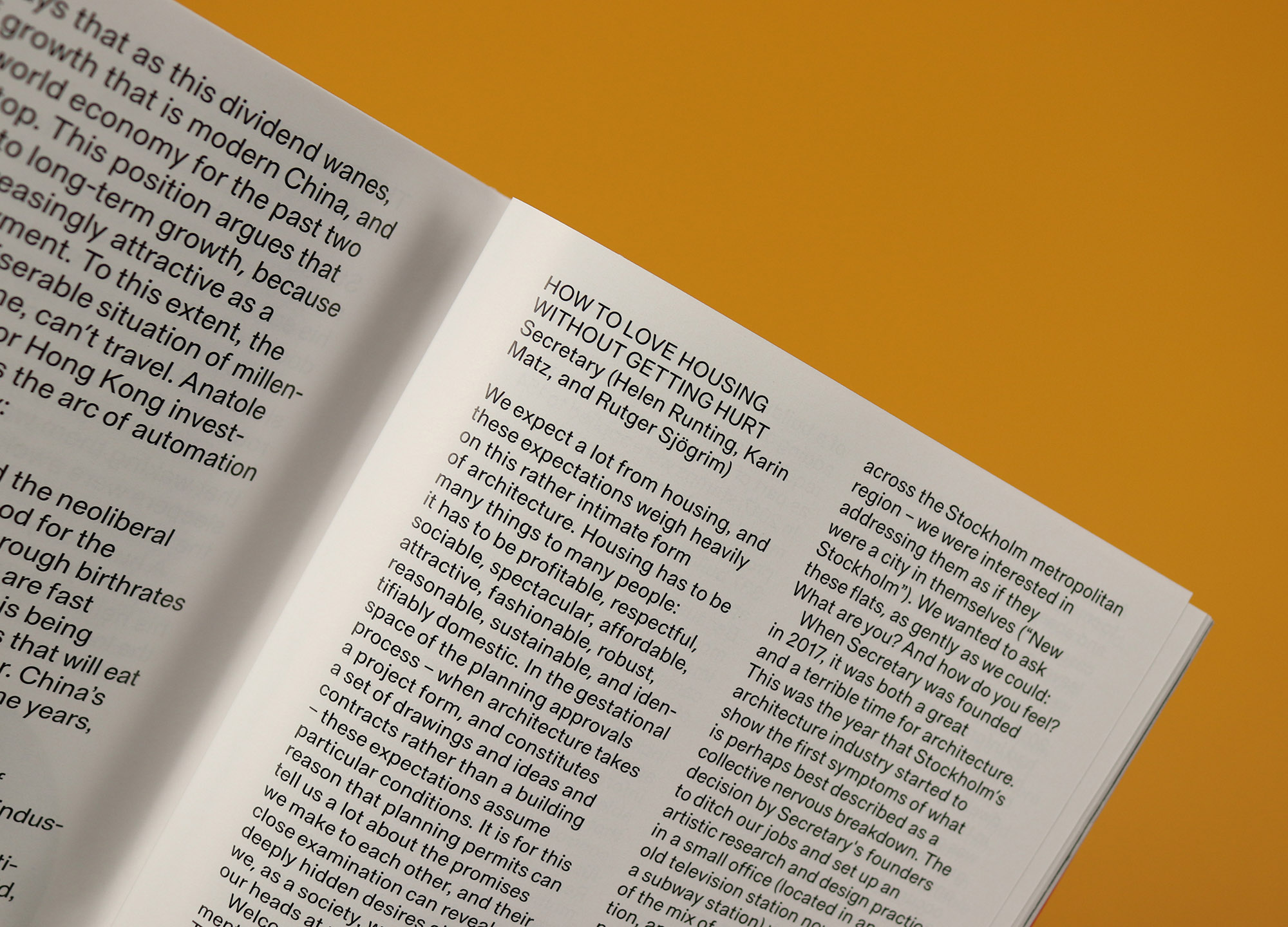 Architecture doesn’t only influence the shape of the magazine; it also provides the basis for two stories that take an analytical look at the spaces we live in. How to Love Housing Without Getting Hurt focuses on Stockholm’s new housing, while Stored Labour looks closely at the layout of apartments in Hong Kong, and the stories are strikingly similar in the way they use our built environment to reveal insights about the different ways we live.