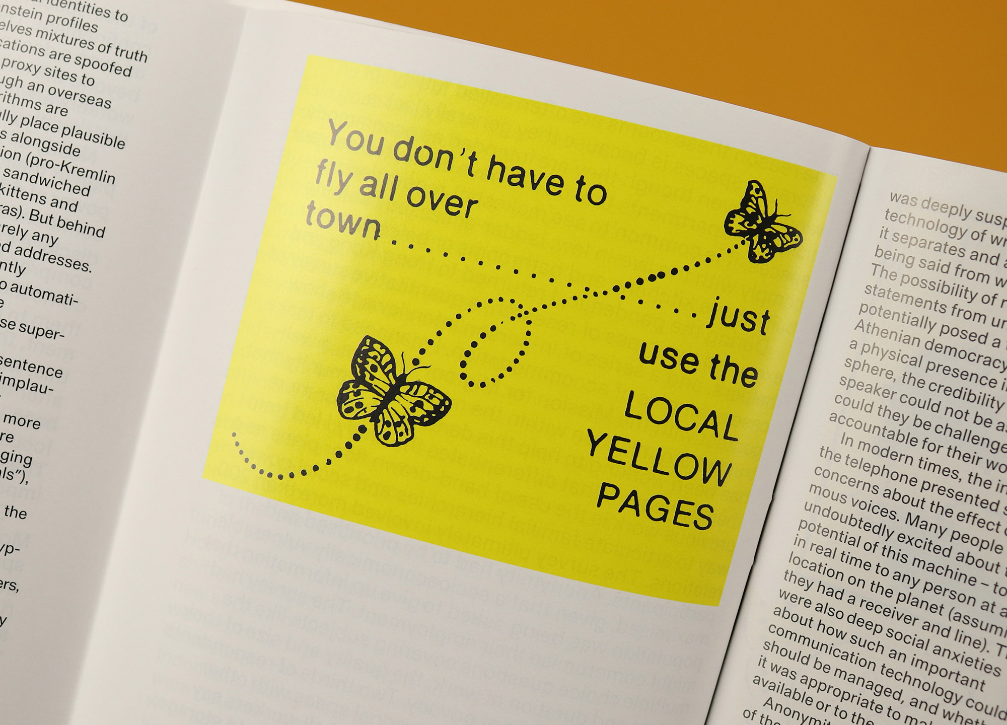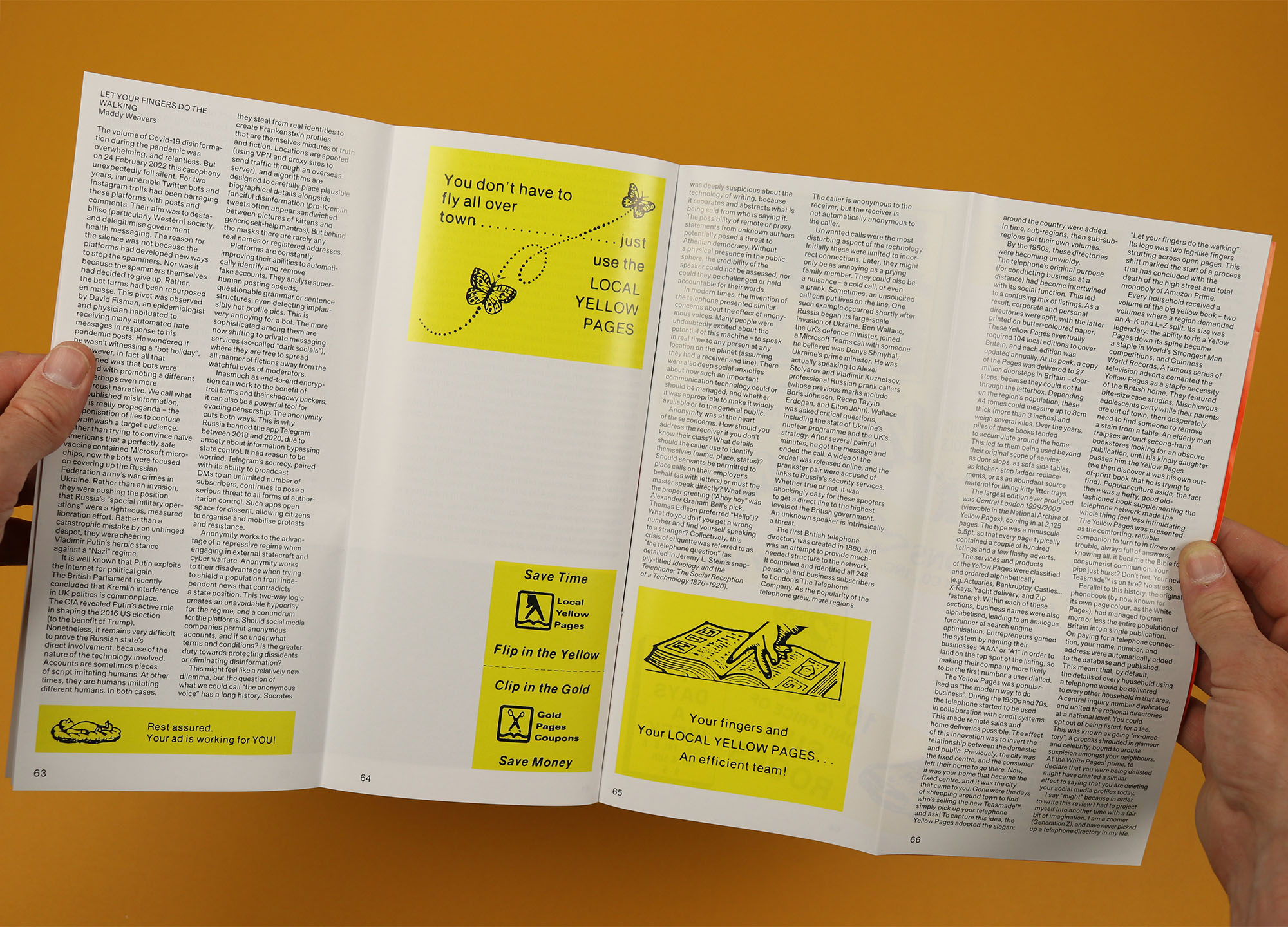 Similarly, in Let Your Fingers Do the Walking, Maddy Weavers opens with an overview of Russian disinformation, before bringing her review around to its promised focus on the Yellow Pages.