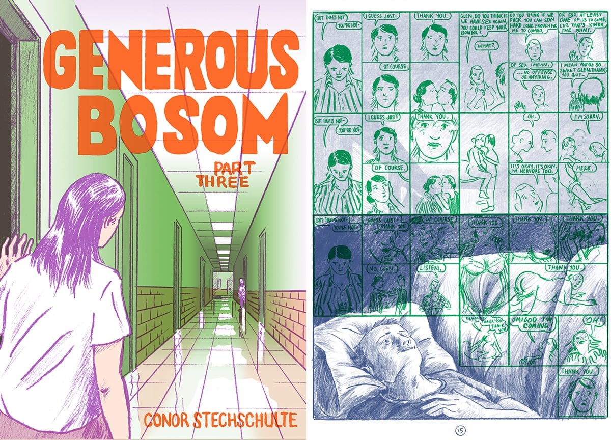 The latest work from Chicago-based cartoonist Conor Stechschulte is an erotic psychological thriller charting the fallout following a stranded motorist’s unexpected encounter with a strange, isolated couple. This is the third in Conor’s ambitious series published by cutting-edge London based publisher Breakdown Press. The 62-page comic is printed in risograph, which is used as a central aspect of the trilogy’s storytelling with the use of overlapping imagery and colour lending itself perfectly to the narrative sequences. With Generous Bosom 2 being described as being ‘the most mind boggling comic of the year,’ it’ safe to say we’re looking forward to seeing how part three unfolds. conorstechschulte.com