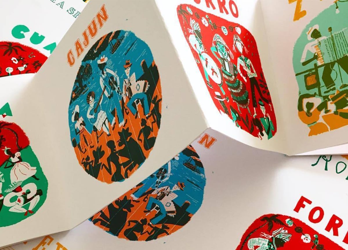 Design For Today was founded by Joe Pearson, an established collector and writer on mid-century lithography. His finely curated list of publications are a visual treasury of reissued ‘forgotten classics’, contemporary European classics of illustration and mid-century design, as well as new, beautifully crafted publications printed using traditional processes. In his latest publication The Squeeze Book he’s teamed up with illustrator and art director of Okido Magazine, Alex Barrow. Together they have created a compendium of illustrated accordion music from around the world, published with dye-cuts and in accordion format across a 12 panel double-sided concertina — affording the reader a chance to actually have a squeeze! designfortoday.co.uk