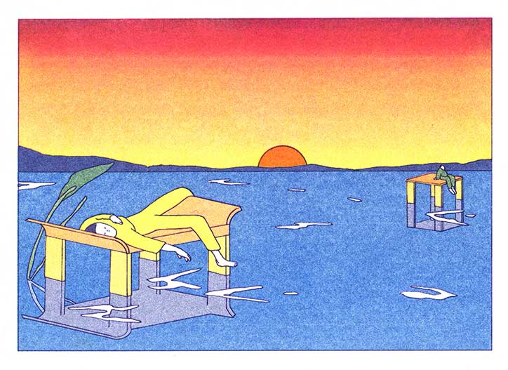 María Medem’s work is printed in risograph and largely wordless, using bright, block colours and strong lines to create a simple but masterful aesthetic. Lush and unsettling, her book Cenit is about sleepwalking, and the struggle of not knowing if you dreamed something or actually lived it.