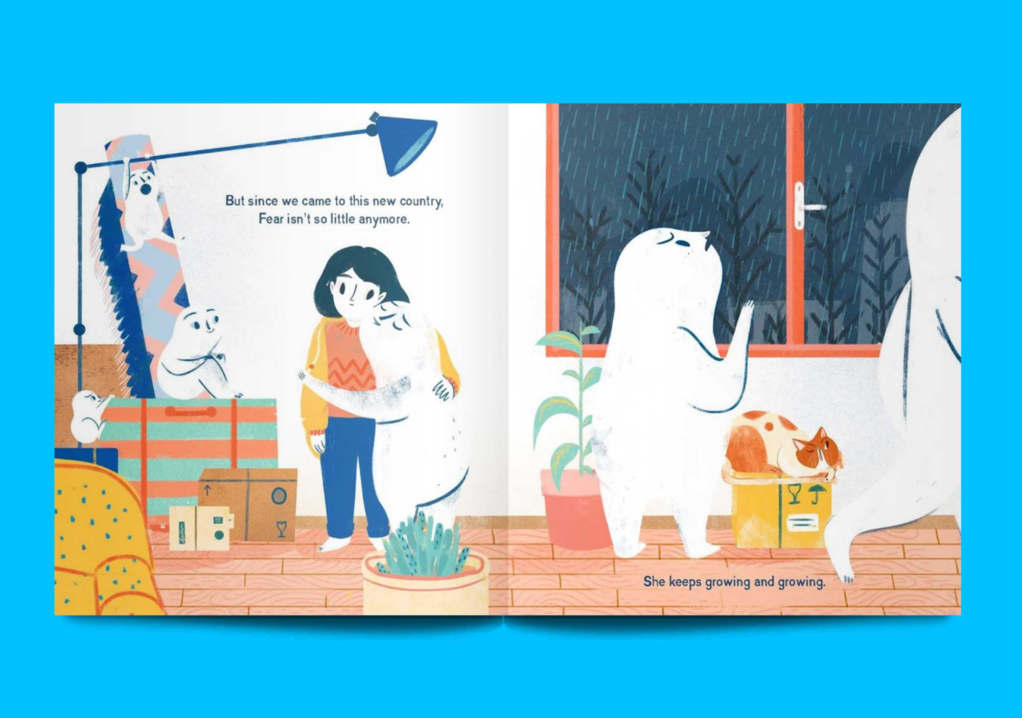Me and My Fear is by award-winning children’s picture book author Francesca Sanna. It tells the story of a young immigrant girl, who has to travel to a different country and start at a new school, accompanied by a large animal-like creature called ‘Fear’, who grows bigger every day.
