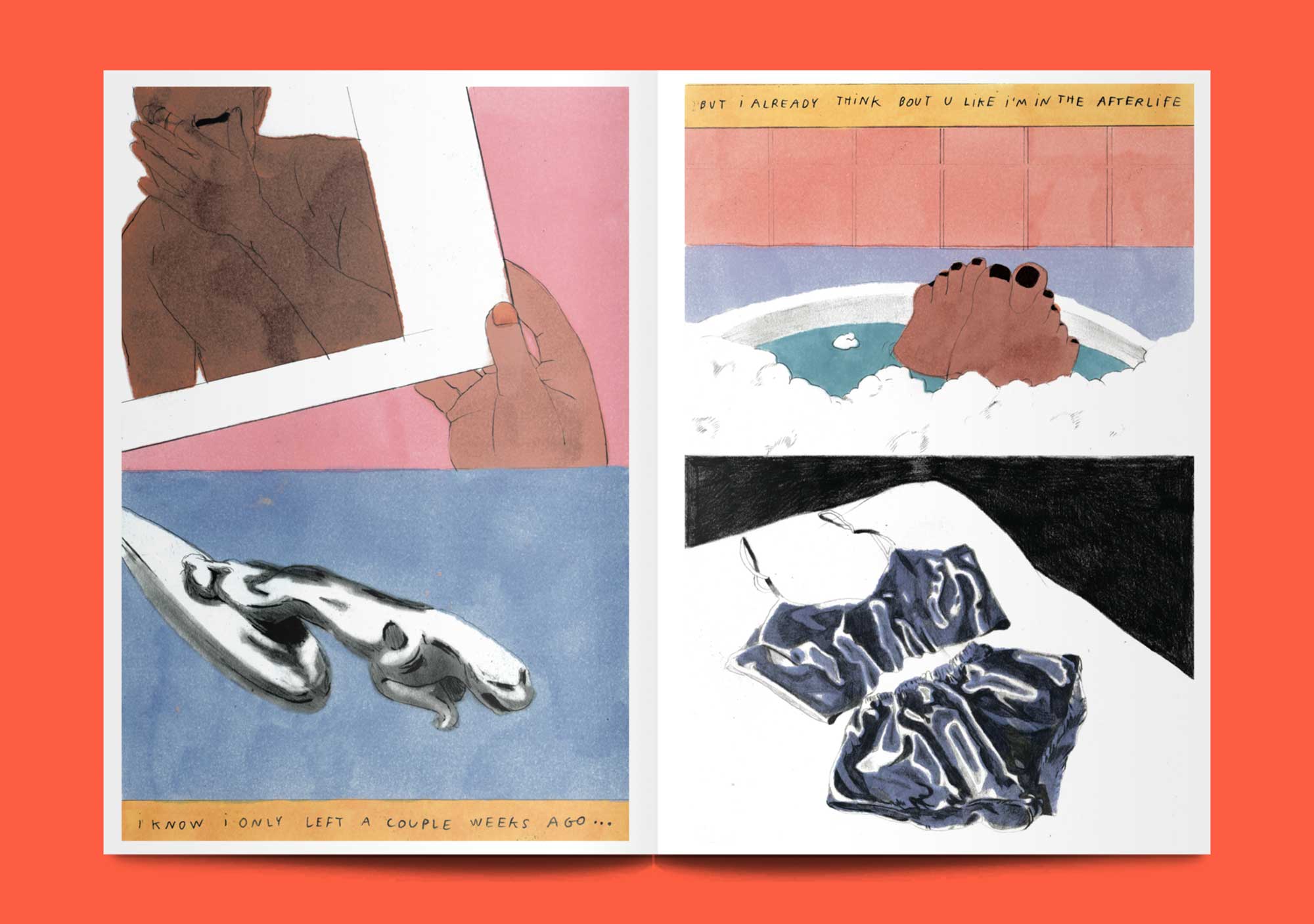 Melek Zertal is an Algerian born artist living between Paris and California. Since graduating from Les Arts Decoratifs de Strasbourg in 2017, she has worked on a series of small-scale comics, including Fragile, about a girl writing a love letter in a diner. Her characters are remarkable for a certain doe-eyed honesty, and her artwork is a wash of hazy, muted colours.