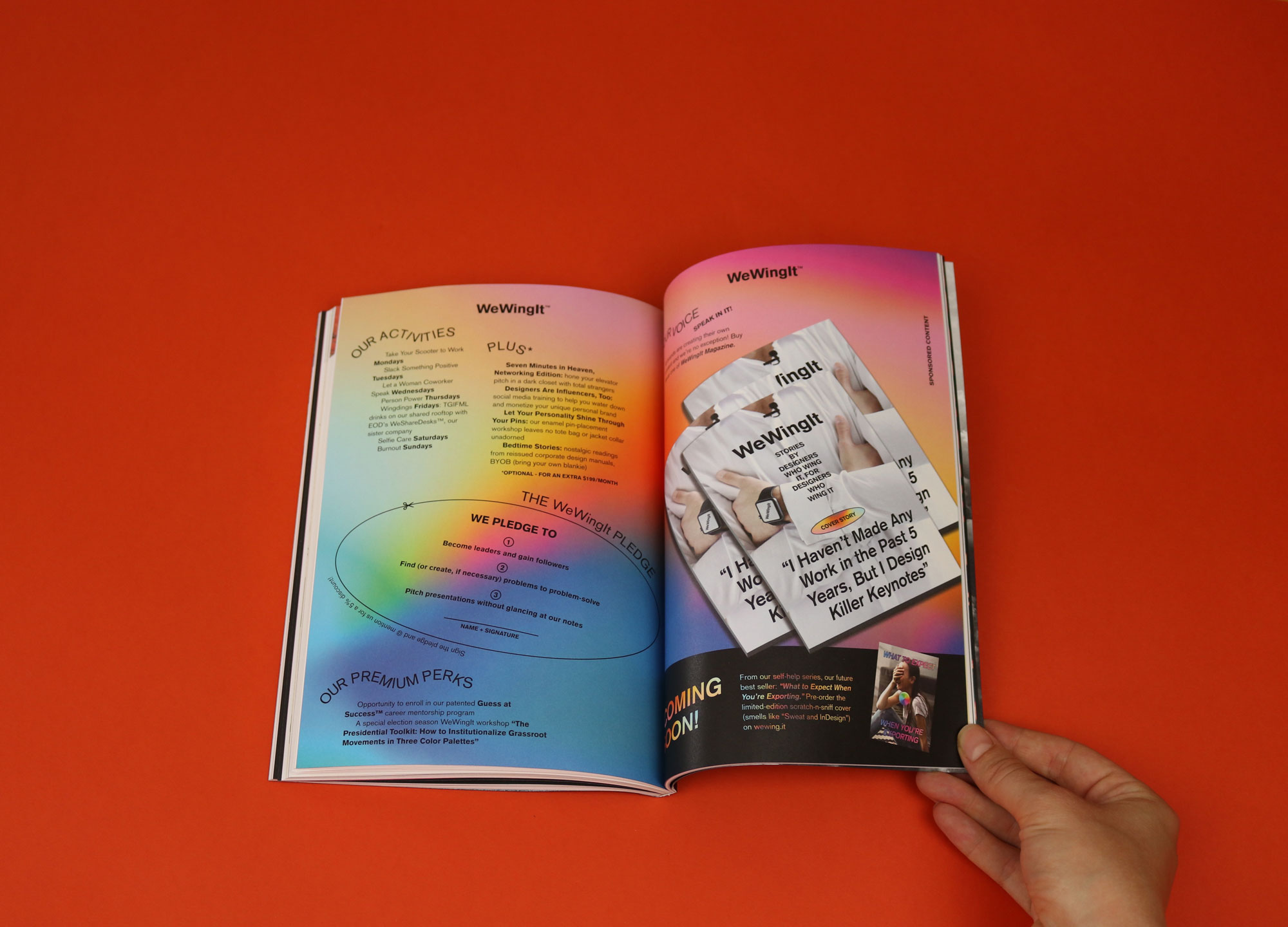Funny and exceptionally gorgeous, Eye on Design likes to choose unpredictable themes; past issues have explored “Gossip”, “Psych” and “Worth”. The latest issue is all about utopias, and one of its gems is an advertisement for WeWingIt, a co-working space “for designers who wing it”. Satirising women-only shared working space The Wing, Tuesday at WeWingIt is “Let a Woman Coworker Speak” day.