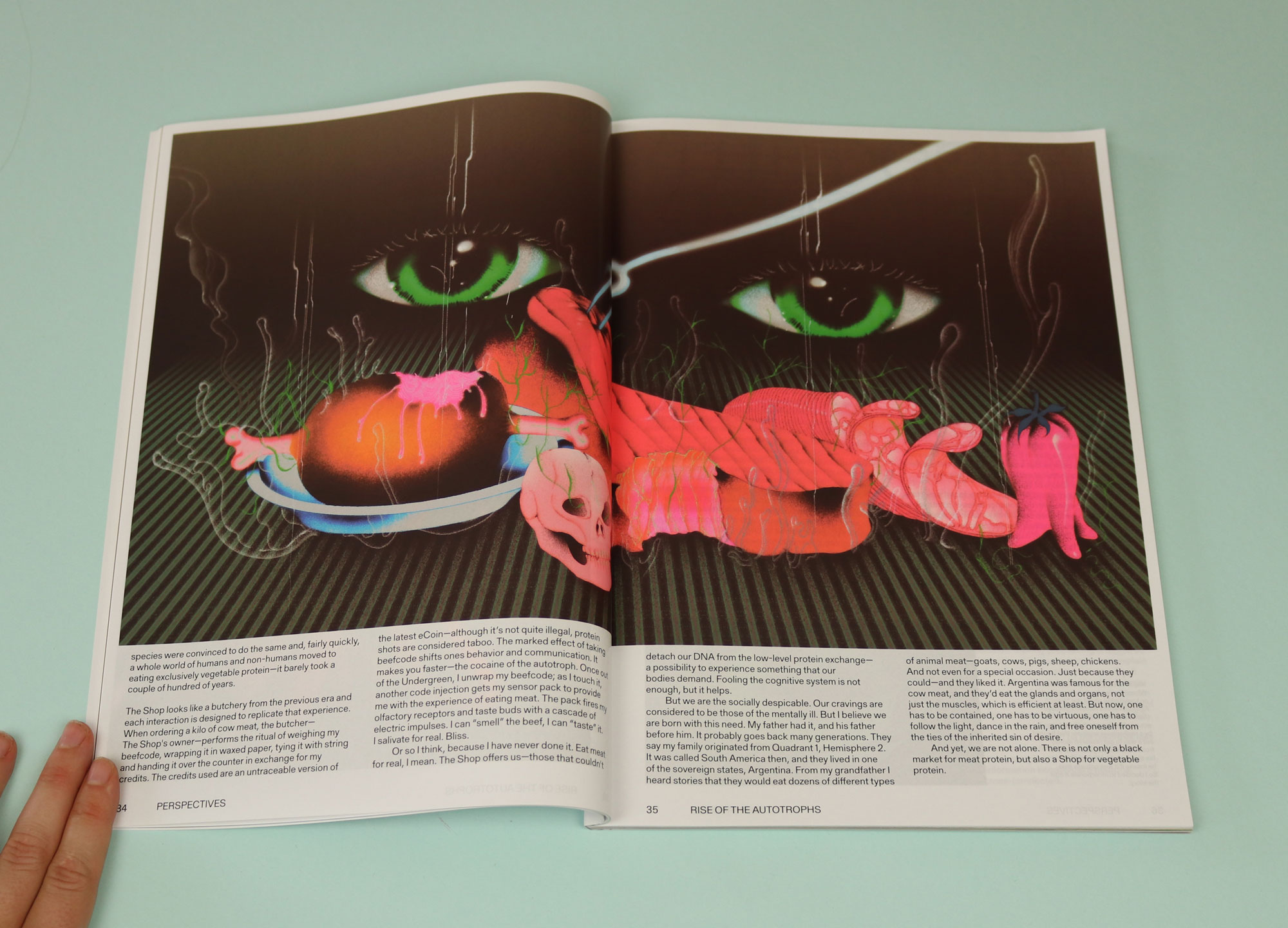 Mold is a design magazine about the future of food. Techy and slightly trippy, its fourth issue, entitled ‘Designing for the senses’, begins at birth: “Within minutes of being born, one of our first acts is to seek out food… mewling babies crawl up their mother’s bodies to breastfeed themselves.” In the pieces that follow, neuroscientists, chefs and farmers propose design solutions to the food crisis.