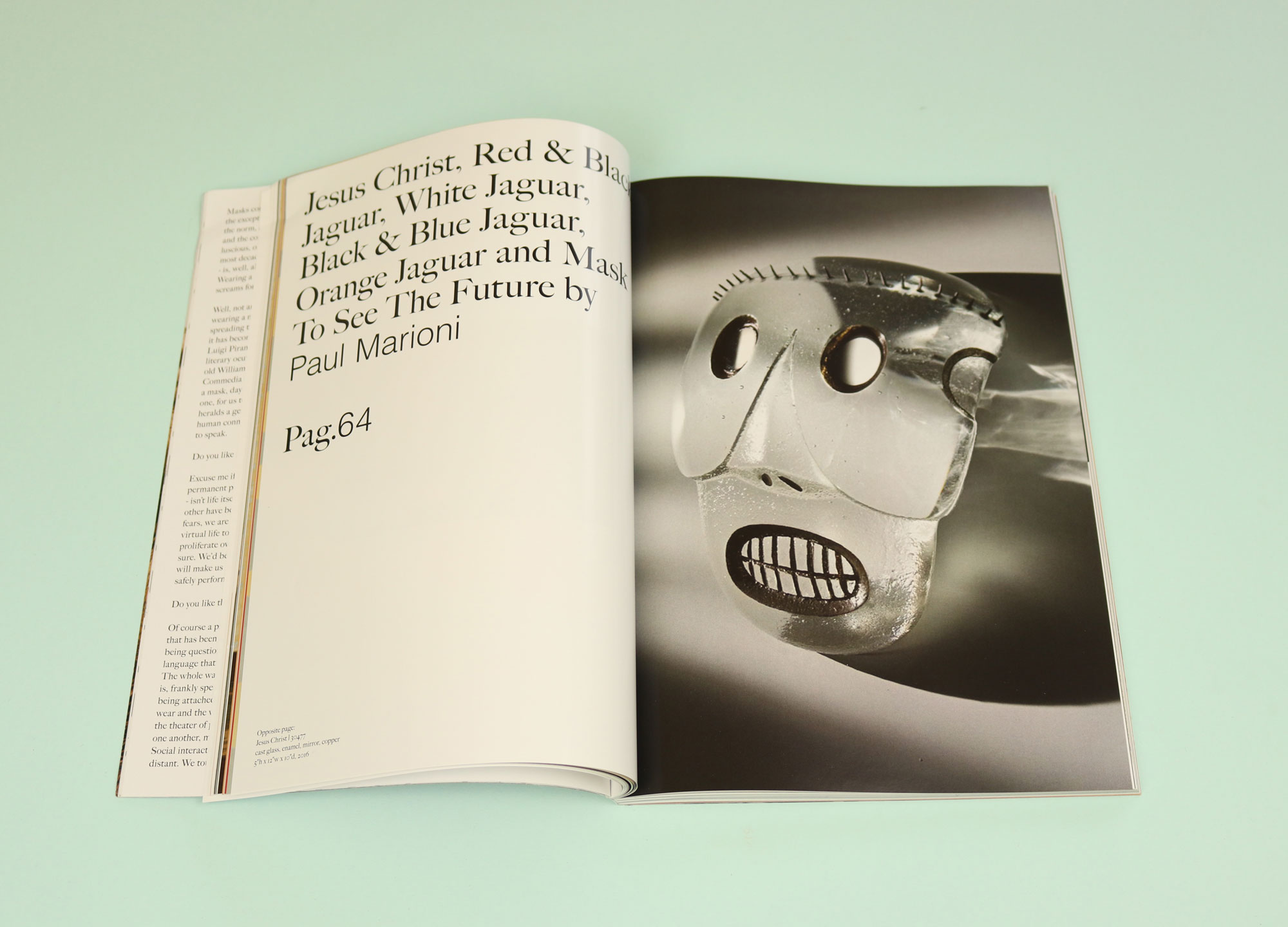 It is strange to think about a mask as a distillation of everything that is most human. A few pages along, there is a photo-shoot of a cast glass mask of Jesus Christ, with exposed copper spikes for his crown of thorns and gaping holes for eyes. At first I found myself agreeing with Lovato; this mask, in its very simplicity, distils something about the essence of suffering. But at the same time that very simplicity makes it horribly inhuman, a caricature.