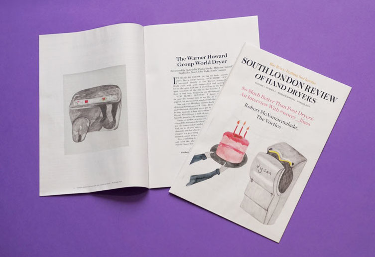 It was a chrome Manrose hand dryer, encountered in the toilets of the Isle of Man Sea Ferry, that first inspired the project that would become the illustrious South London Review of Hand Dryers (aka SLRoHD). Edited by Wedgeley Snipes (not his real name), the zine launched in 2019 and has since been invited by Dyson to review the new Airblade 9KJ, collaborated on a tea towel with artist @worry_lines and connected with a (surprisingly vast) global network of like-minded hand dryer enthusiasts, from the Facebook group Come Dry With Me to the newly launched Facility Magazine.