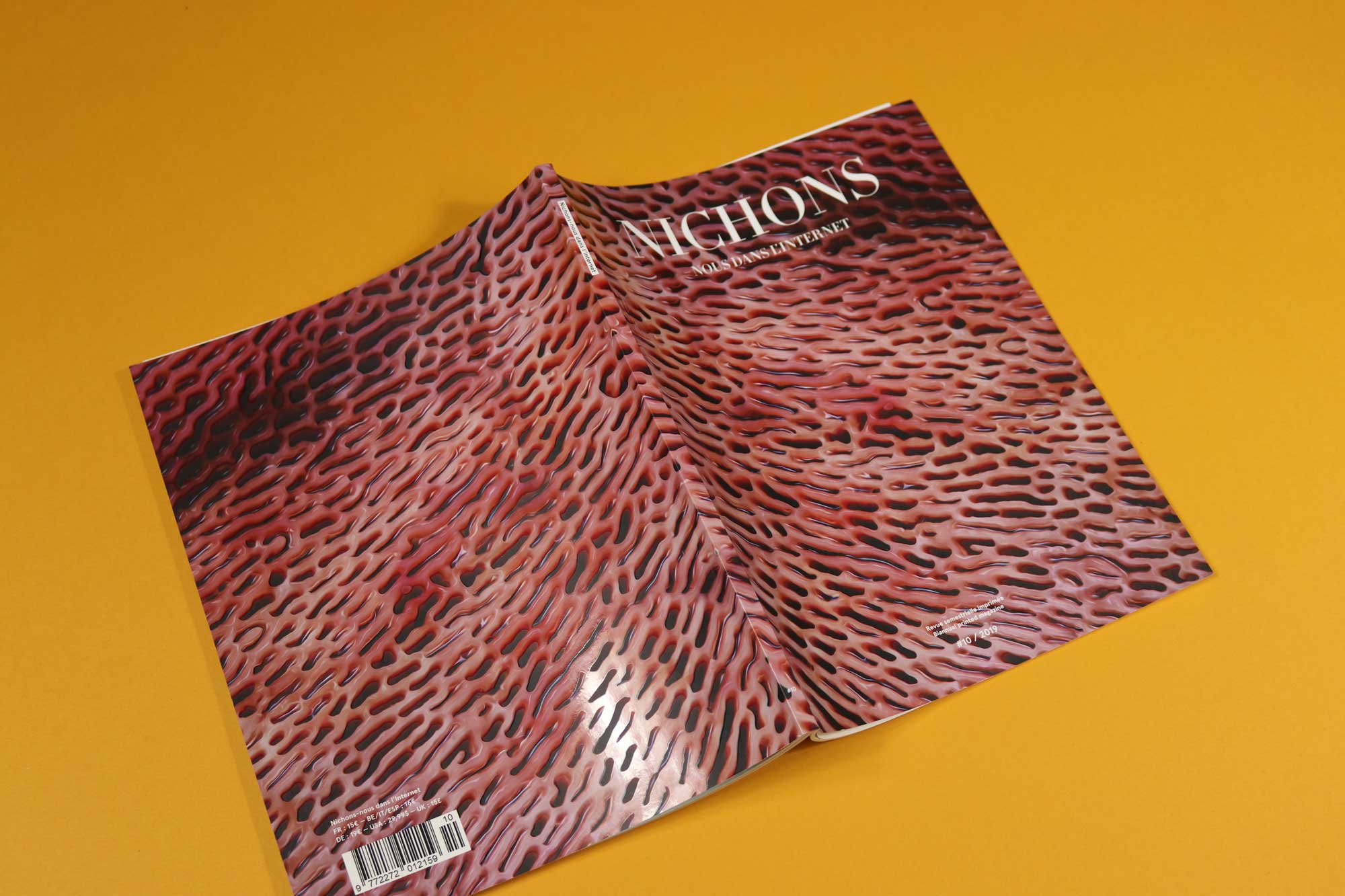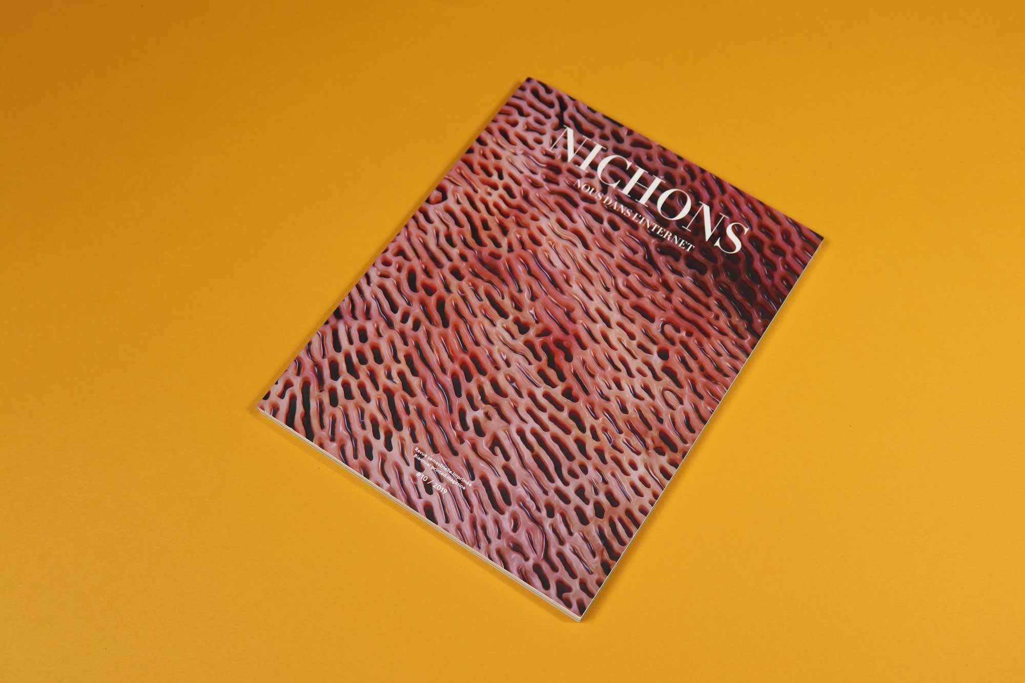 Nichons Nous Dans l’Internet, which translates to ‘abreast of the internet’, is a French magazine exploring the intersection between art and the web. Pieces in issue 10 respond to Tinder and trypophobia (the cover is a juicy, horribly raised collection of tiny holes) and there’s a wonderful feature about a bubblegum pink massage chair that has the ability to speak to you. Throughout, there seems to be preoccupation with AI and memes that fascinate us despite, or perhaps because, they are objectively revolting. Small holes are awful, yes, but we somehow cannot stop googling them.