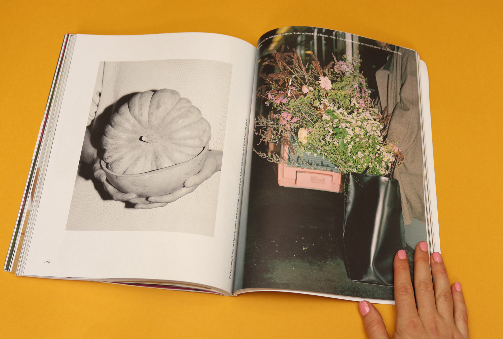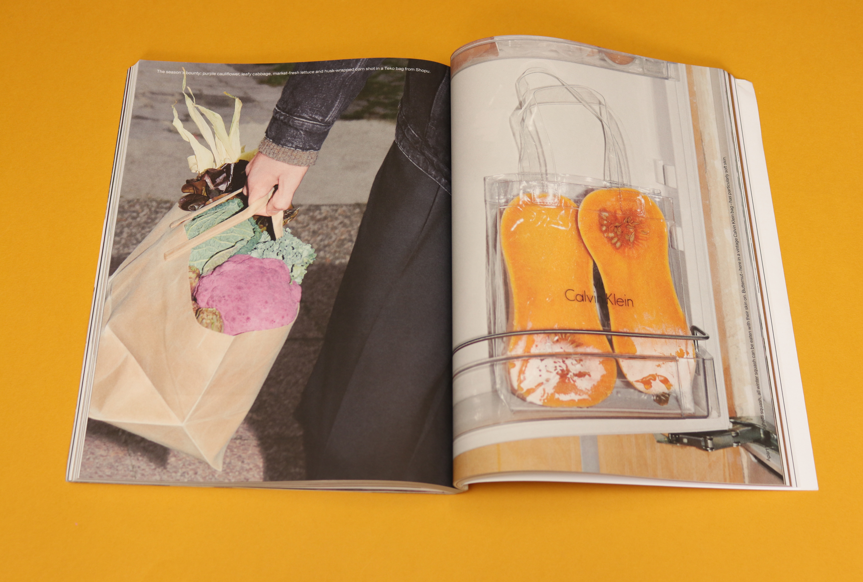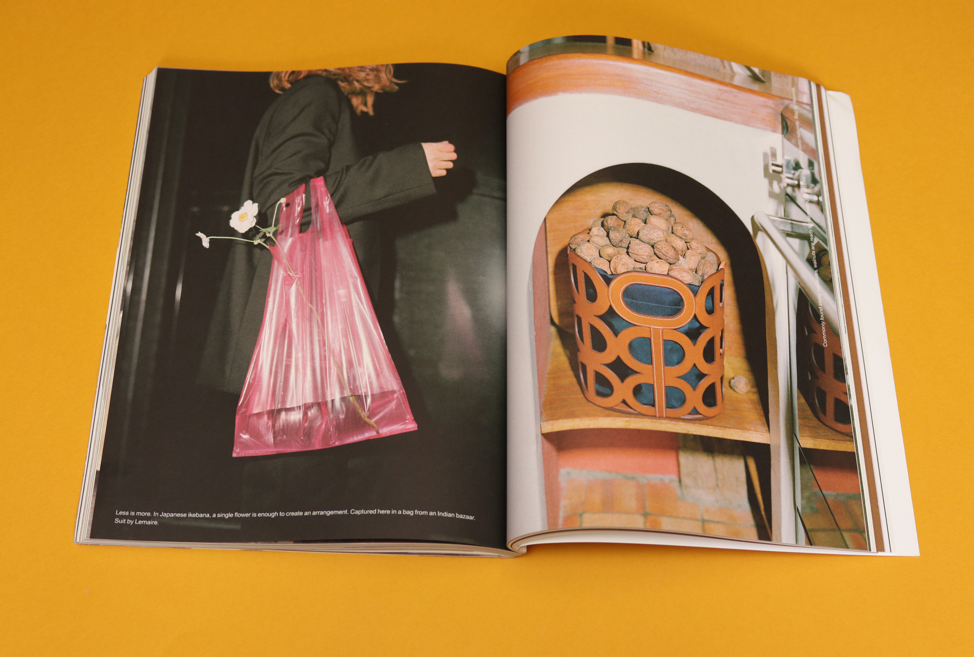 This appetite for strange juxtapositions is a feature of The Plant. Another fantastic feature shows bags — posh leather ones, straw ones, plastic ones — stuffed with flowers. Clothes are another constant subject of these pages. Some of the fashion shoots are a little obvious (think: pretty people running free in nature), but most of the editorial combines plants and clothes in unexpected ways. One central feature is devoted to a new womenswear collection by Imogen Wright and Vincent Le Chapelain, the duo behind upcycle designer Wright Le Chapelain. The designs — which are fantastically androgynous — are photographed alongside close-ups of flowers, and the combination of traditionally masculine and feminine elements is satisfying and beautiful.