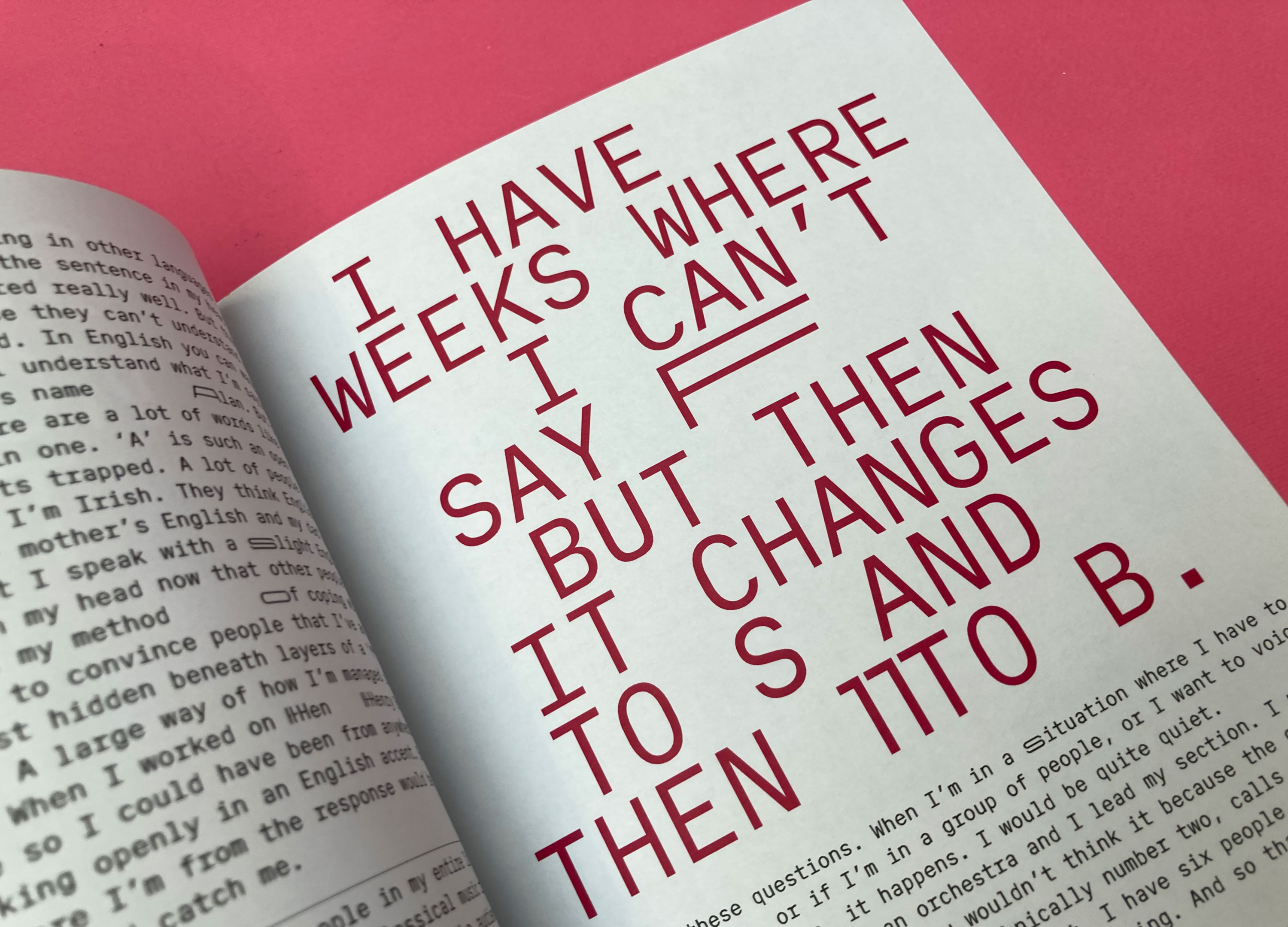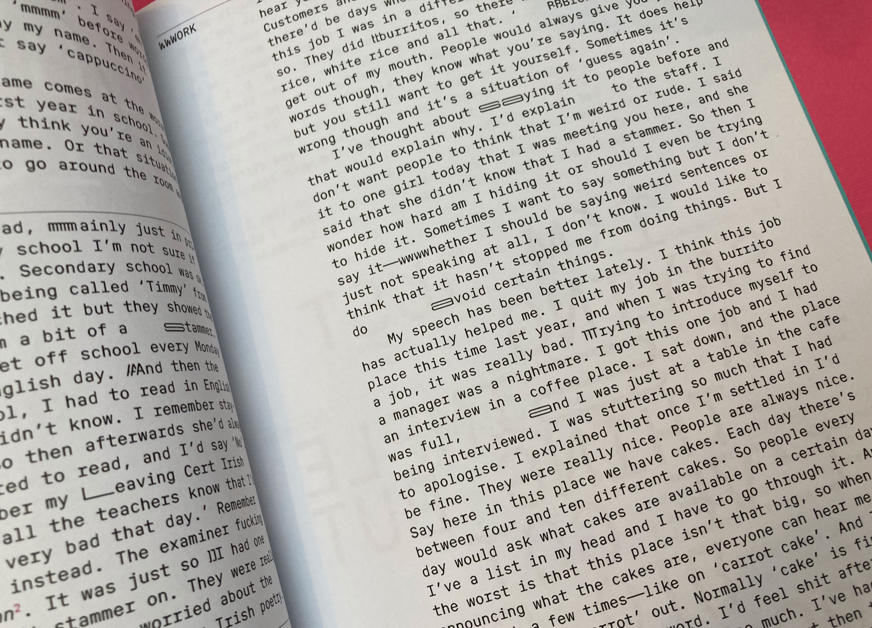 Talking about a stammer is exposing, which gives the interviews in Dysfluent a certain level of vulnerability. Interestingly, this is a magazine about difficulty communicating, but the way subjects express themselves on these pages is unusually powerful. The typeface gives the interviews an auditory quality, which makes you feel closer to people speaking. Café owner James Connolly wonders about how often he chooses not to speak, rather than risk stuttering: “Sometimes I want to say something but I don’t say it — wwwhether I should be saying weird sentences or just not speaking at all.” The experience of reading Dysfluent is often moving.