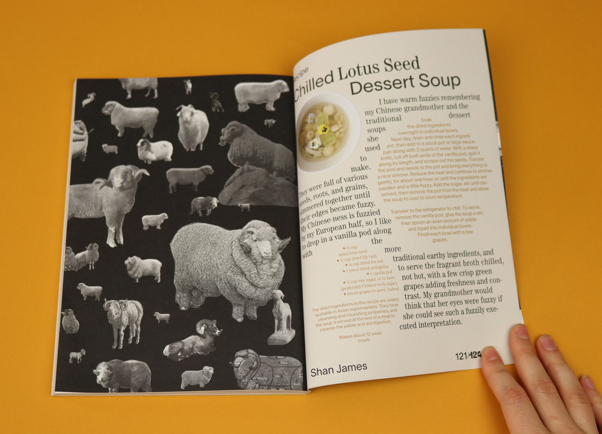 This magazine’s dream-like quality is rooted in the playfulness of its design. Every page is a delight: the text for Wooly Monuments is interrupted by bulbous, furry towers; a recipe for “chilled lotus seed dessert soup” is arranged in circular blobs, next to a random black-and-white collage of different sheep. There’s a chimerical, 3D-quality to some spreads: in one bizarre how-to-guide to shampooing a bee, for example (“add a tiny amount of soap to a vial of water in which the bee takes a bath”) the bees — photographed in quivering detail — buzz in and out of the text. The most beautiful feature of all is a series of photographs of Puerto Rico, after a hurricane. Every photograph is of greenery, and it is so thick and lush, looking feels like touching.