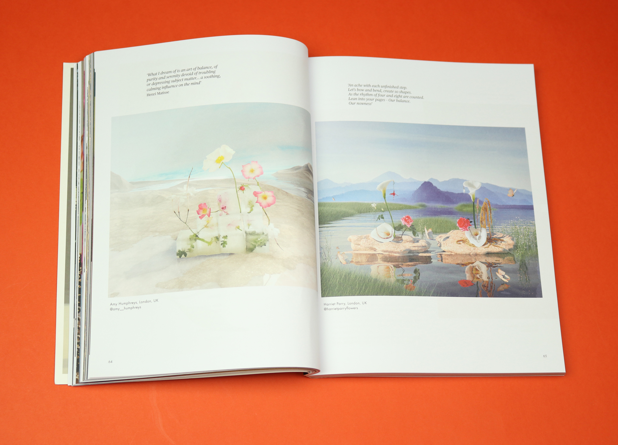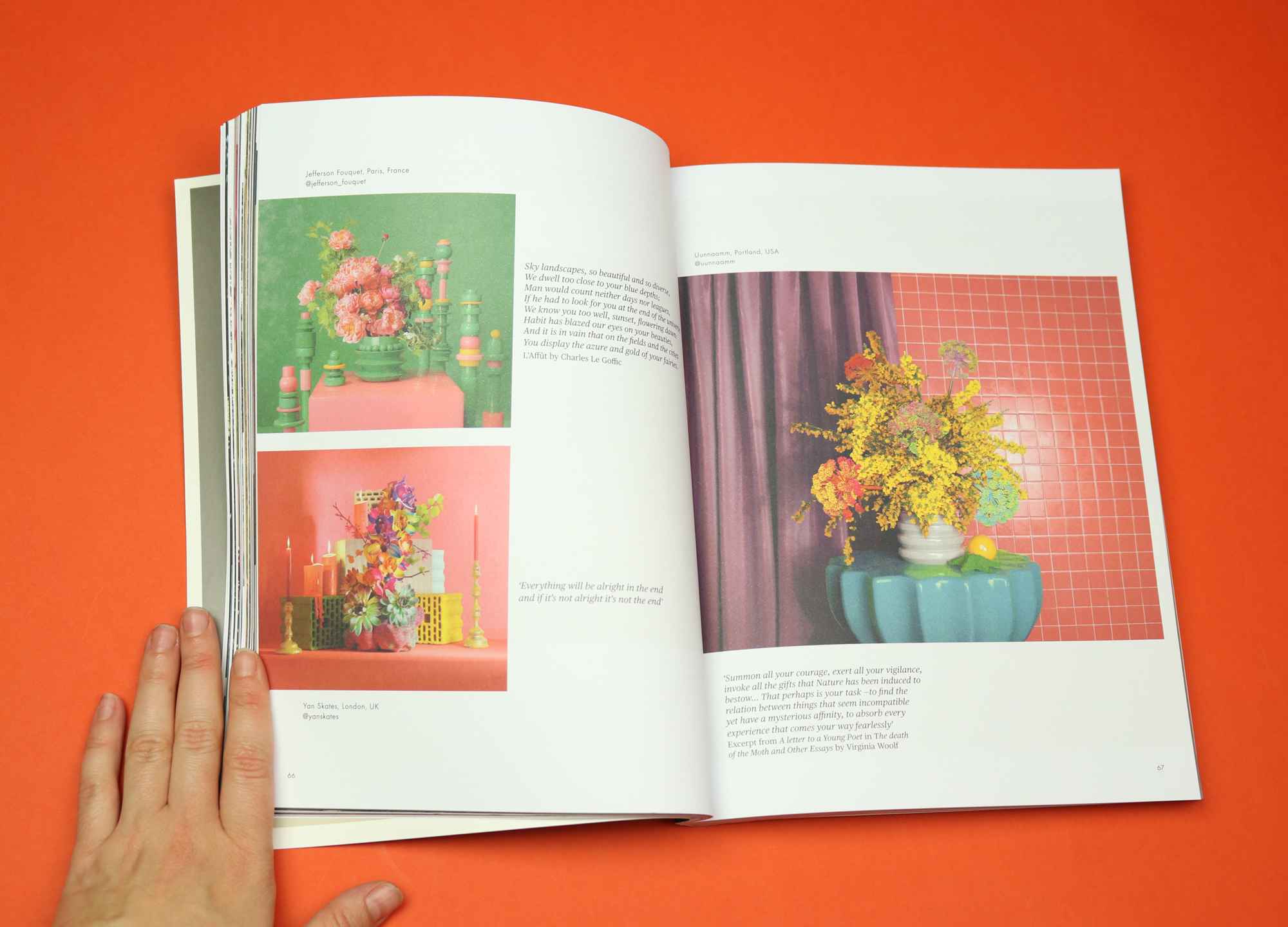 Some of the most striking images are collected in a feature entitled ‘Flowers in Quarantine’, which sees floral artists from around the world contributing bouquets. What I like about these images is that they are often surreal: we see orchids, dripping with jewels, and floating in a simulated lake; petals frozen into an ice sculpture; flowers attached to the ceiling with a metal chain.