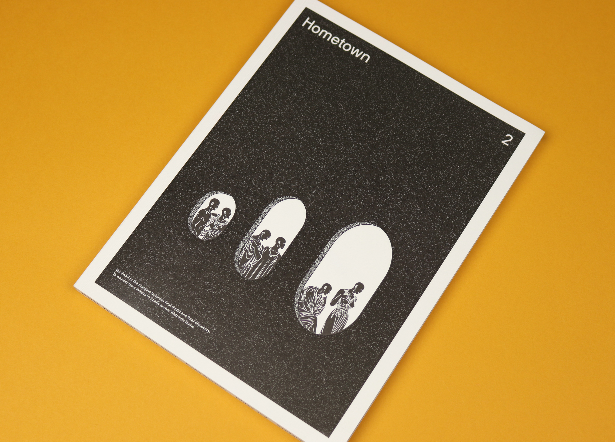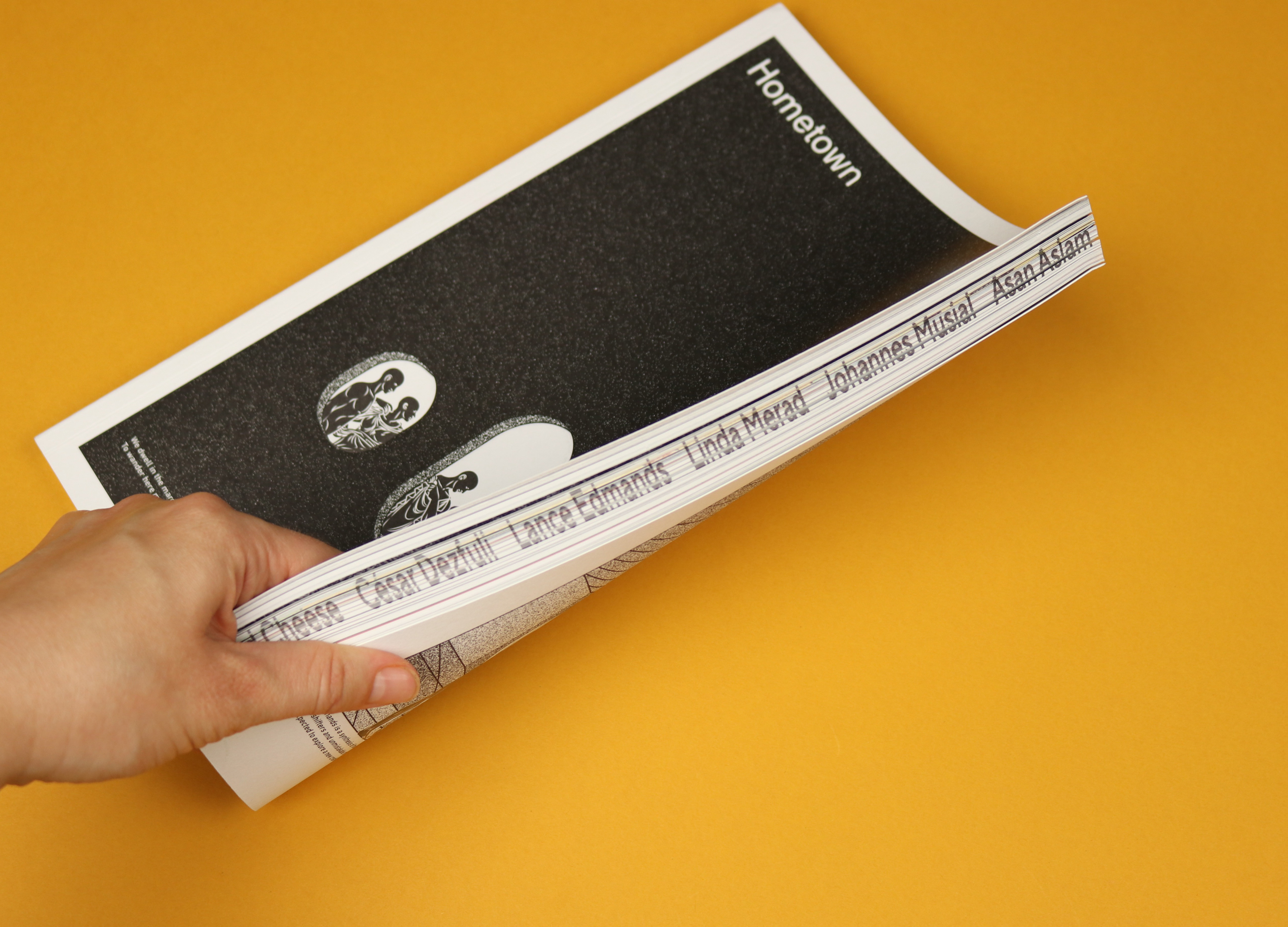 The first issue of Hometown was printed on seven different types of paper. Similarly, issue two exemplifies all the wonderful things you can do with the printed page. The magazine is devoted to interviews with artists, the first being illustrator Berke Yazioglu, who produced Hometown’s cover art. The cover itself is a departure from issue one — which was deep pink — but what attracts me to it is the way it feels. Three small, white windows are embossed on the page, visually and physically interrupting the black paper. Turn the magazine over and you can trace the faintly Grecian figures on the back. The fore-edge is painted with the names of the contributors inside. Looking at the cover online it felt bland to me. Only once I held it in my hands did it come alive.