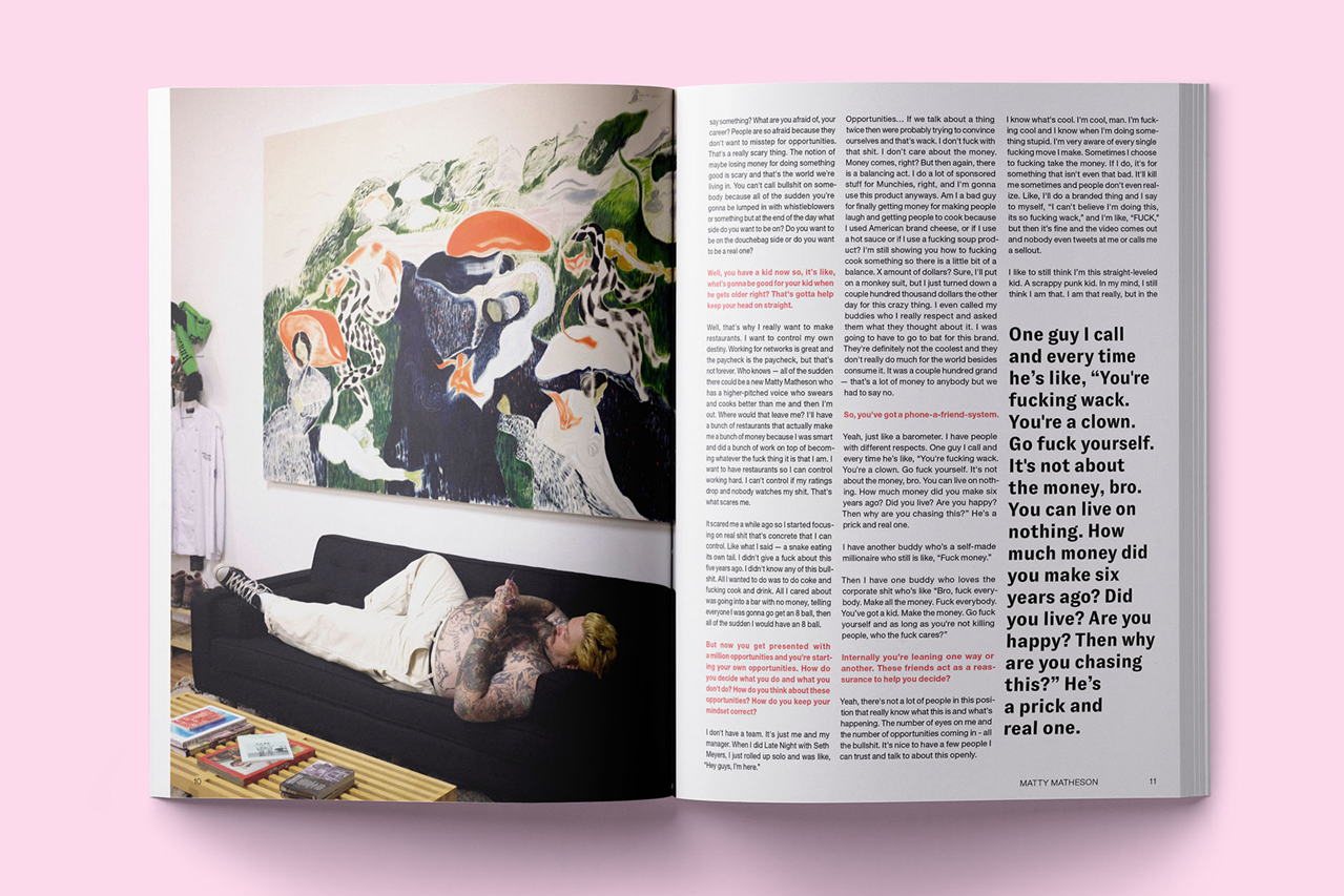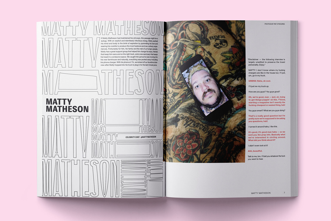 “Personally, Matty Matheson’s interview had the most impact on me while creating VOL. 3. While his substance abuse almost killed him, the root of his personality now thrives and shines more than ever — an infectiously positive and unwavering moral compass. What’s interesting is how he talks about his coke habit as something that has fuelled his outgoing spirit. Like when he looks back over his life, and he says, ‘That’s my biggest regret — that I didn’t bang coke with Axl Rose’. But coke also brought him to his lowest point: ‘When I was done, I was spiritually crushed, I was toast’. This bad habit of his, simultaneously creative and destructive, is something that has made him the man he is today. Now instead of being a top-notch party animal, Matty is an internationally respected chef, gastronomy scholar and New York Times Best Seller.”