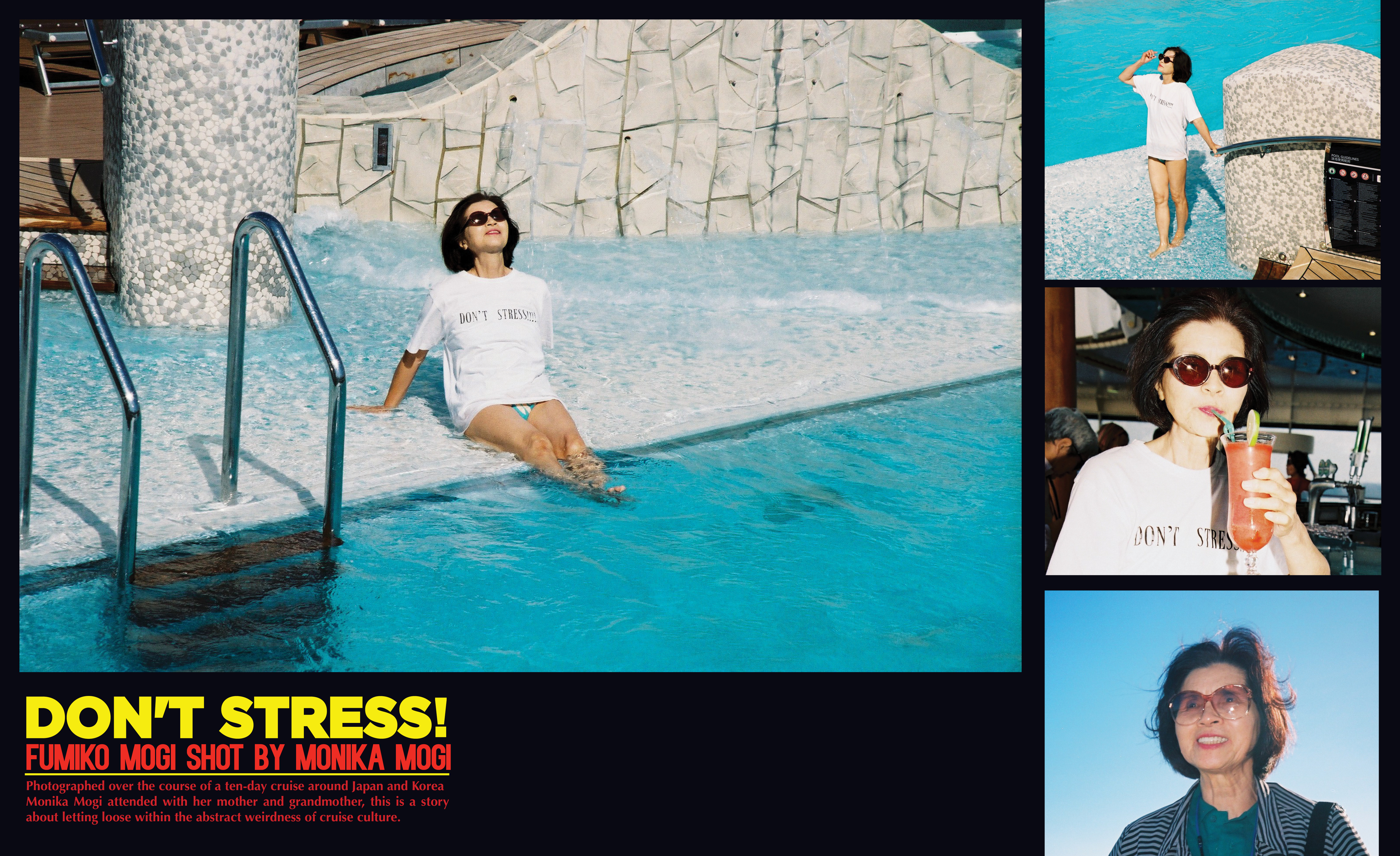 “Monika [Mogi]’s pitches are always unexpected, like a fashion story about construction workers, or a photo essay about her inventor Grandfather. Monika told us she was going on a ten-day cruise around Japan and Korea with her mom and grandma and she wanted to document it for issue 19. ‘Don’t Stress’ touches on so many themes, it’s a generational story celebrating family and age, and also a closer look at the bizarre culture of cruise ships. There’s something apocalyptic and weird about these massive ships with swimming pools, casinos, and shopping malls.”