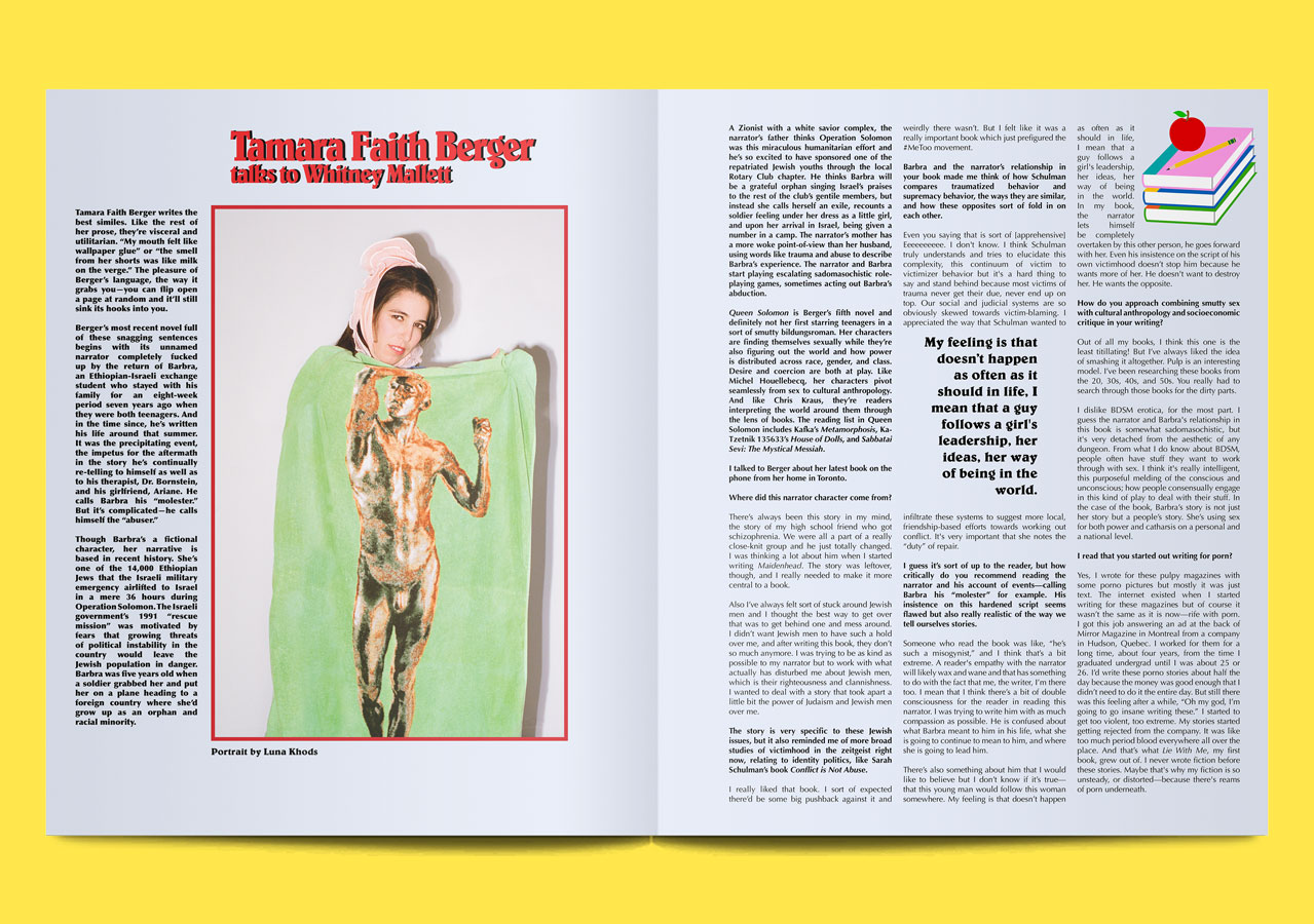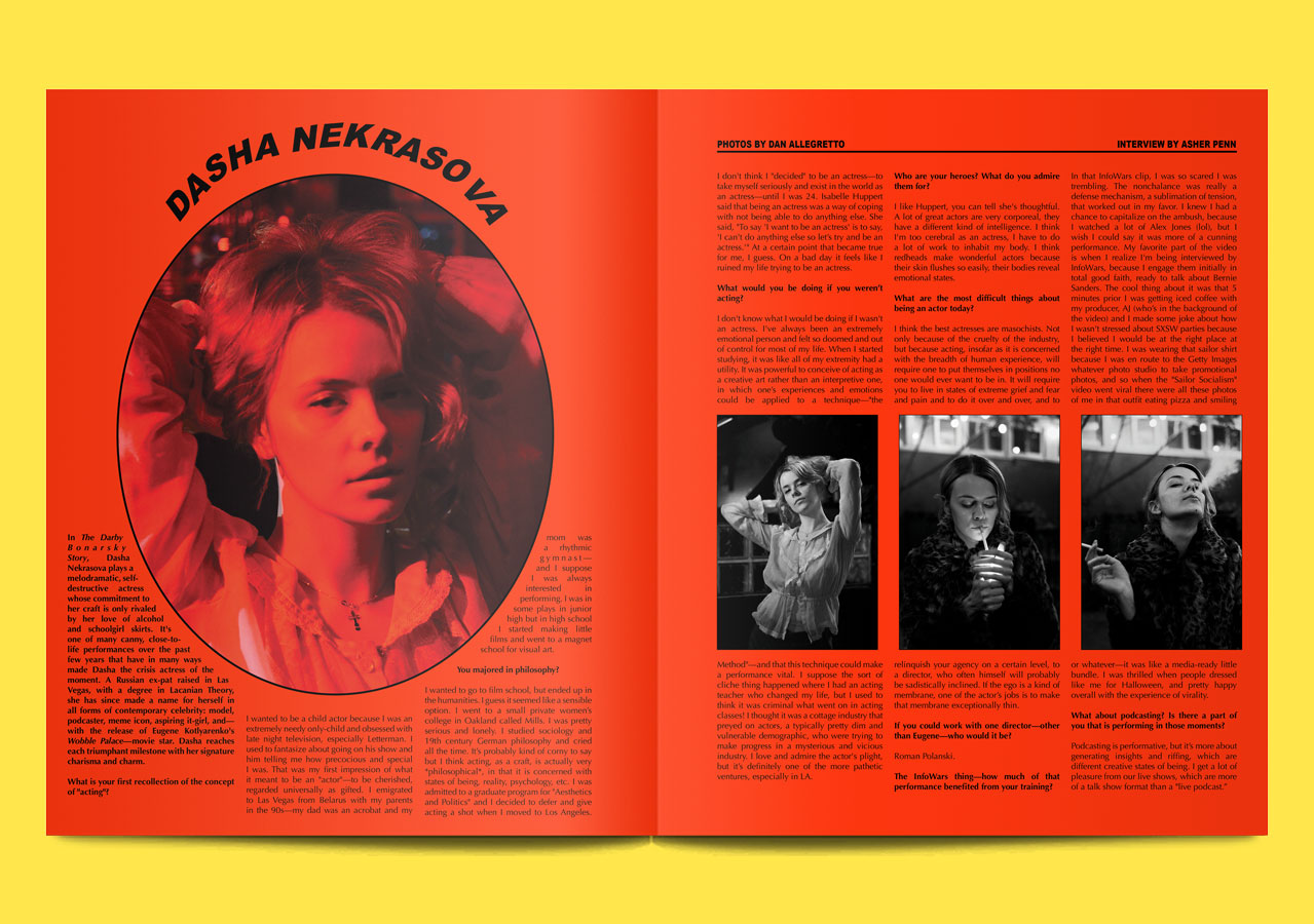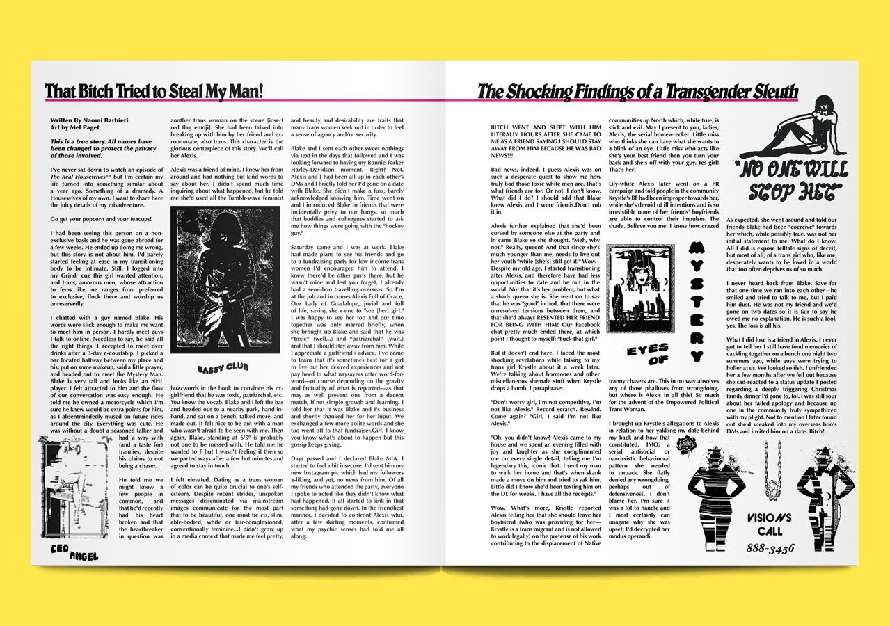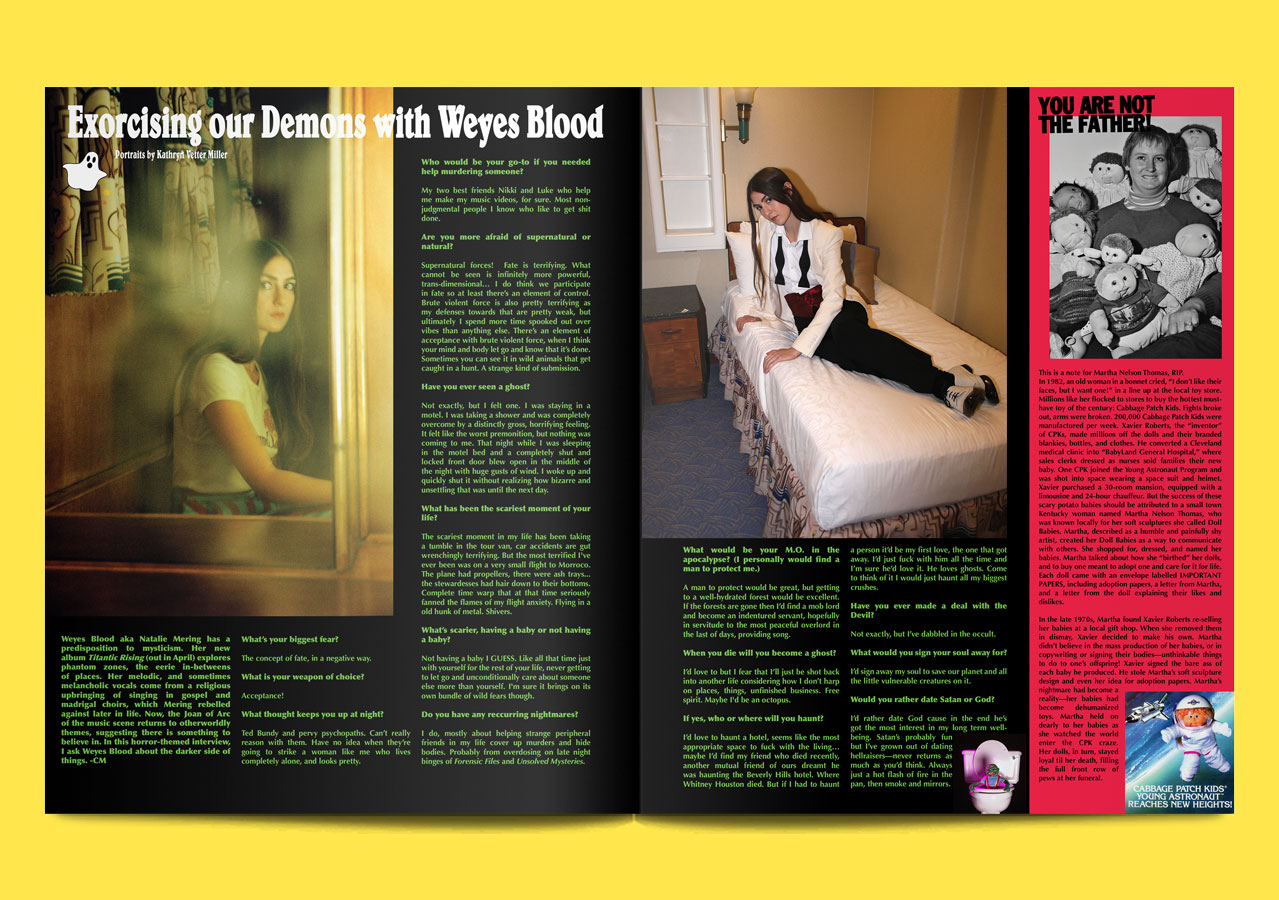 Though it’s technically a magazine about fashion and art (like many, many other magazines), Editorial’s content feels viscerally new. Artist Q&A’s morph, unexpectedly, into something else entirely; an interview with Julie Curtiss, for example, is cut through with the myth of Gorgon Medusa, and the Jungian psychology that underpins Curtiss’ dark, tactile work. Written through pieces are similarly experimental: a recipe for minestrone comes couched within a grandiloquent monologue about the end of the world; a ‘true story’ about betrayal reads like a stream of consciousness, and is titled “That Bitch Tried To Steal My Man!”