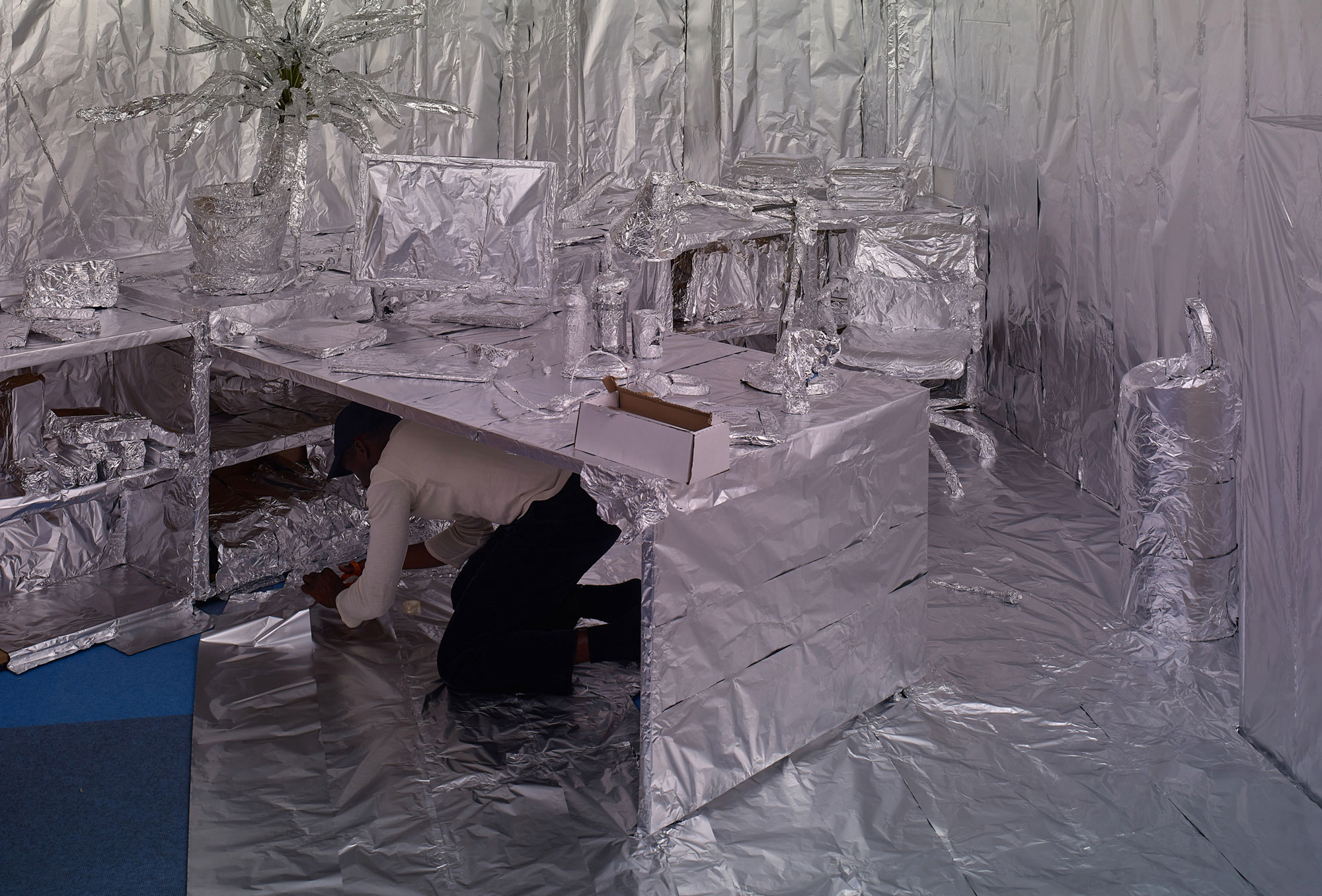 We covered the whole of our friend’s office in Amsterdam in tinfoil. We wrapped everything. But the final image came out a little cold with all that foil, so we decided to put a human in the frame. Another friend, Alexander, became a model. Mathijs Labadie did the photography.