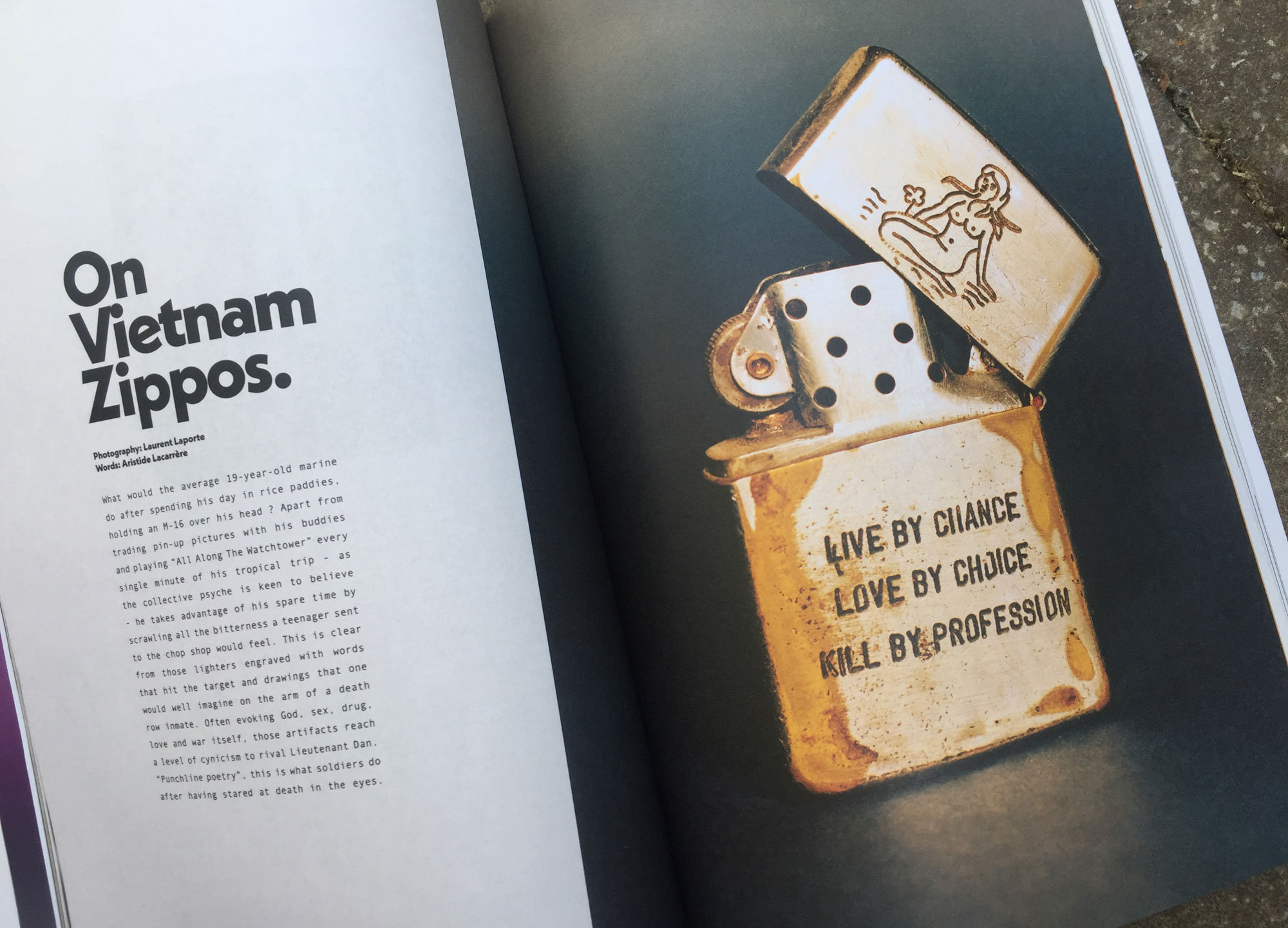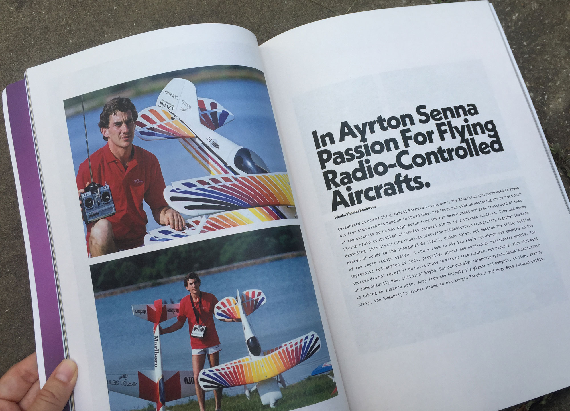 Thankfully, there’s still plenty in here you can’t buy. One spread is devoted to the “punchline poetry” of old Vietnam zippos. Accompanied by a picture of a rusted silver lighter, engraved with the lines: “Live by chance/ love by choice/ kill by profession” — the text tells the story of how traumatised soldiers would use their lighters to scrawl out “all the bitterness a teenager sent to the chop shop would feel”. Another excellent entry is all about the iconic race-car driver Senna’s passion for flying tiny remote-controlled aeroplanes.