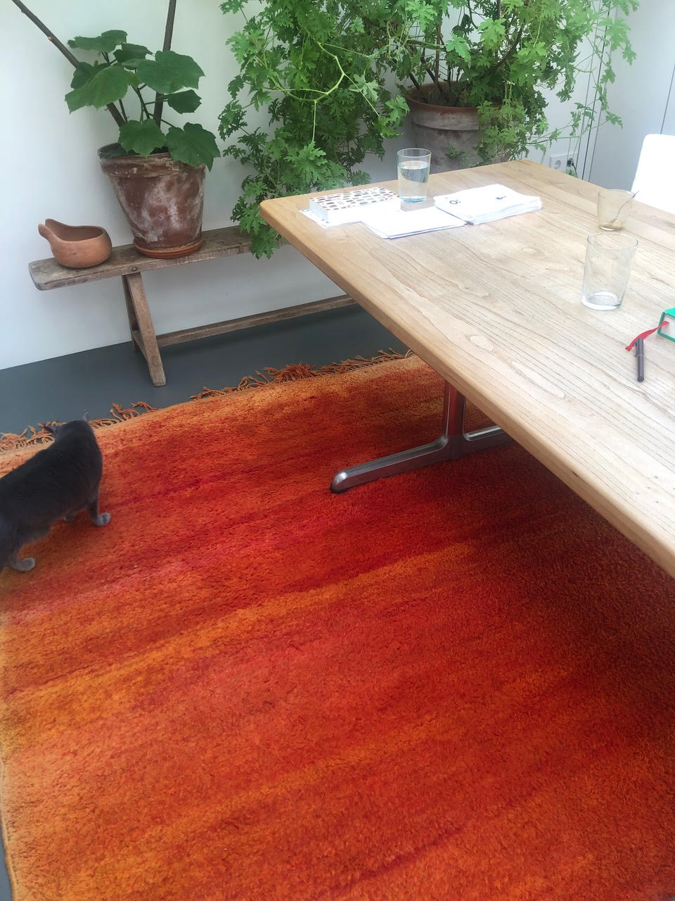 “I bought this rug in a Moroccan souk 15 years ago, from a region very high in the Atlas mountains where rugs are thick and warm and very red or orangey. When we arrived back home in Amsterdam it was already there waiting for us. It was just after Christmas and it was such a festive moment unwrapping it: this thick orange carpet with little pieces of hay in it from the home it had been in before! It lives underneath the kitchen table — that’s a dangerous place for a rug to be. And I have to share it with my two cats who see it as their territory. They’re quite old and a bit demented, and they use the rug as a scratching pole, as well as for other things. Sometimes! The cats are a little stressed by the whole situation as well. They are at home with us all day right now. We are in their home. I can see they’re a bit fed up with us.