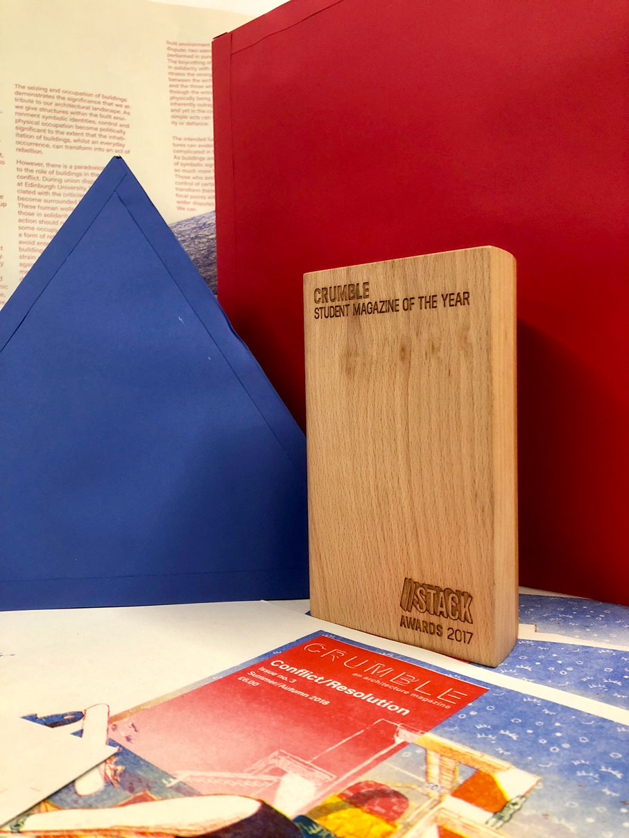 Crumble’s award proudly takes its place in our small office in Edinburgh University’s architecture department. It sits atop a couple of misprints of our latest issue, one that we’re very excited to share soon!