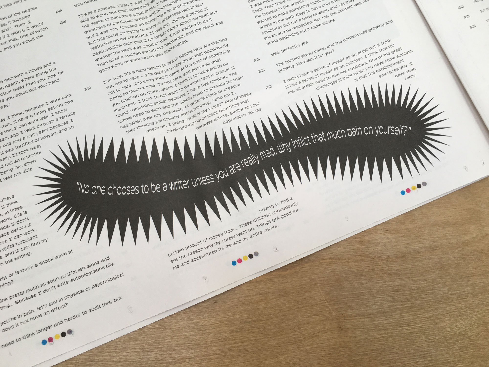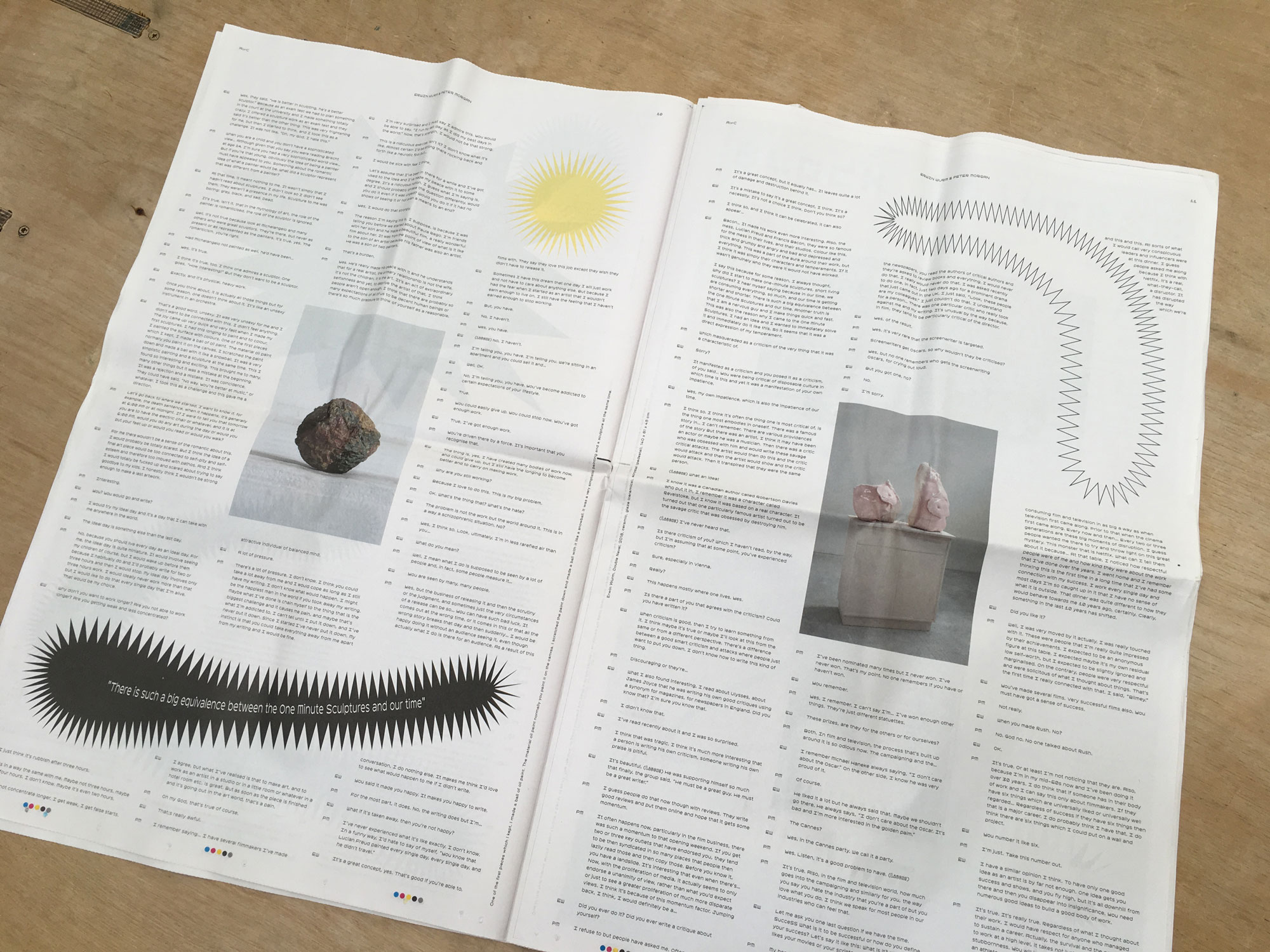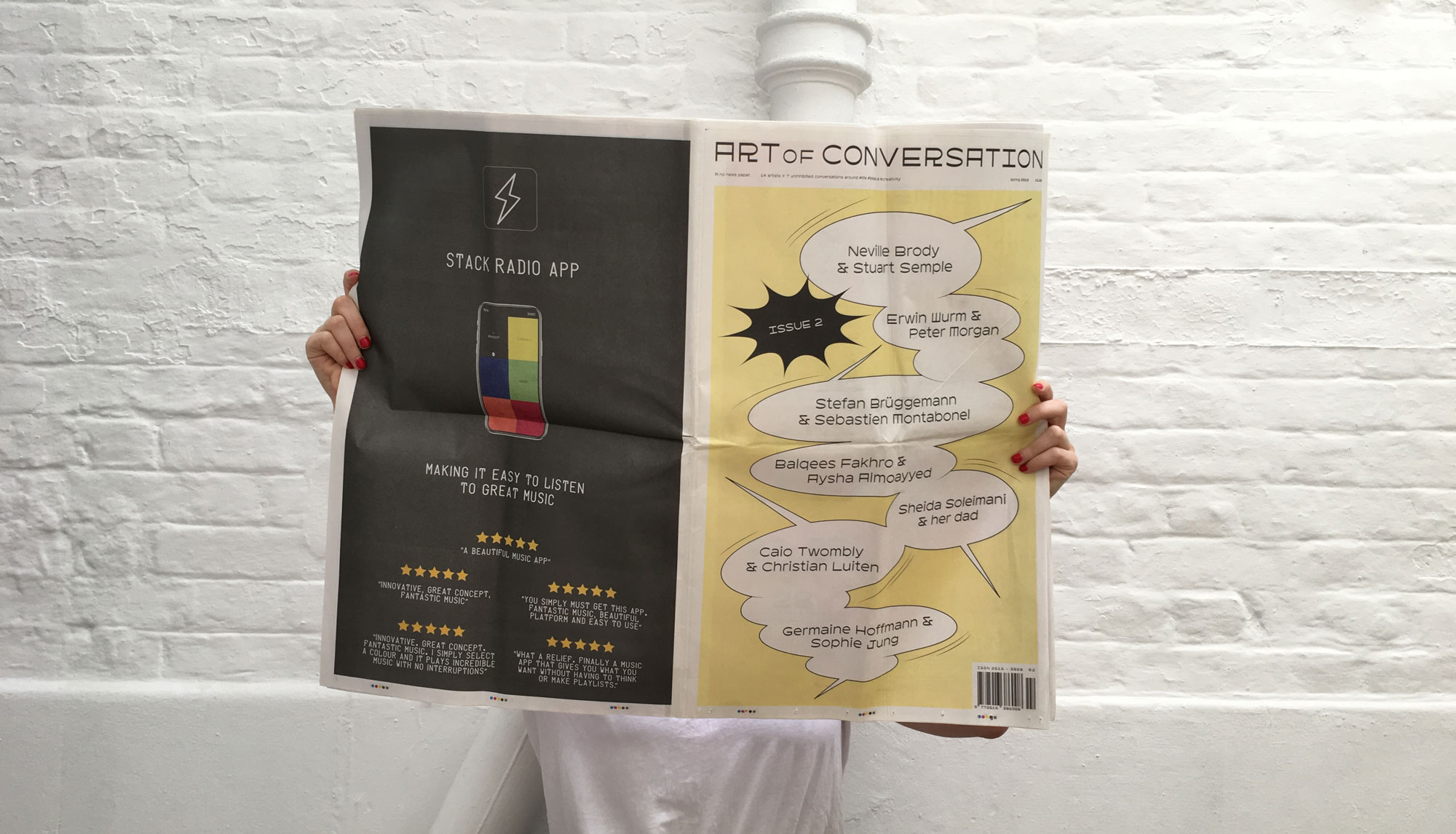 Designed like an old-fashioned broadsheet newspaper, the most striking thing about The Art of Conversation is its size: every page-turn becomes a ginormous undertaking, as you get twisted up in the paper’s folds, and big swathes of its insides fall out. Opening the whole thing out and starting to read makes you nostalgic for the time when all the Sunday papers were this much hassle. But it’s also strangely jarring, because there are no op-eds and headlines and front-page features on these pages: The Art of Conversation is entirely made up of Q&A’s.