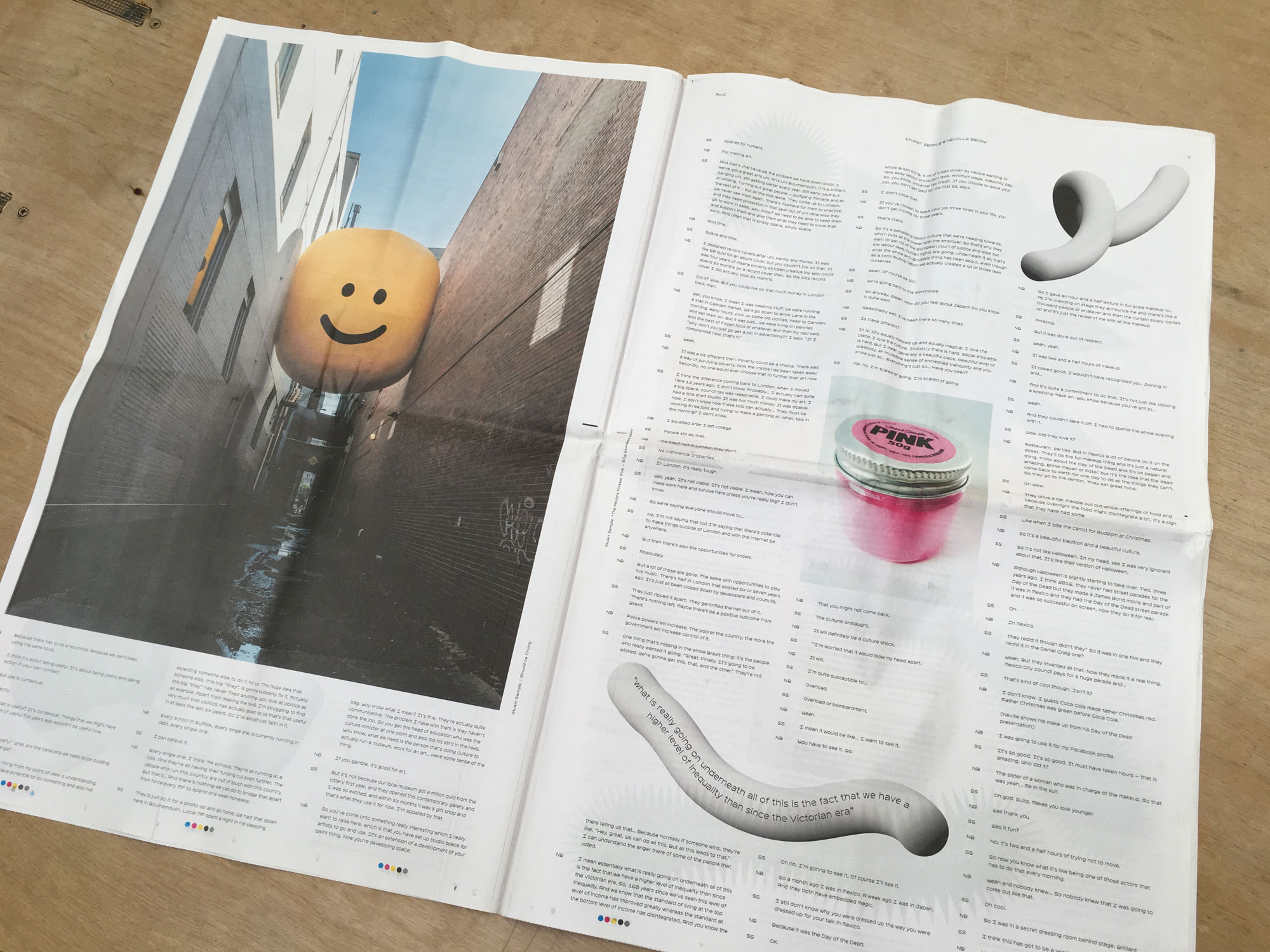 Serious quotes are pulled out in spikey speech bubbles, and the large format provides ample space for photos, which are unusually tactile: a man is shown arranging three fat oranges using only his forehead; a huge yellow smiley face ball is pictured squished between two buildings on a narrow street. It’s as though, to make up for trapping something as immediate as a conversation on the printed page, the reading experience has been transformed into something extravagantly physical.