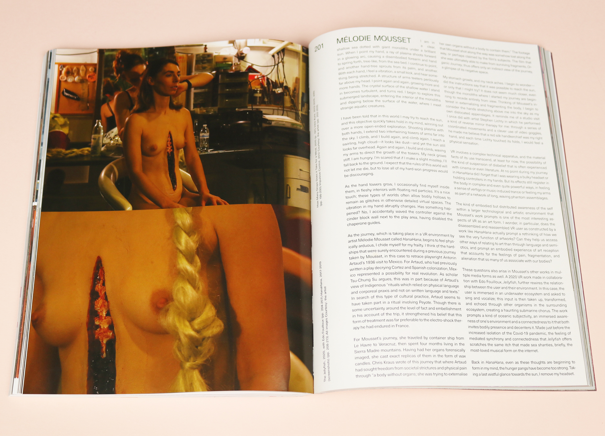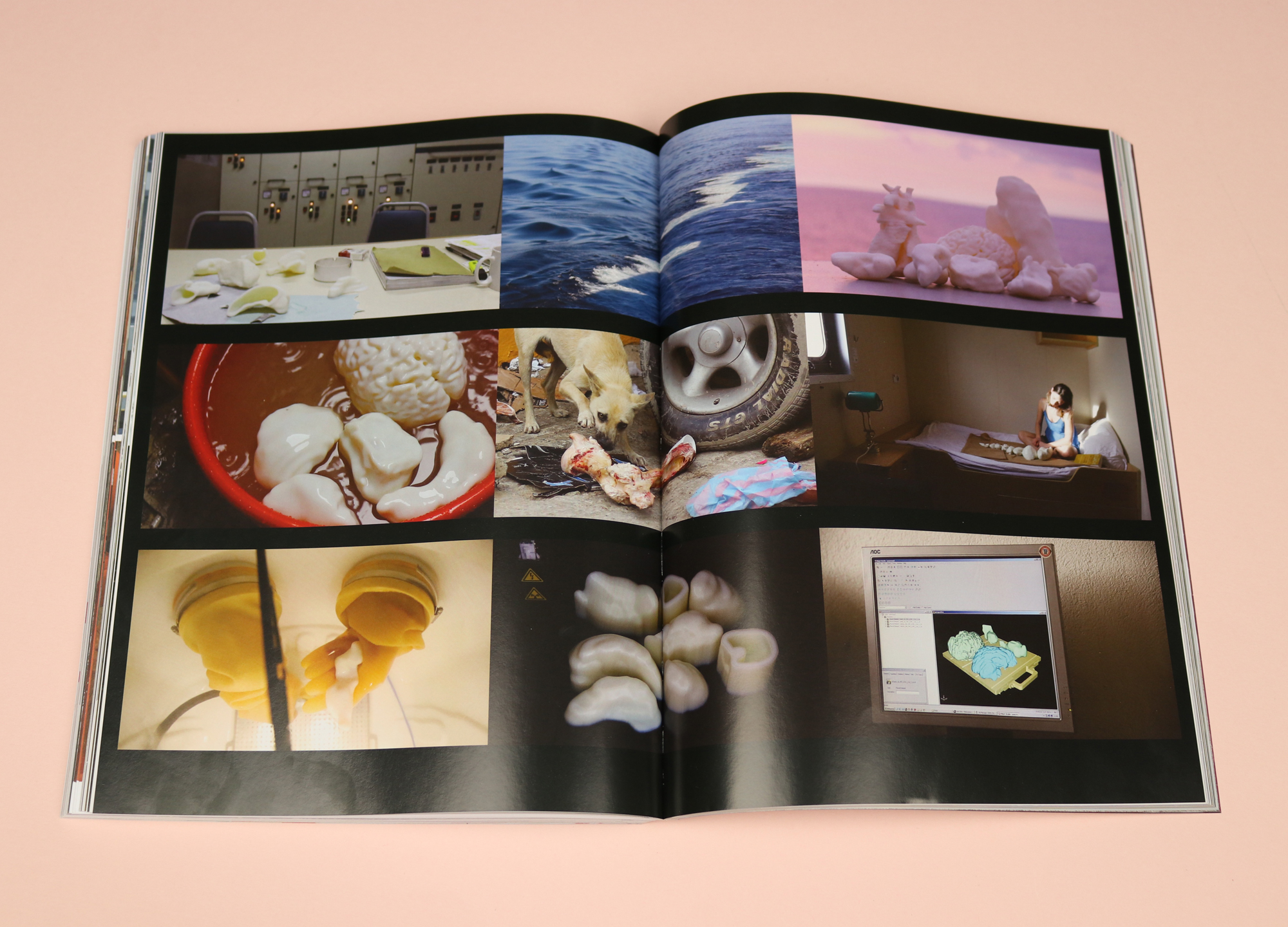 Cura is an experimental arts magazine that is occasionally so gruesome it is difficult to look at. One particularly difficult feature profiles the work of the French virtual reality artist, Mélodie Mousset. In what is perhaps her most challenging work, Mousset had her own internal organs scanned and then reproduced as wax candles. She then travelled to the Sierra Madre mountains by boat, lived four months in the jungle with local healers, and eventually burnt her organ-candles inside a cave. Cura prints photographs of a digitally altered Mousset, her chest split open, so you can see her spine. We see a brain bubbling away in a bowl of water, and a dog gnawing on what looks like a human thigh bone. The fact that these images are virtually rendered doesn’t make them any less disturbing.