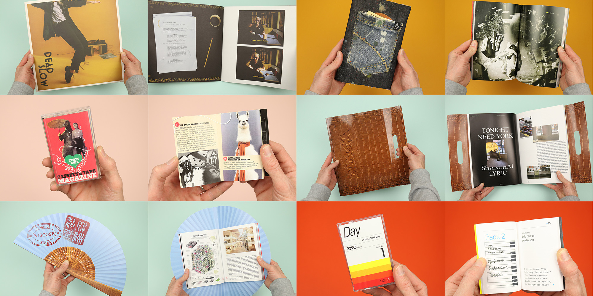 This version of skeuomorphism evokes the characteristics of something else in order to draw upon that object’s meanings and associations, and there’s a small and strange collection of magazines that parade themselves as other things. Carefully dressed up as cassette tapes, vinyl records or fashion accessories, they undergo a sort of shamanic transference of powers, assuming the significance of the objects they invoke, but undercut with the obviously ridiculous joke of a magazine that thinks it’s a bag or a back pocket. I wanted to take a closer look at this odd phenomenon in action, so I pulled some examples from the Stack archives to see the different ways these magazines present themselves to the world.