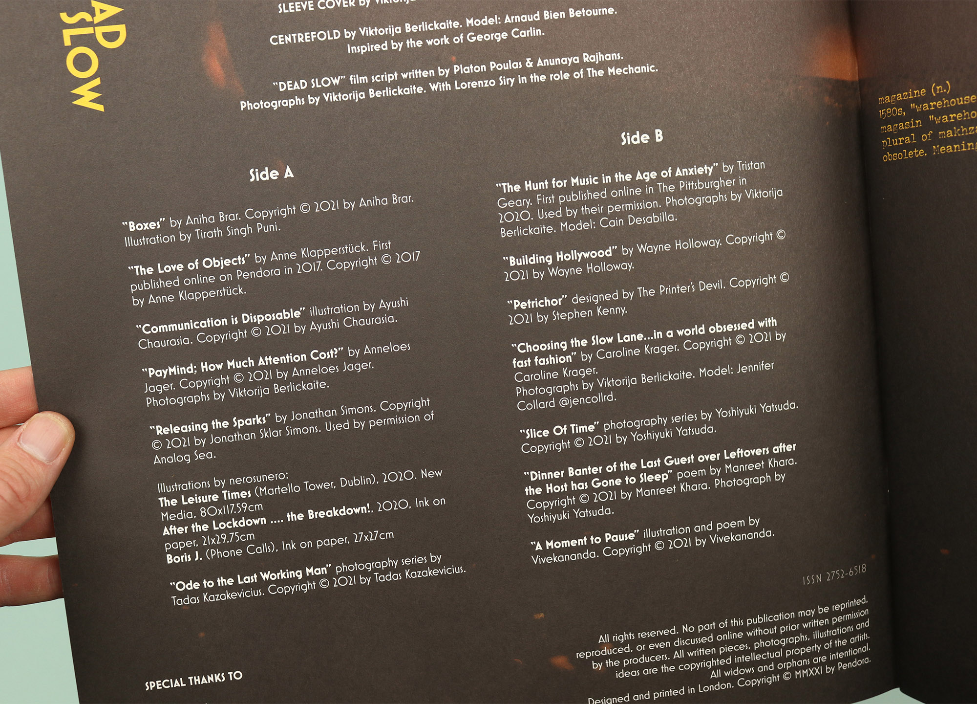 When I started thinking about this post I assumed there were going to be loads of magazines that dressed themselves up as vinyl records, but when I started searching the shelves the only one I could find was Dead Slow. It comes packaged in a slipcase, and makes use of several vinyl references, like the 33 ⅓ RPM on the cover and the idea of splitting the magazine in half and labelling them Side A and Side B.