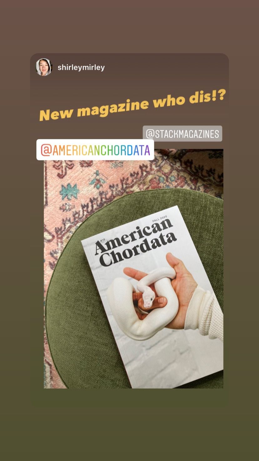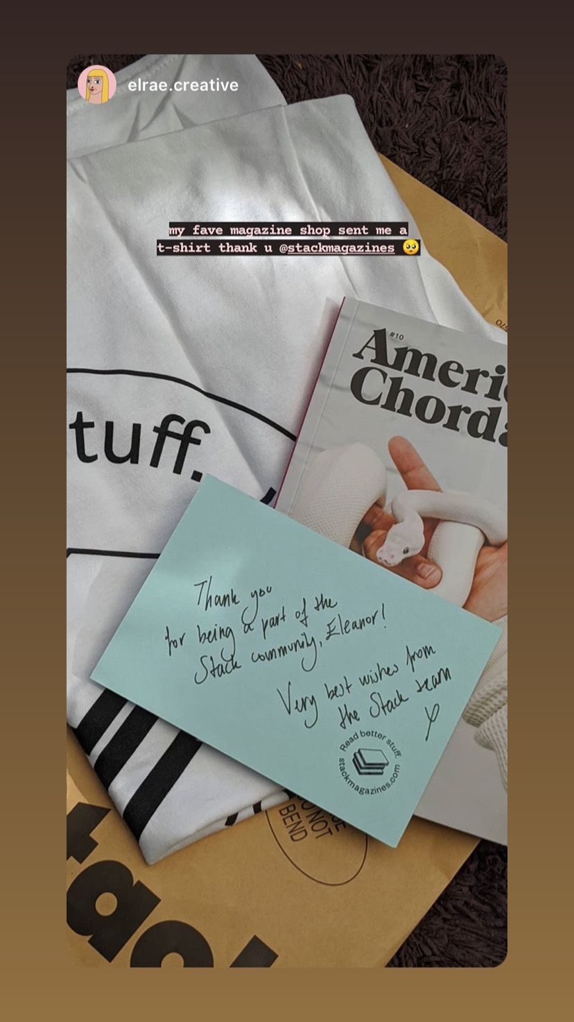 Stack subscriber Eleanor Rae photographs her copy of American Chordata, alongside a card from us and a money-can’t-buy Stack t-shirt.