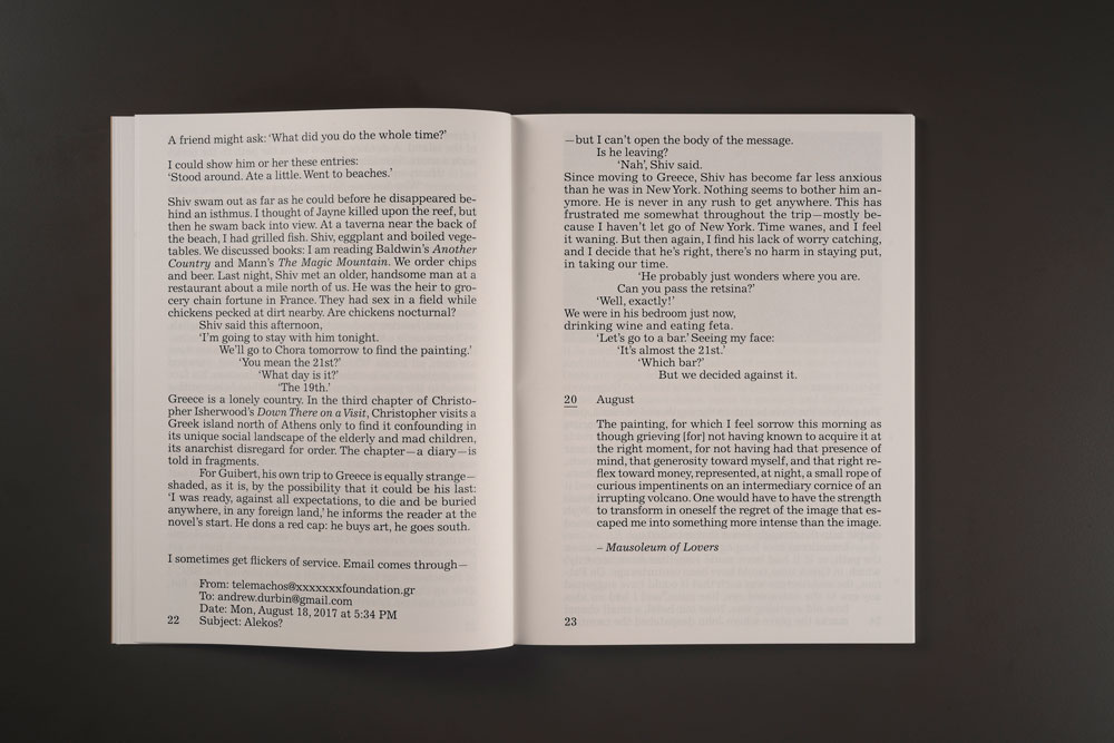 In a way, I think this obsession, or feeling of living in Guibert’s world is typified by Andrew Durbin’s short story Skyland, in which he travels from New York to Greece in search of a mythical painting of Guibert mentioned in his novel The Man in the Red Hat. For us, Guibert’s book Ghost Image hit our sweet spot: a transposition of a theory of photography on top of tracts of memoir.