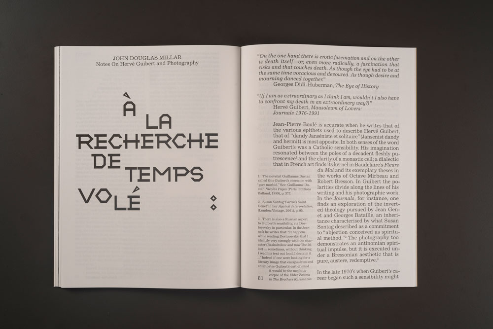 “Our first issue focuses squarely on the writer and photographer Hervé Guibert. It does seem wilfully uncommercial on the face of it. But we were certain the writing and artwork would have the power to affect a lot of people, such was its intensity, and the novelty of encountering it in the English for the first time. There’s a head of steam building on the importance of Guibert and his work, as well as a resurgence of interest in the AIDS activism in which Guibert played a role — especially with groups like Gran Fury, Act Up and General Idea. The feeling for him is so intense and his work feels wholly idiosyncratic, in particular as a proponent of ‘auto-fiction’, something that is more and more relevant to contemporary fiction. This, coupled with the fact that the catalogue of his work is relatively unknown outside of France, made it a simple decision.
