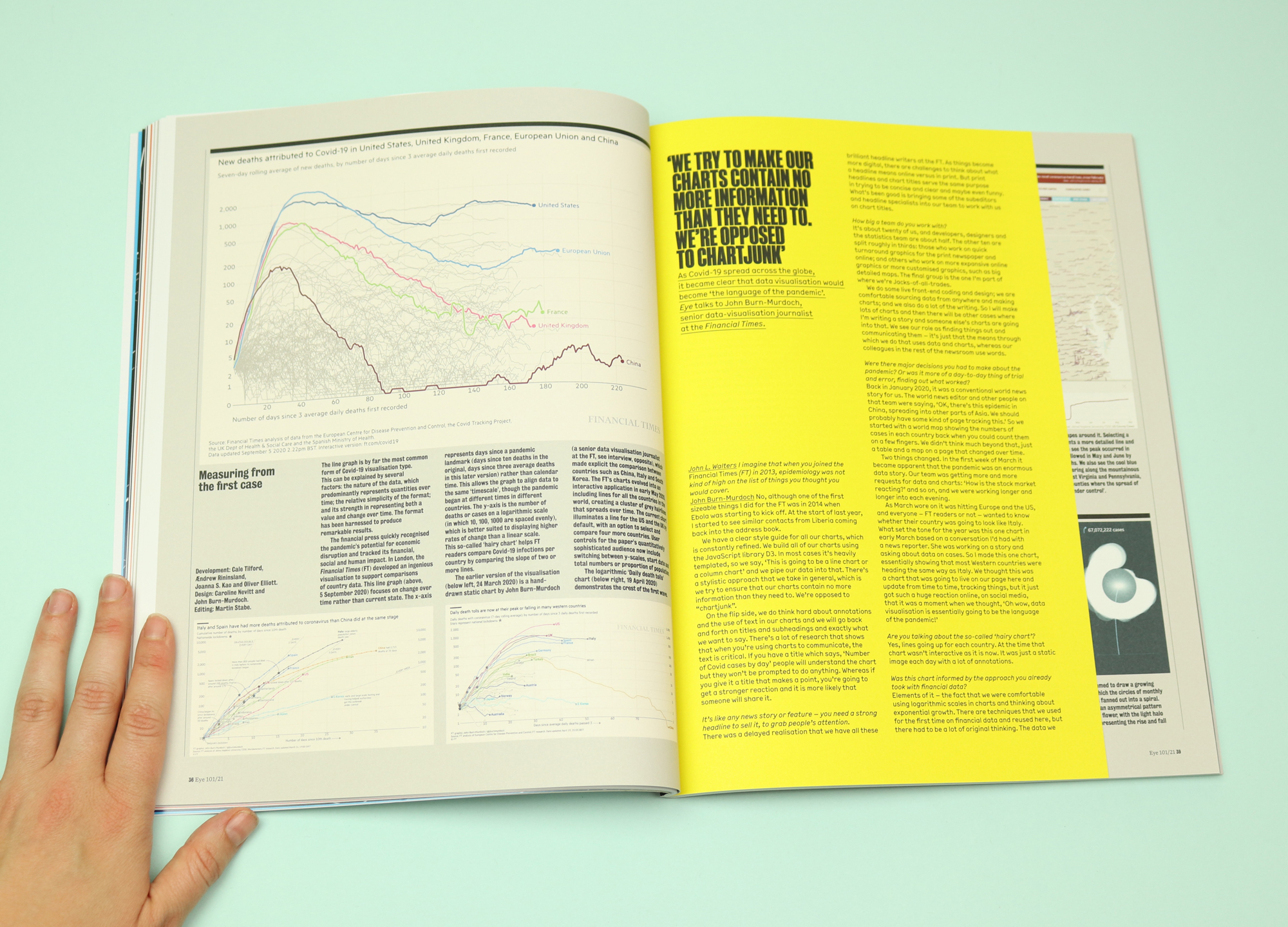 The leading feature in the issue, by Paul Kahn, offers a comparable exploration of the social significance of graphic design. Entitled ‘The Pandemic That Launched A Thousand Visualisations’, this is a dissection of the designs that became integral to communicating the facts of the pandemic to the public: from bubble maps, to ‘scrollytelling’, to ‘flowers of fatality’.