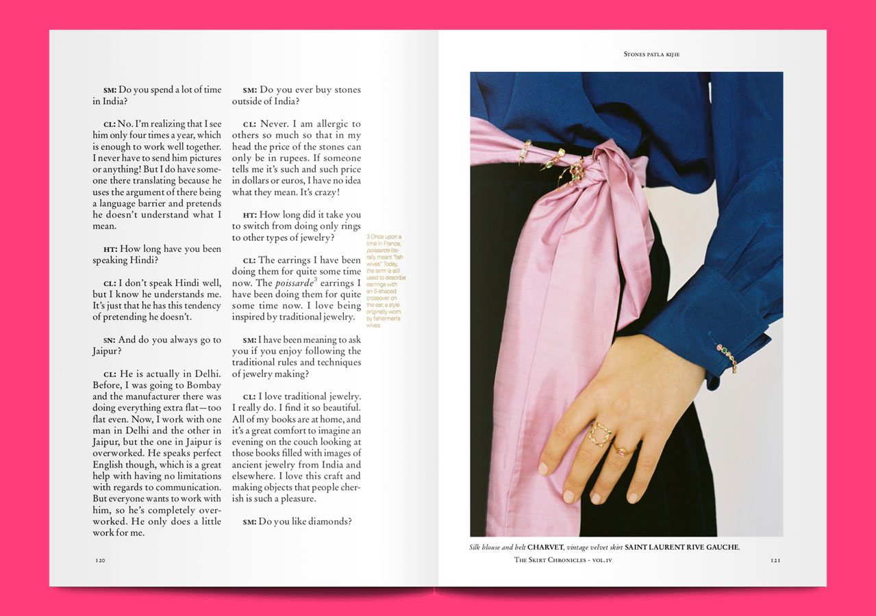 The latest issue of The Skirt Chronicles opens with a story about someone caught in a love affair with two sisters. Short and strangely painful, it’s totally unlike anything you expect to find in a fashion magazine. What follows is a murder scene from The Godfather — “Leave the gun, take the cannoli” — disguised as a piece about Sicilian sweets. There are pictures of clothes (and skirts) on these pages, and they are delicious, but difficult to differentiate from the rest of the content, which is literary, and refreshingly quiet. An interview about Chanel beauty, for example, is accompanied by still lives of dried flowers, and netting. Not a Chanel logo in sight.