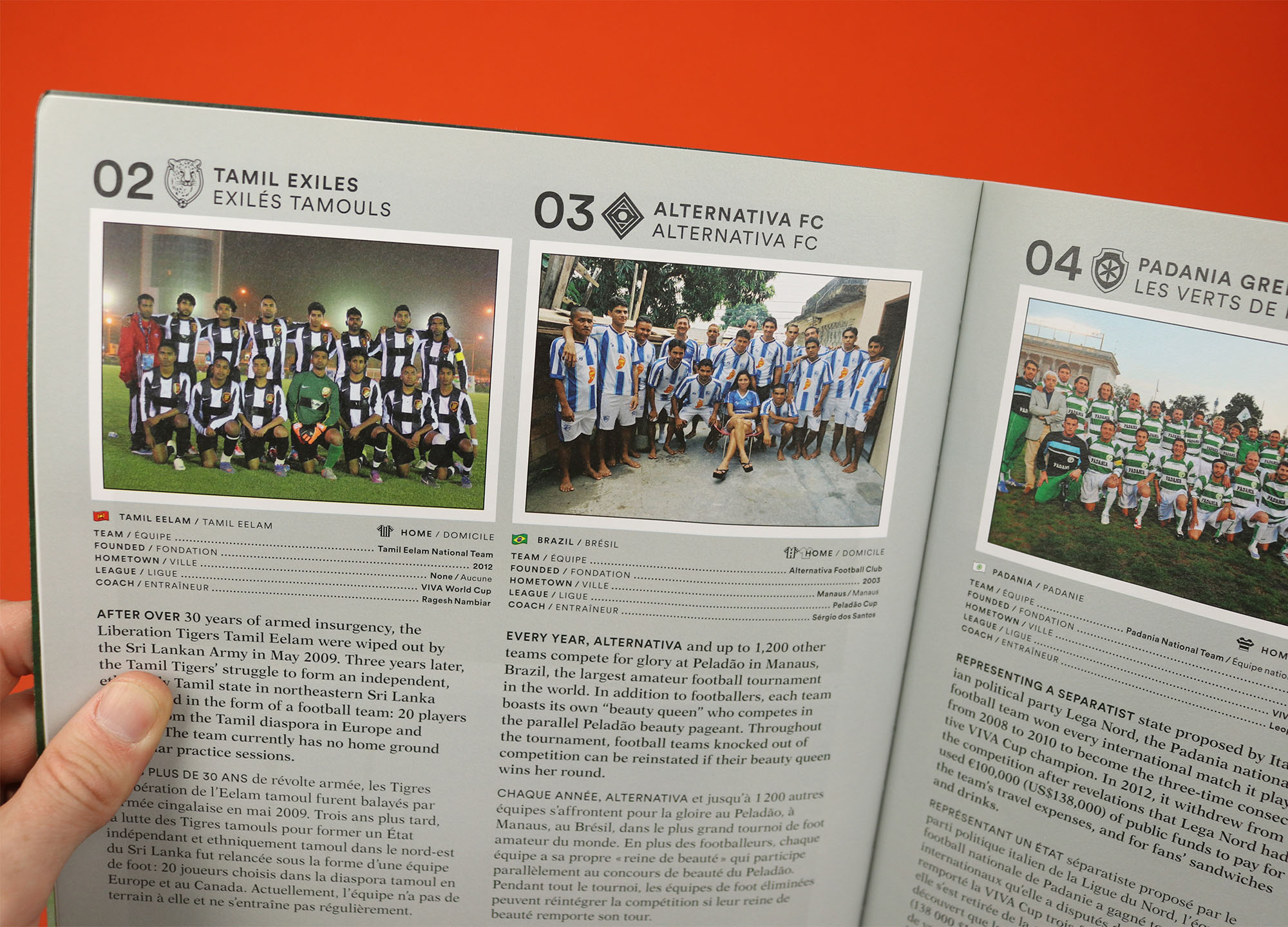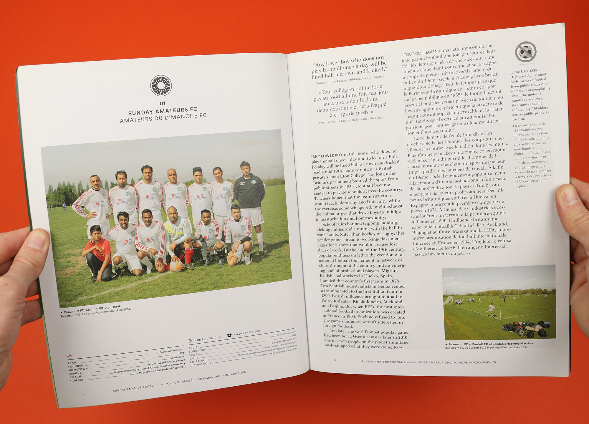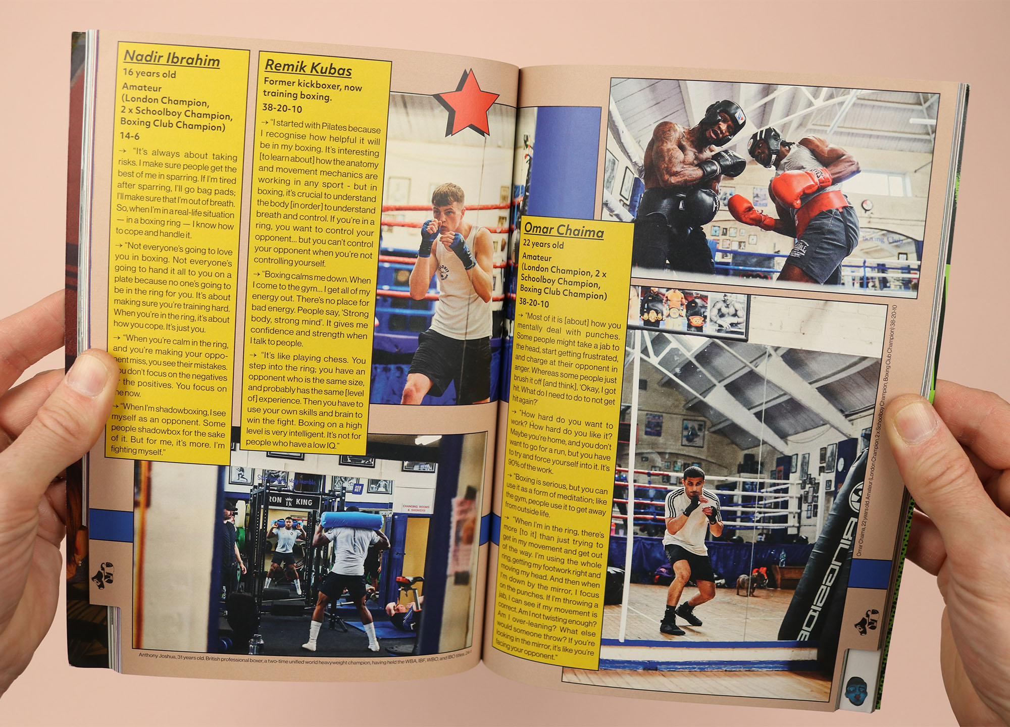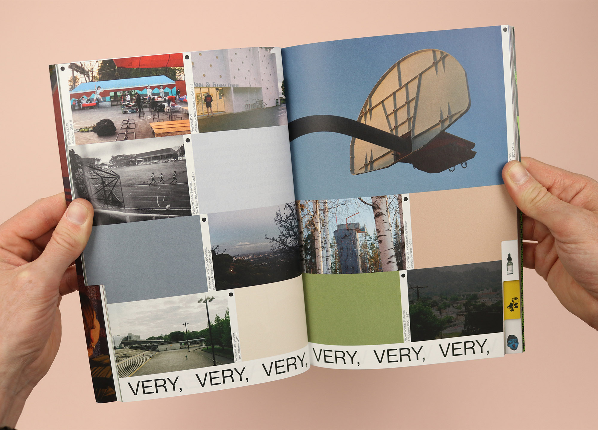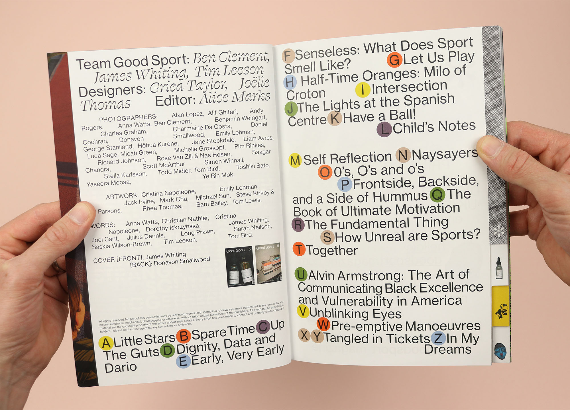 A sports magazine like no other, this fifth issue of Good Sport shuns page numbers in favour of an alphabetical order for stories. Sometimes the significance of the letter is obvious, like ‘E’, a photo story about people who get up ‘Early, Very Early’ to play sport. Other times the association is less clear, like ‘M’, a series of interviews with boxers at Finchley Boxing Club in London, who reflect on themselves and their sport, leading me to guess that the ‘M’ is for ‘mirror’? As a result the contents page looks sort of like a subway guide, with all the letters crowding together, and while it would technically be possible to navigate the magazine from there, the main method of wayfinding in the magazine is its tabbed pages, which encourage readers to jump forwards and backwards, rather than starting at the front and reading all the way to the back.