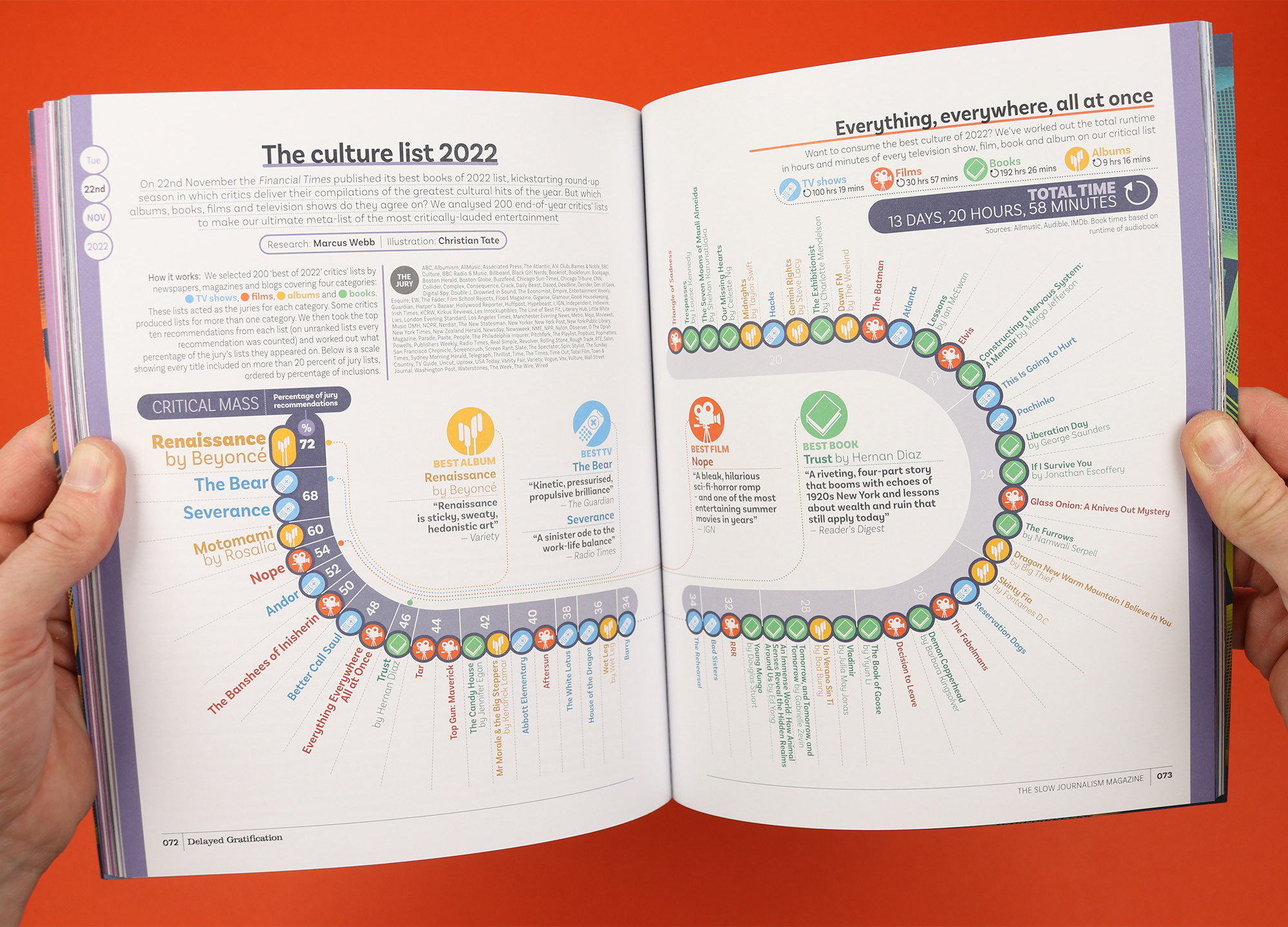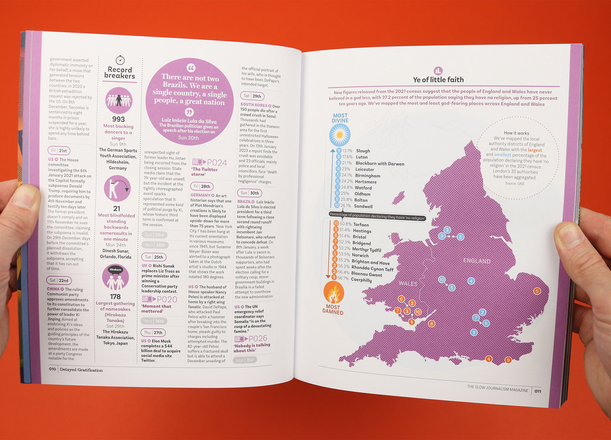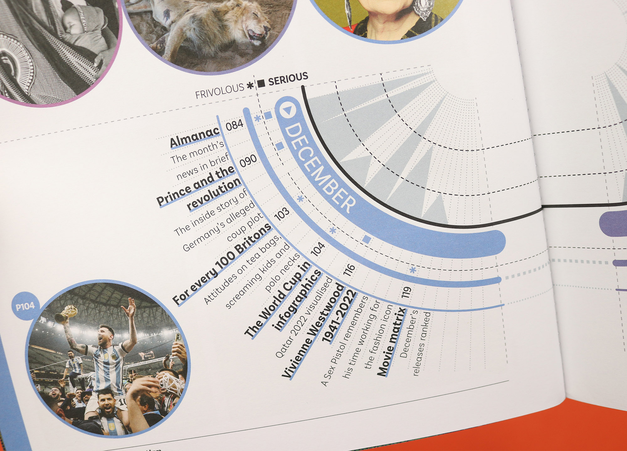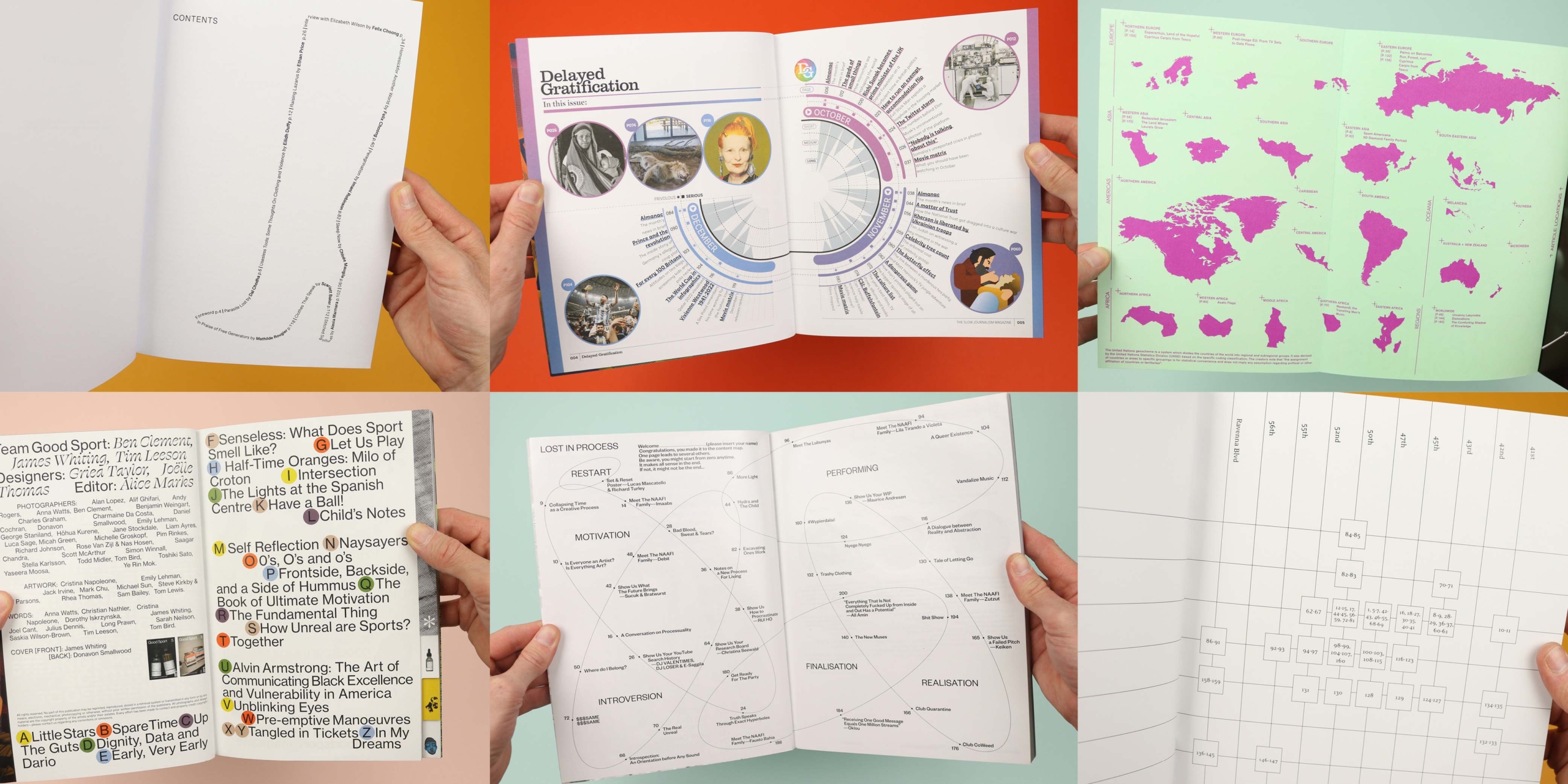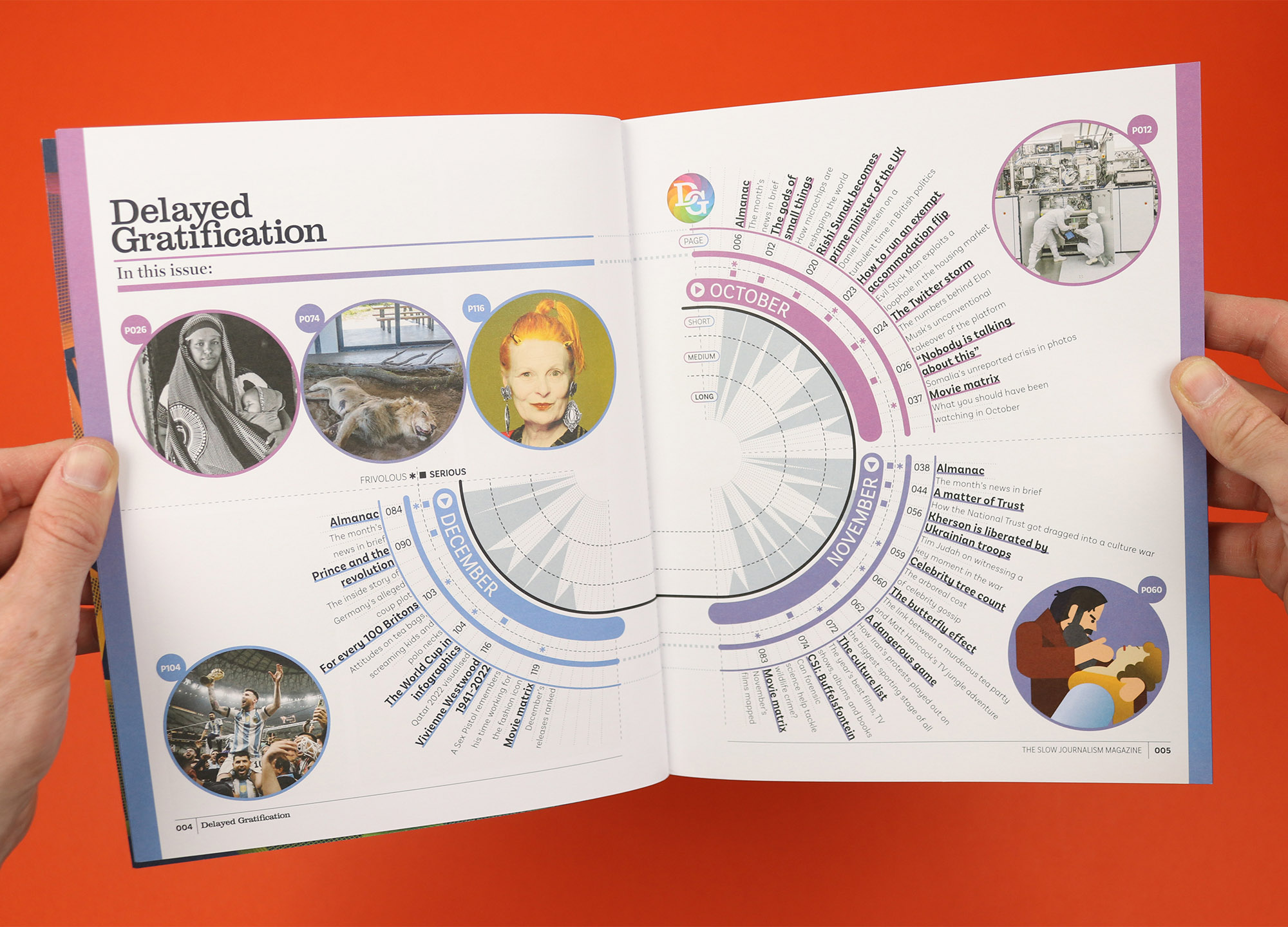 A magazine that looks back at the news after the dust has settled, Delayed Gratification orders its pages chronologically, allowing readers to flip through three months of stories each issue. So it makes perfect sense that the contents page is also arranged chronologically, but this is Delayed Gratification, so it doesn’t stop there. Because this slow journalism magazine is also renowned for its data visualisations, so as well as showing when the stories took place and where to find them, the contents page also gives readers an at-a-glance overview of how long the stories are, and how serious they are. I’m not sure whether anyone would really use that information to decide what they’re going to read, but it makes for a fantastic expression of the magazine’s obsessive interpretation of the news.
