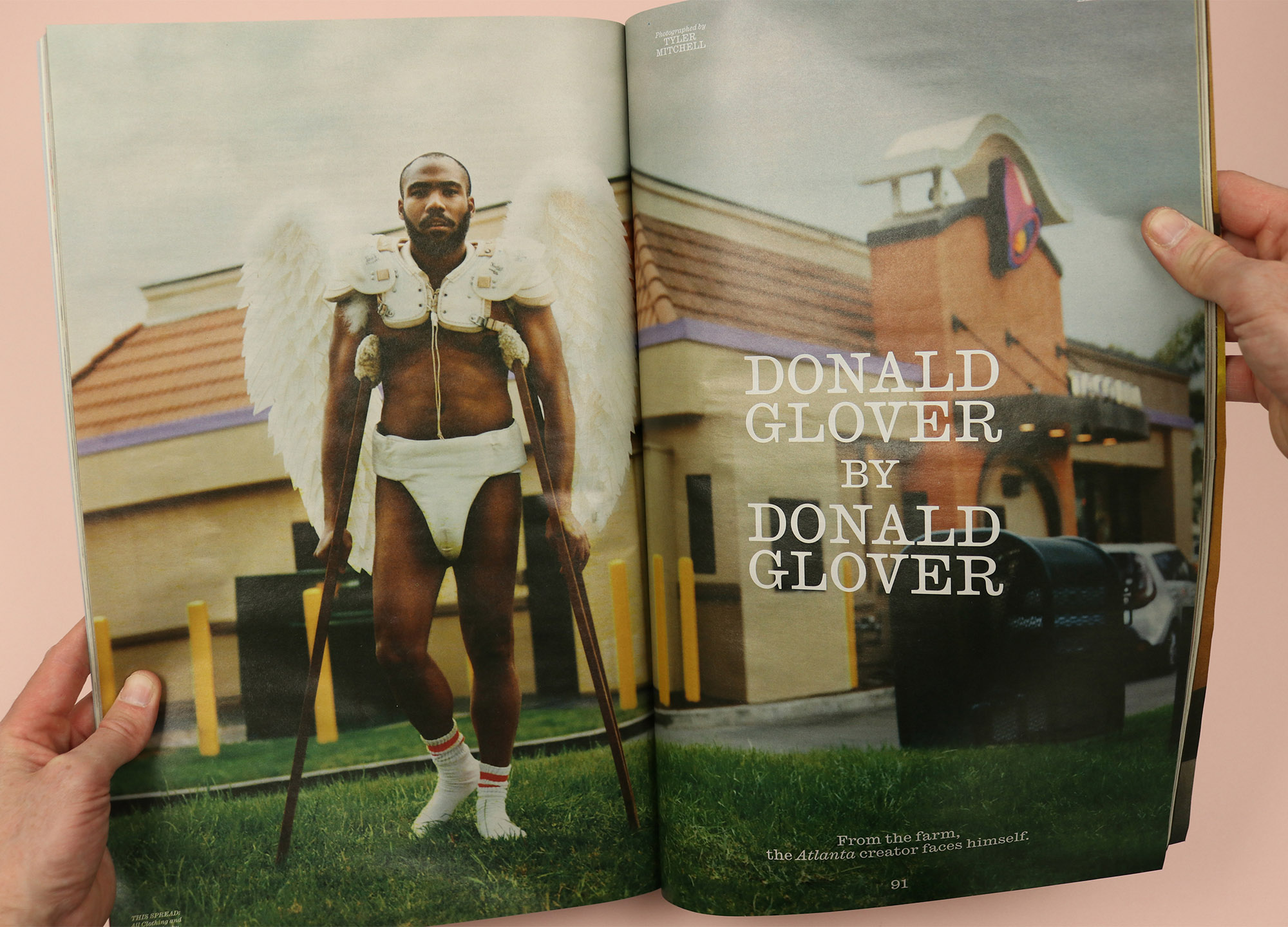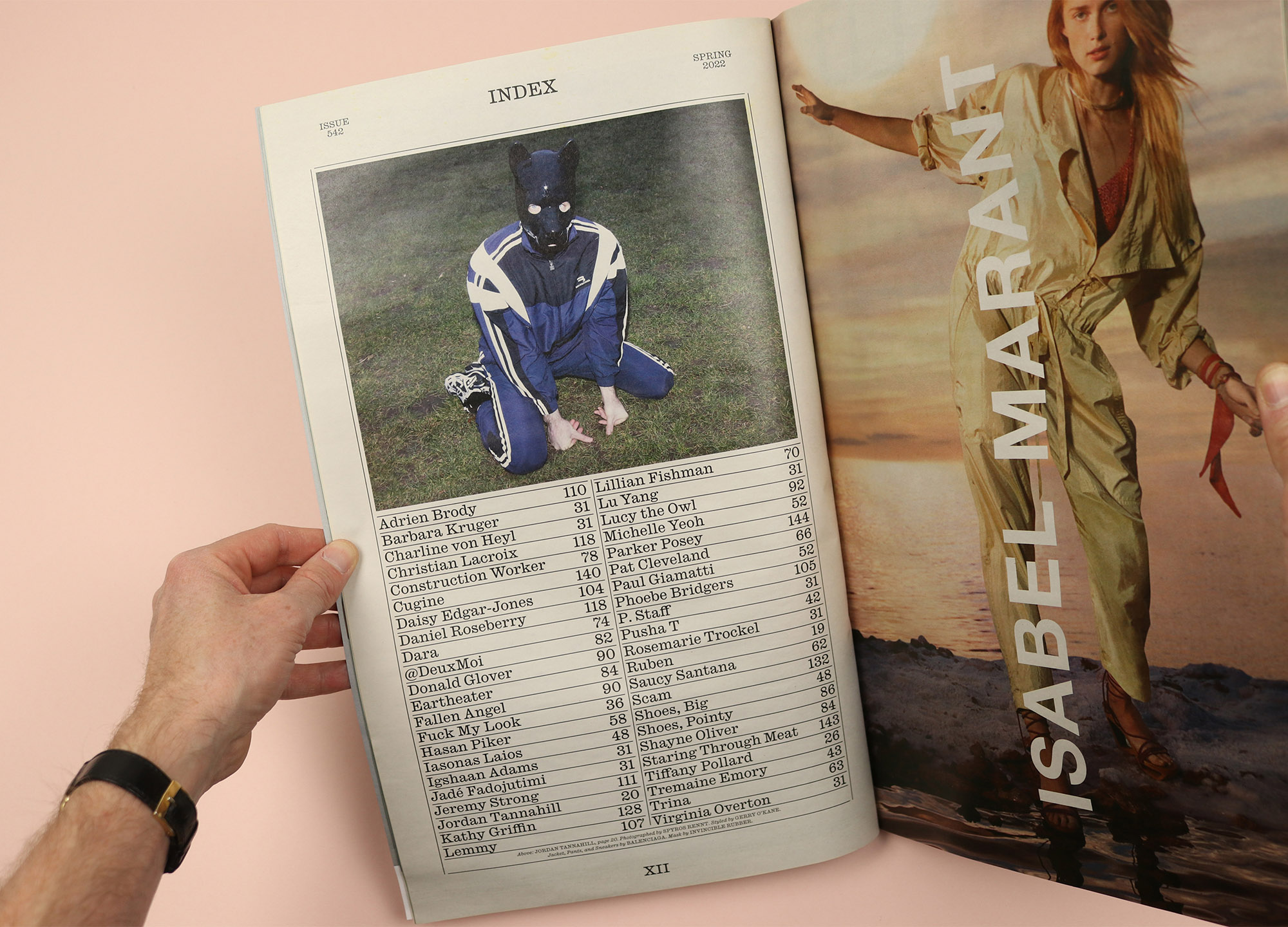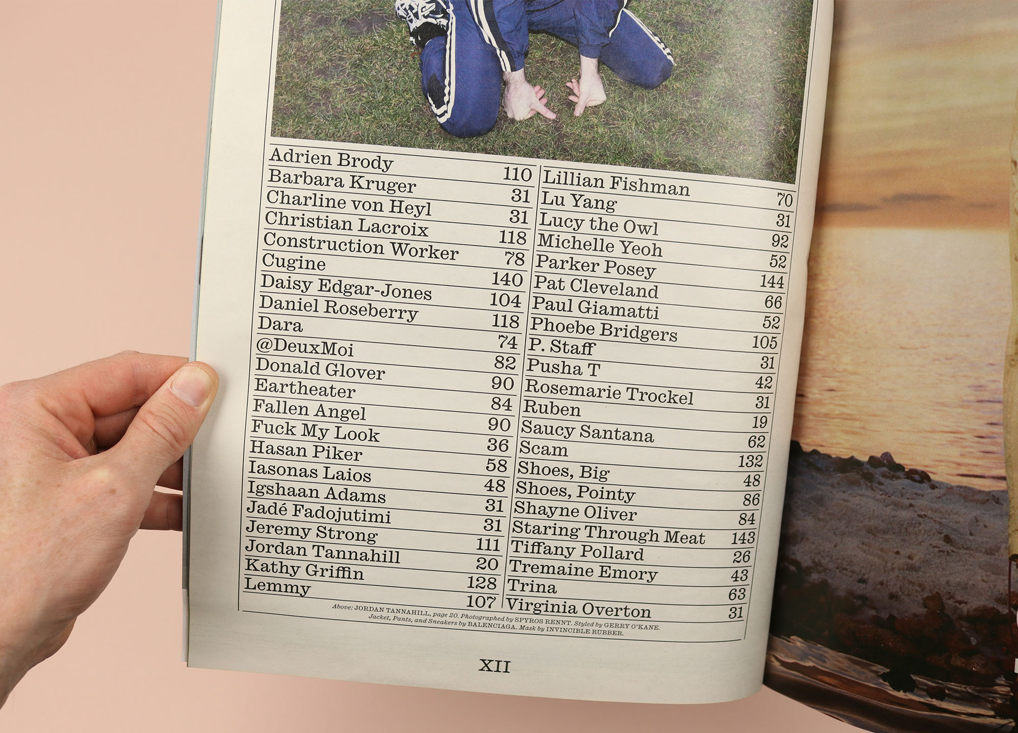 A magazine that has always been about big names, Interview’s contents page opts for a simple alphabetical order that means you can jump straight to the star interviewee or interviewer of your choice. Of course this isn’t all about straight-up practicality, though, and alongside the parade of famous and cool people is a sprinkling of funny and characterful additions, like Lucy the Owl, from Donald Glover’s cover shoot; Shoes, Big (page 48); and Shoes, Pointy (page 86).
