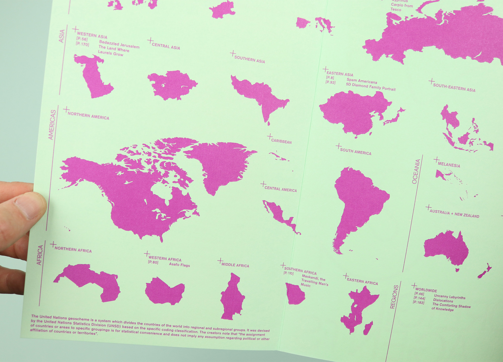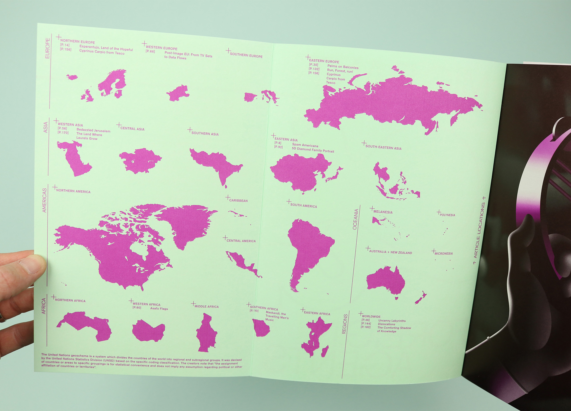 World maps are a common way for magazines to organise their contents pages, especially when they’re trying to show at a glance that their stories are gathered from all around the globe. Too often, though, those maps actually end up revealing the places that are not covered, with large blank spaces unintentionally showing how difficult it is to produce a genuinely global magazine. Migrant Journal played with this convention by splitting the world map up according to the regions and sub-regions of the United Nations geoscheme system. It means that readers of the final issue could see the magazine included stories from Northern Europe, Eastern Europe, and Southern Africa, for example, and also that there was nothing from North America, Central Asia and South America. But just as importantly, it allowed the magazine to repeat the note from the creators of the geoscheme; “the assignment of countries or areas to specific groupings is for statistical convenience and does not imply any assumption regarding political or other affiliation of countries or territories.” The same message appeared at the start of every issue, neatly establishing the magazine’s project of looking again at the existence of borders and what it means to travel across them.