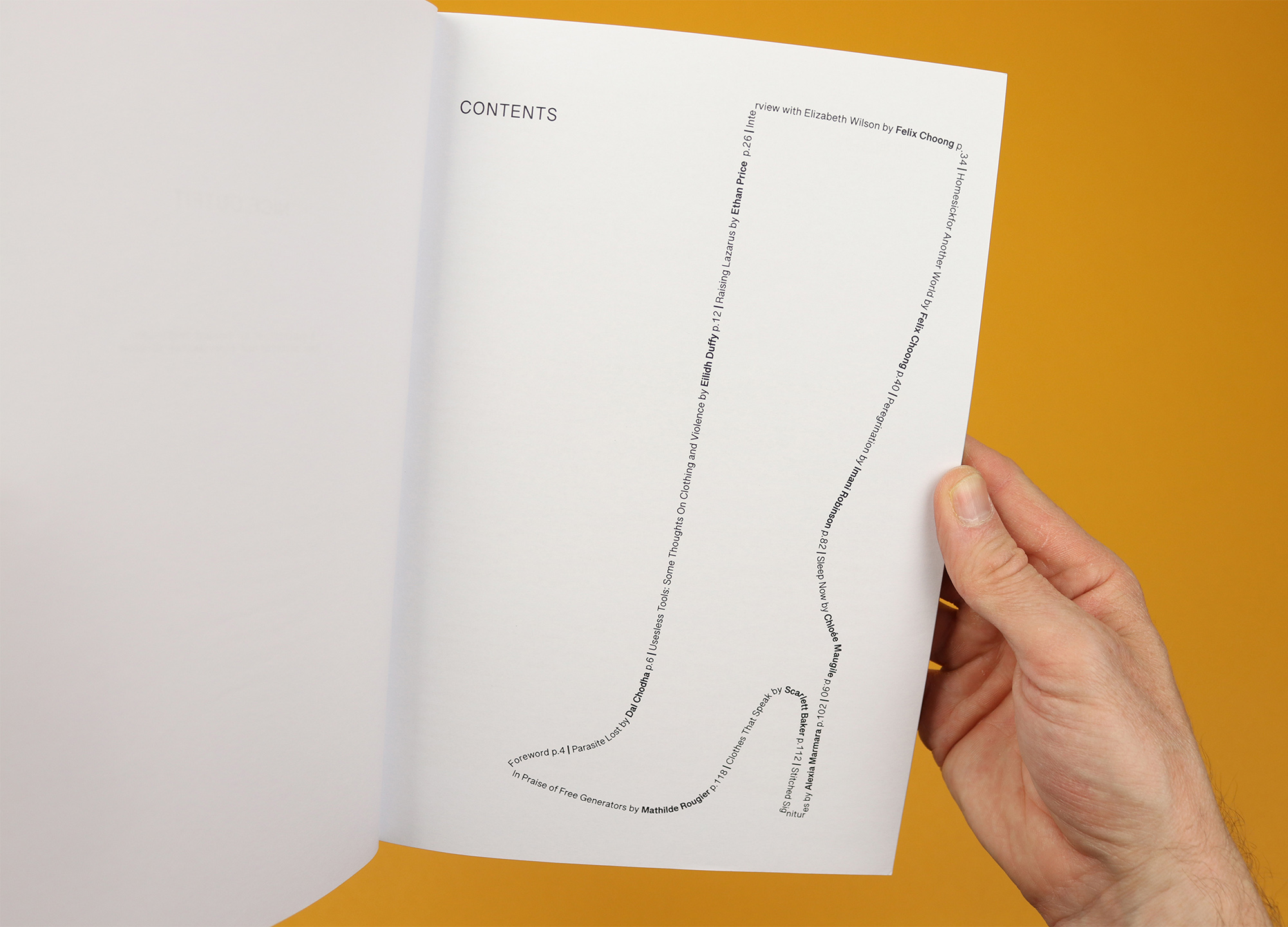 The self-described “publication on fashion criticism, body politics and experimental fiction”, Nice Outfit takes a playful and provocative approach to the fashion world, or as editor Felix Choong puts it in his foreword: “Fashion, like the people producing and wearing it, is hysterical and within this hysteria we arguably make our clearest assertions and most astute gestures towards the worlds we find ourselves thrust into.” Existing within the madness of fashion, the magazine is both intellectually rigorous and aware of its own ridiculousness, a contradiction that seems to be summed up by the unwieldy silliness of rendering the contents in the shape of a boot.