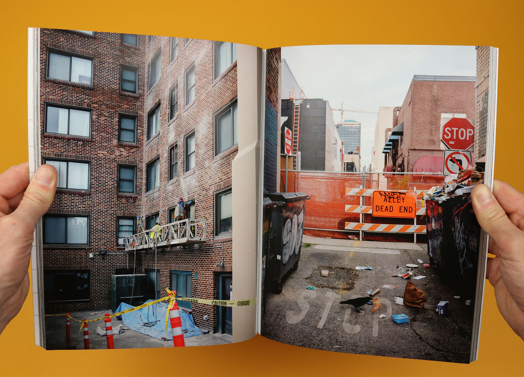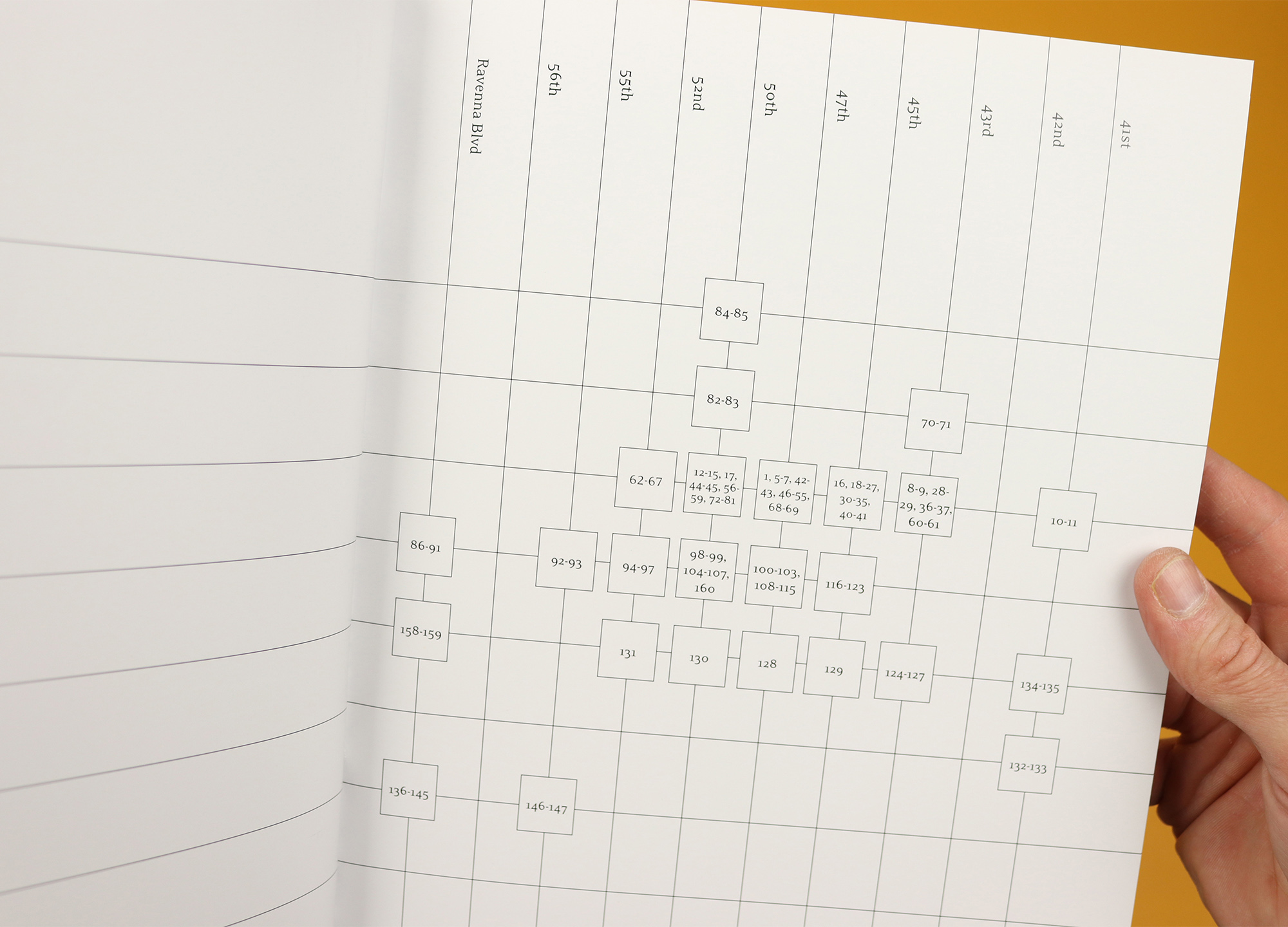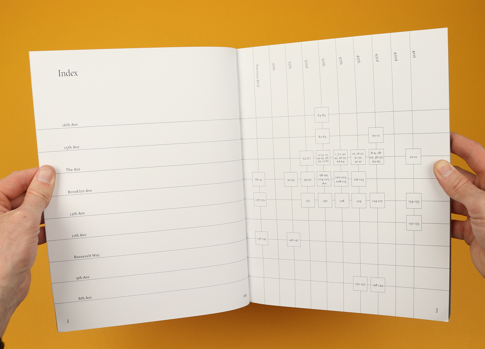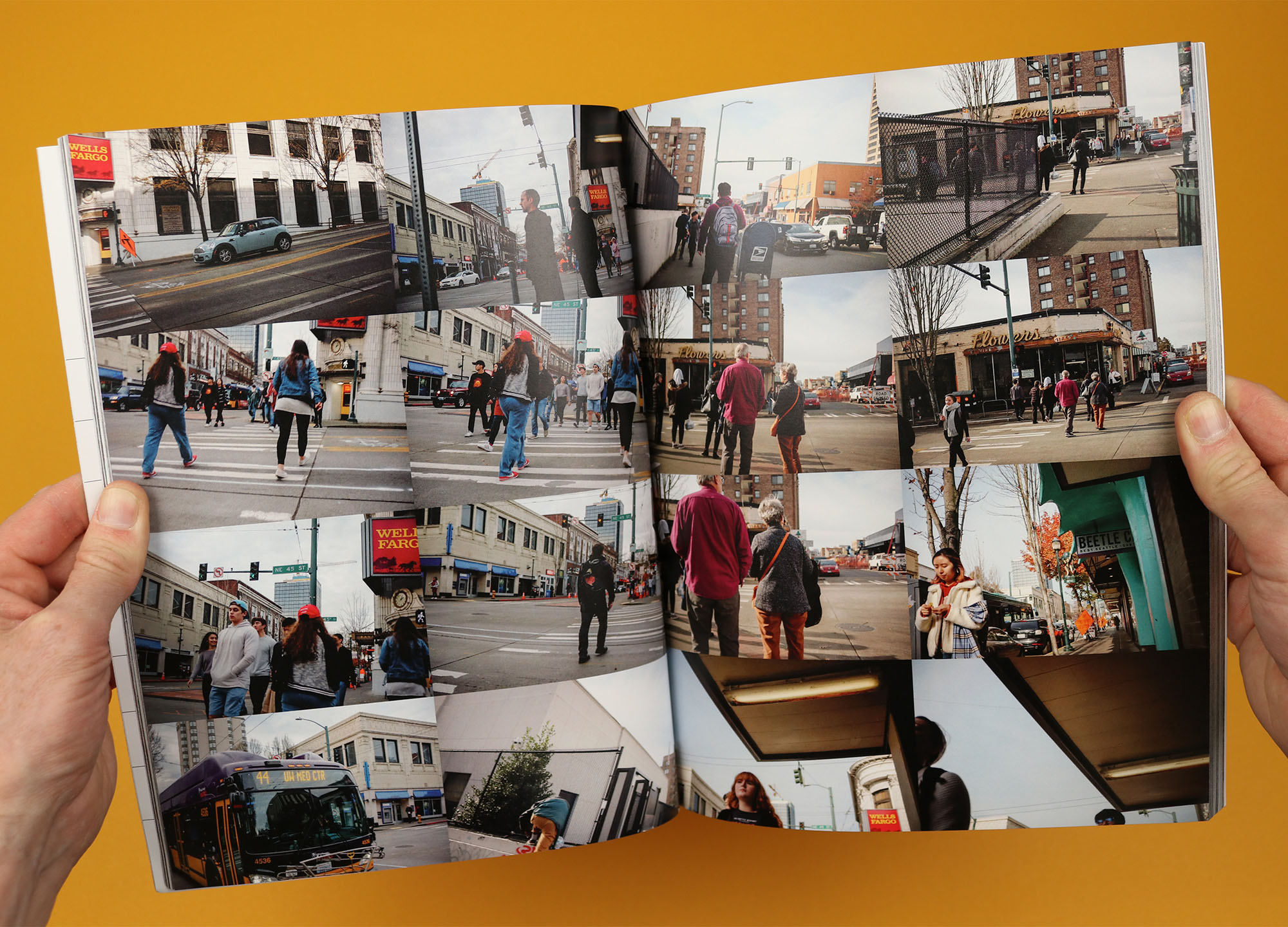 A one-off photo magazine, University District Seattle was created by photographer Casey Jacobson when she lived in the area at the end of 2019. The magazine takes readers around the streets of the University District, as she interviews locals and photographs the scenes she finds along the way, creating an image of a messy, chaotic but characterful neighbourhood. By contrast the contents page uses the clean, clear grid layout of the streets themselves to show where photographs were taken, giving the reader an extra layer of context and also emphasising the difference between looking at a neat map, and being lost in the landscape itself.