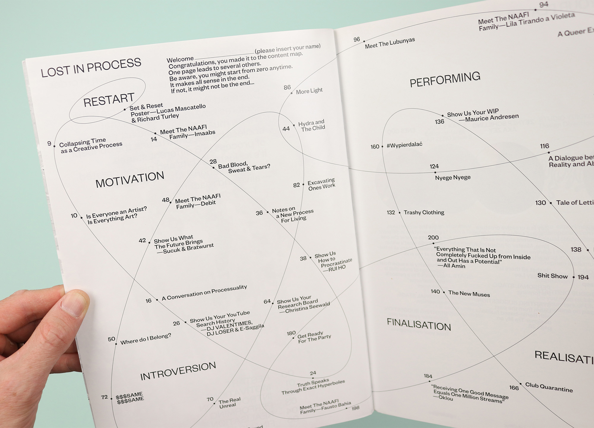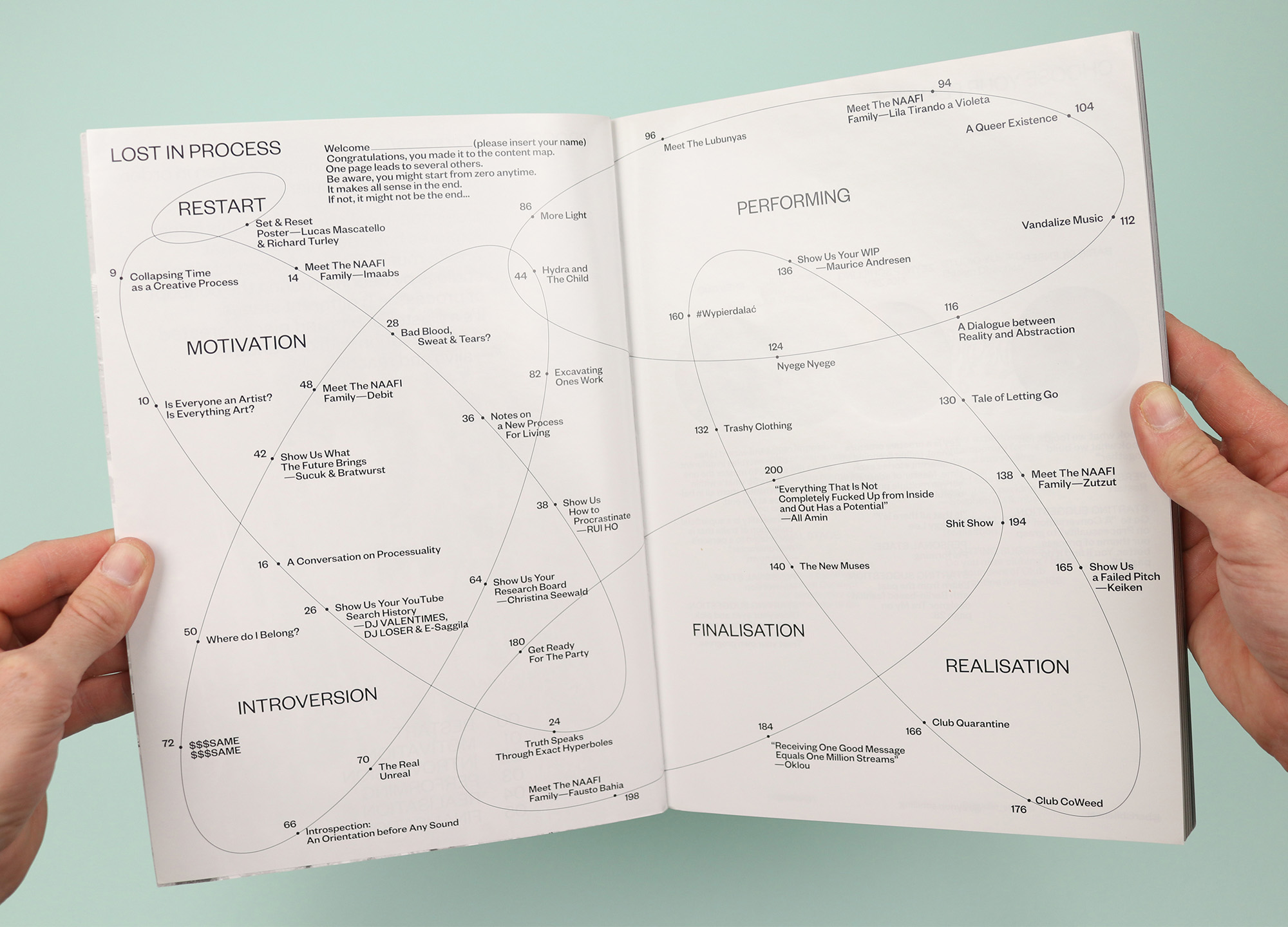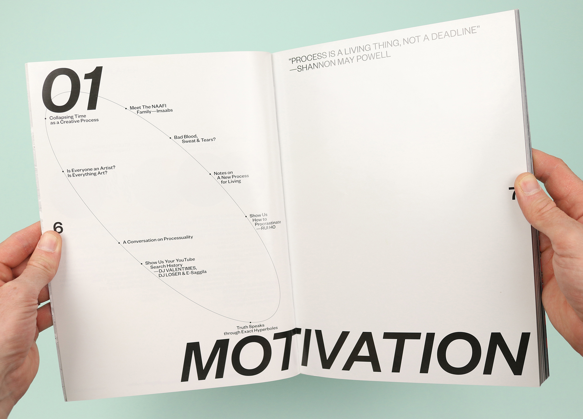 Published in Istanbul and designed in Berlin, Year Zero presented a hugely varied selection of underground music, fashion, art and more. This issue is themed around ‘process’, deconstructing the concept and breaking it into six stages that are visualised on the contents page as a sort of lunatic venn diagram, showing the places where the processes overlap one another. It’s surely not an accident that the interlinking ellipses are themselves suggestive of big zeros sprawling across the pages, and the message here is clear: There is no beginning and there is no end; there is just the process, so surrender yourself to it and see where it takes you. (In a further break from boring old front-to-back linear reading, each article finishes with a ‘choose your own adventure’ A/B selection, encouraging the reader to pick their way through the magazine, flipping forwards and back to jump from story to story.)