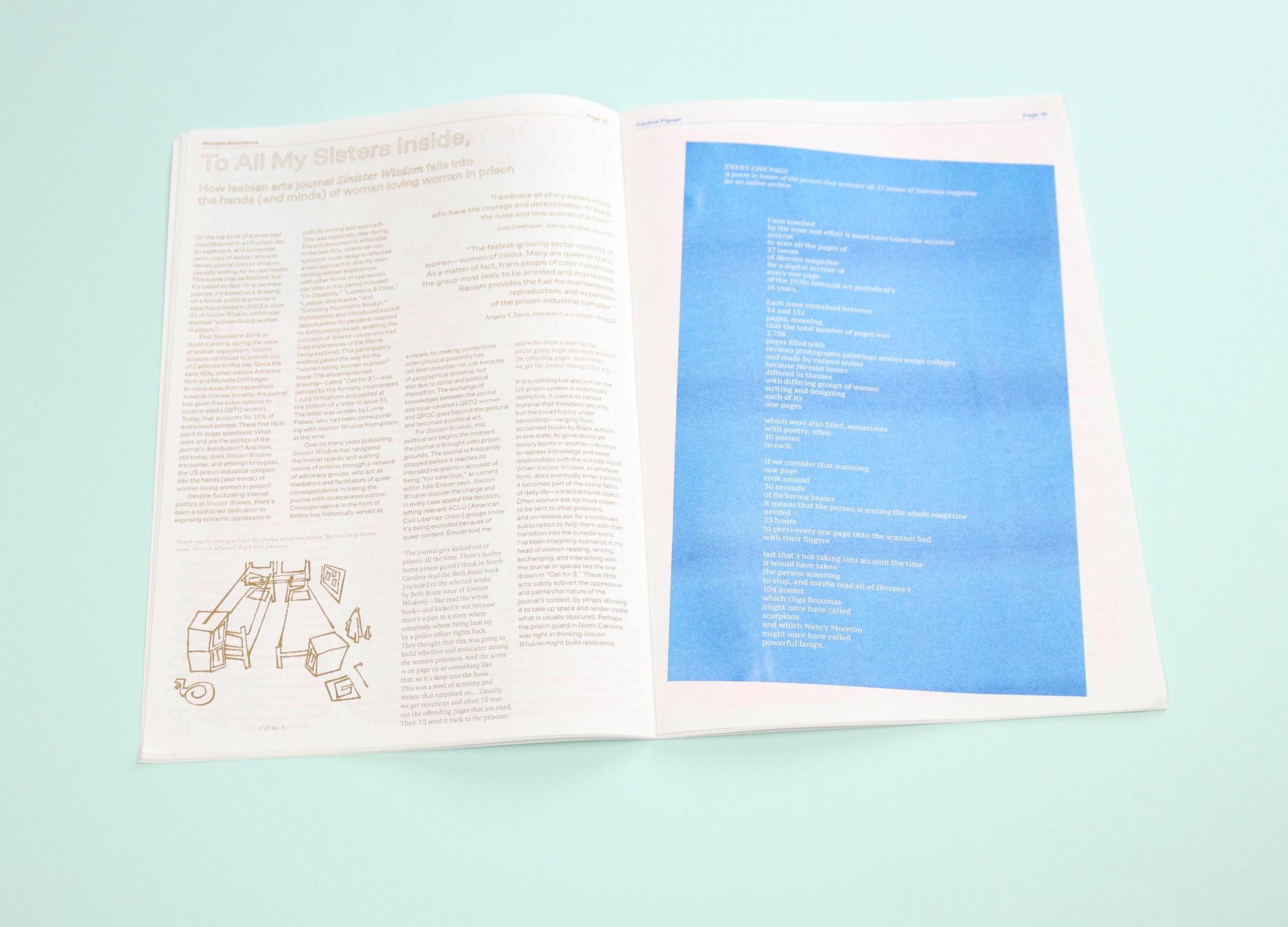 What I find more interesting is the question of how the journal finds its way back into prison after being initially kicked out by prison authorities because it is “too salacious” — when actually it is being excluded because of its queer content. I was fascinated by the tenacity of the editorship in these situations; Julie Enszer, the current editor, told me that Sinister Wisdom are constantly pushing back. The magazine’s team document the rejection notes they receive from the authorities and send them to advocacy groups, who then write letters back to the prison authorities to try to get Sinister Wisdom back in. Sometimes the team actually have to tear out passages of the magazine the authorities have deemed to contain “offending images” and send them back to incarcerated subscribers. Inside the prison, the journal becomes a transactional, desirable object that can be swapped in exchange for something else.