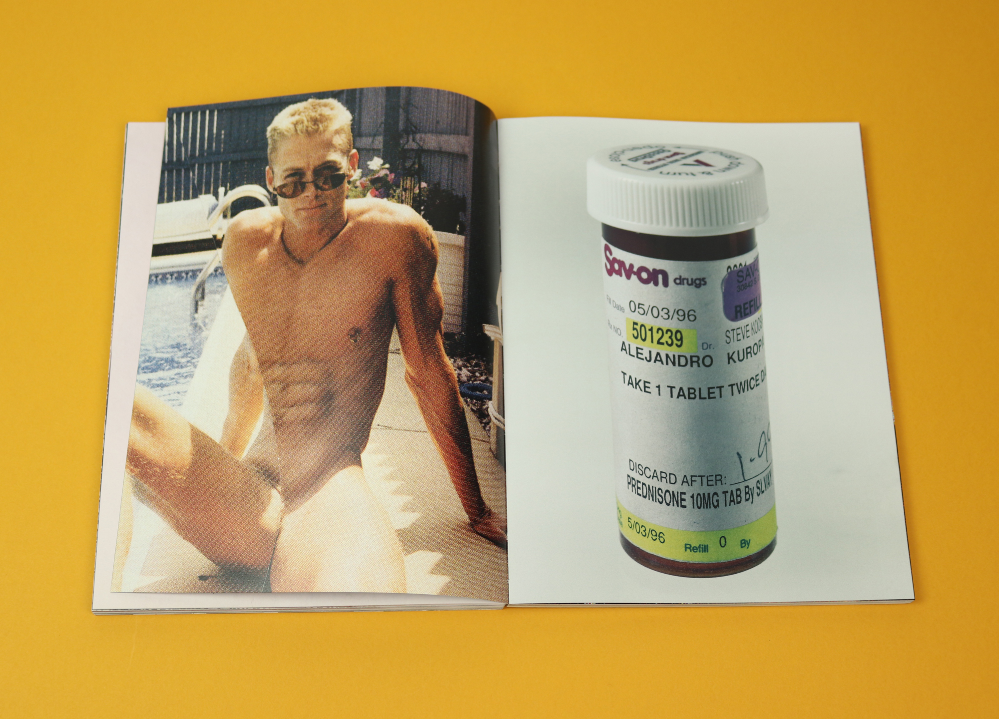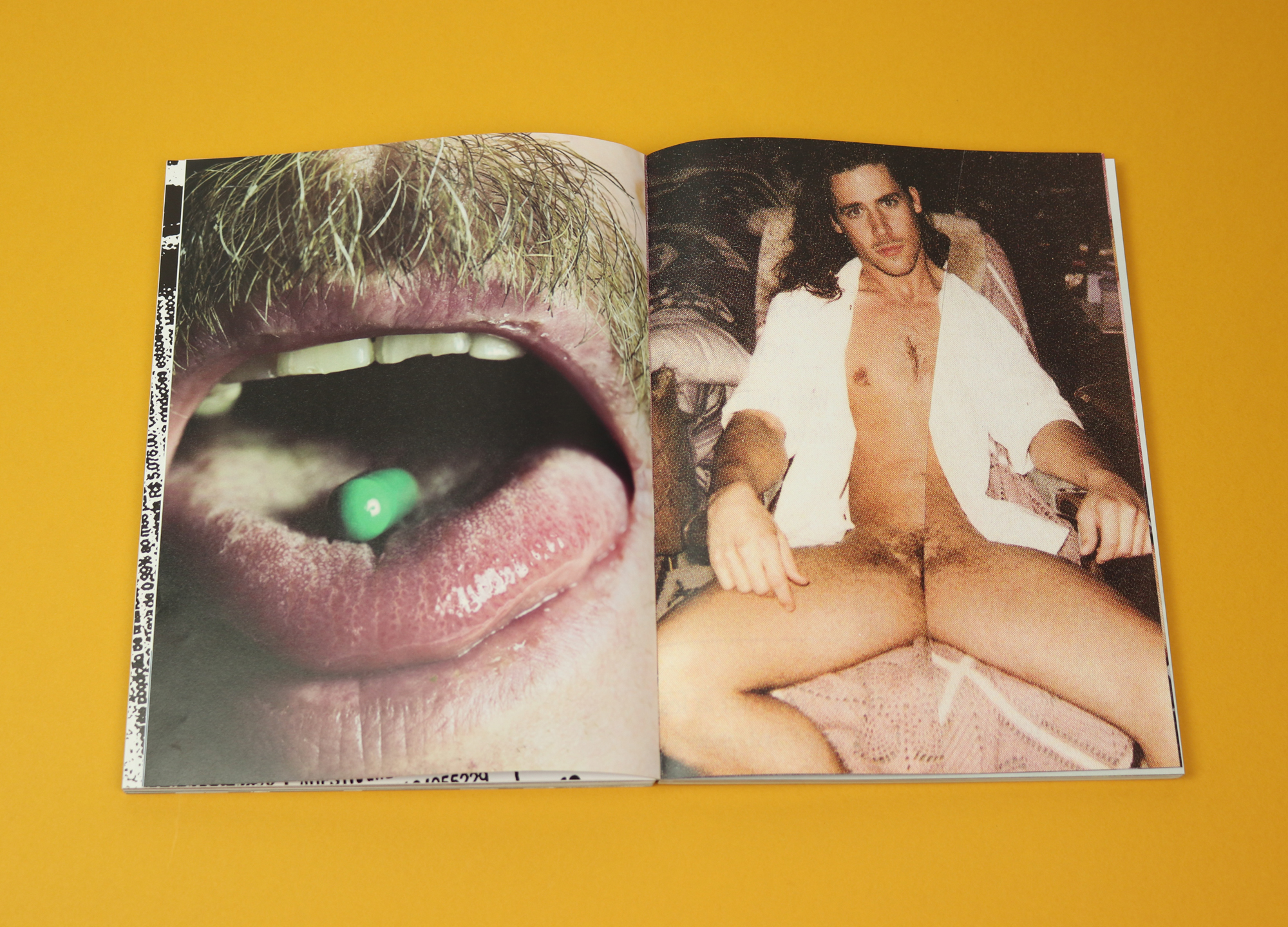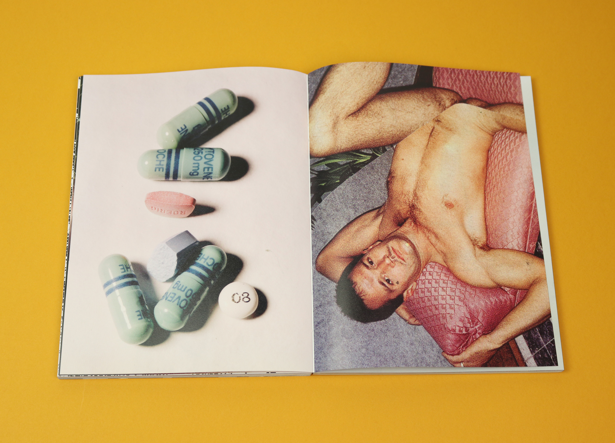 Initially, you assume both the pill images and the porno shots must have been taken by the same photographer, because there are no image credits. The lack of clear differentiation between photographs invites the viewer to make new, and sometimes frightening, connections. The organisational principle at work in the magazine is non-linear, and associative: it reminds me of the way fantasies themselves unfold, or nightmares.