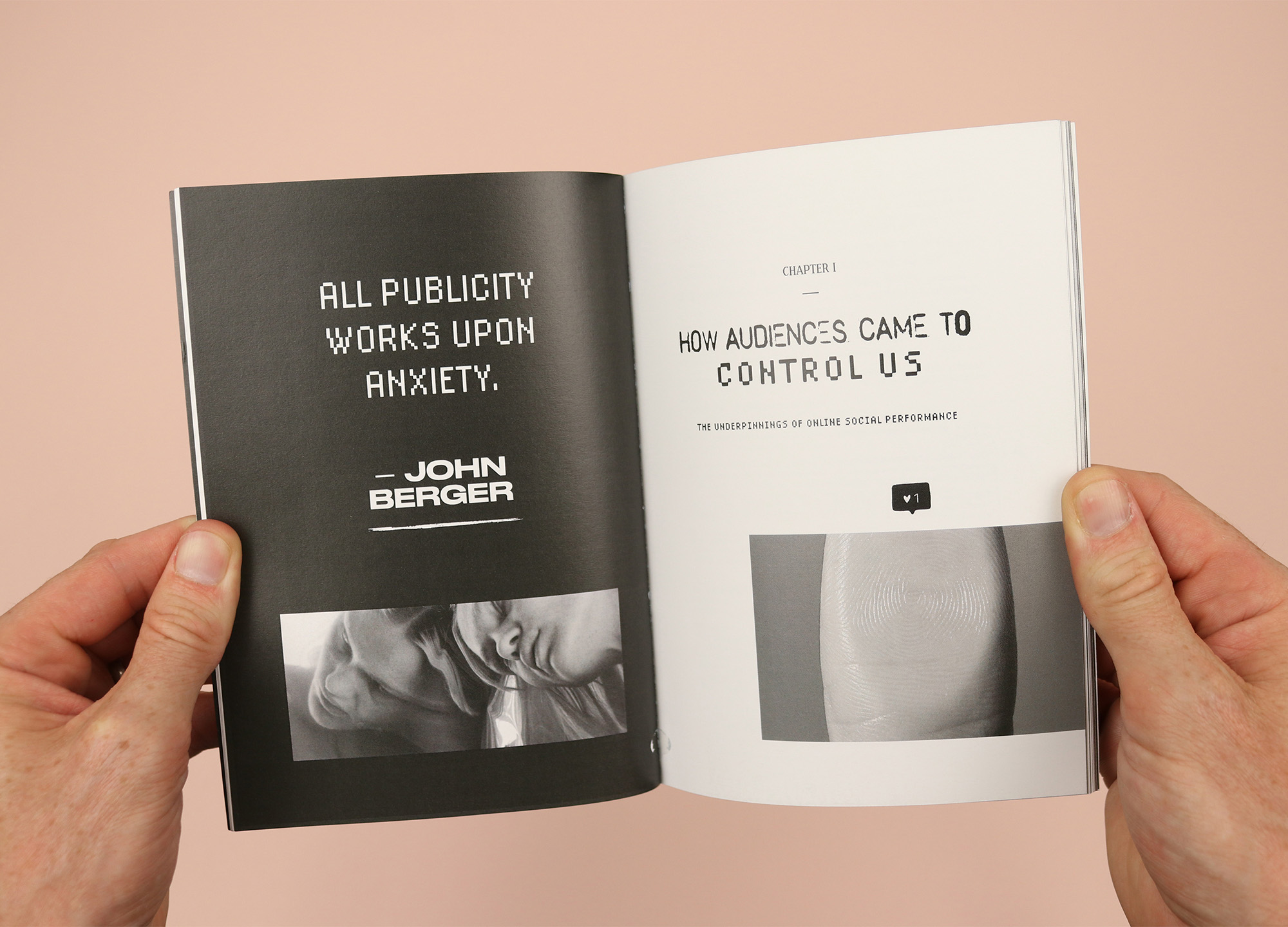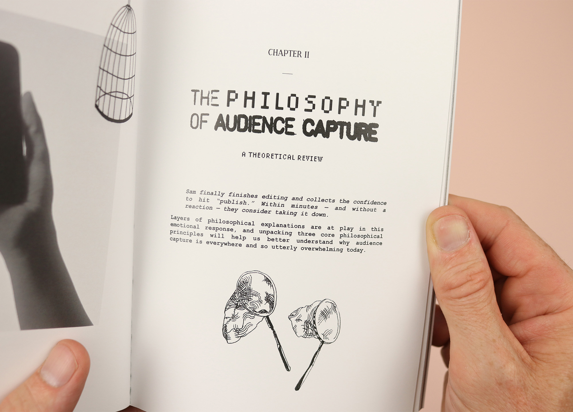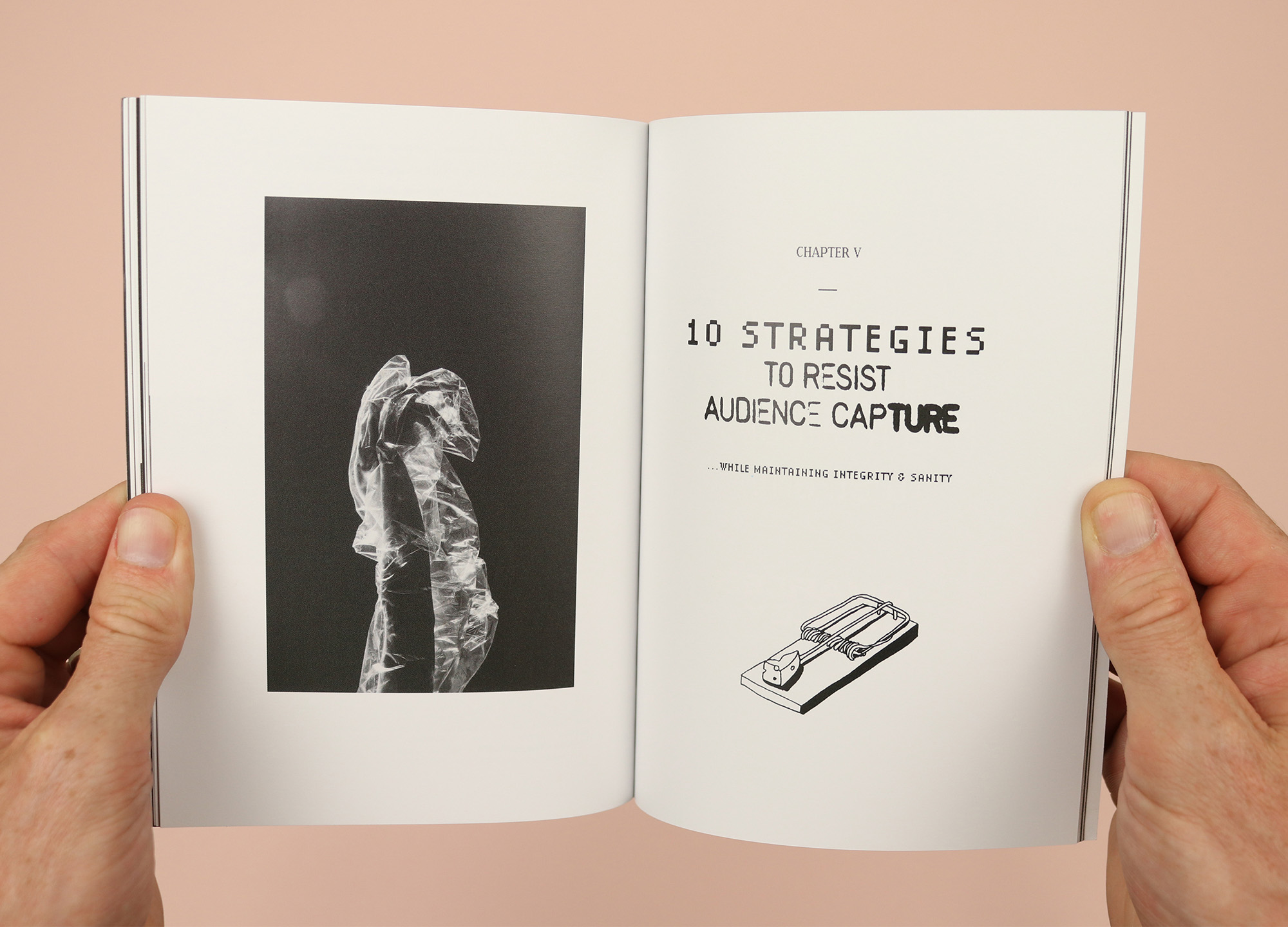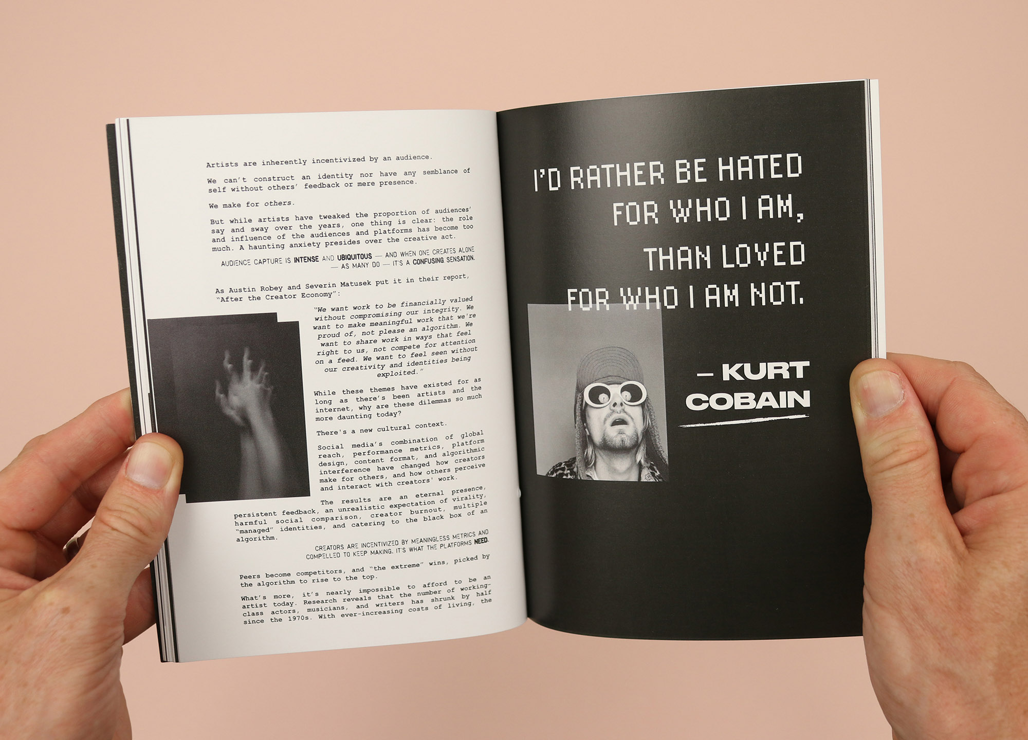 But then a couple of weeks ago an actual printed zine landed on my desk, made by Matt. It’s called Audience Capture, and it investigates the phenomenon of creators being controlled by their audiences. He cites the example of Nicholas Perry, who was, “once a vlogging, vegan violinist who couldn’t find an audience. But once Perry began uploading mukbang videos (eating for the camera and others) an audience gathered. Over time, the audience he fought for pushed him to eat more and more. He did. The views grew. But ultimately, while Perry found his millions of subscribers by binge-eating, he also became morbidly obese.”